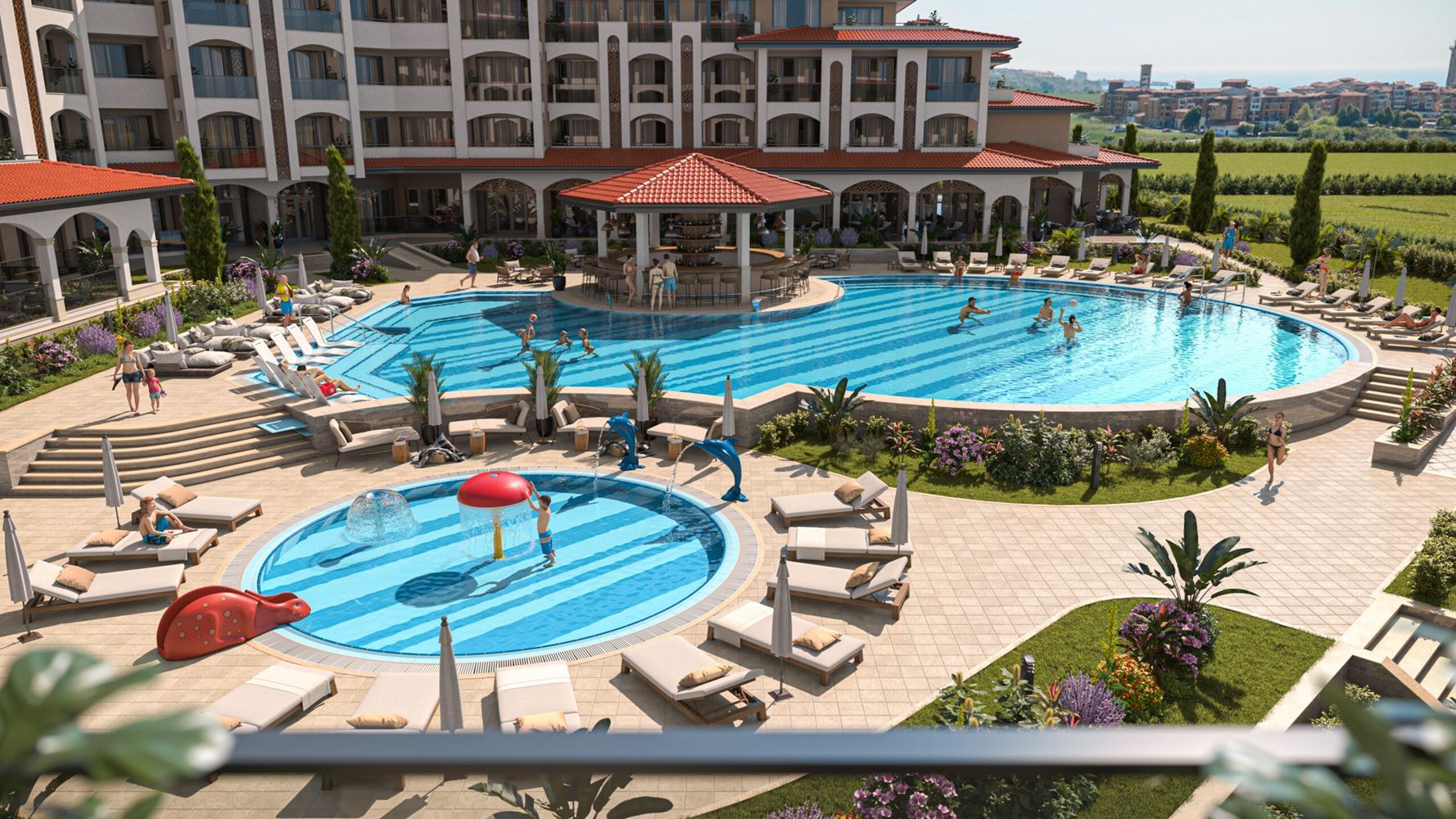 Residents and guests enjoy a swimming pool, modern fitness center, SPA area, and business meeting facilities, making the complex an ideal place for living, leisure, and work. The combination of residential, recreational, and business spaces creates a fully integrated concept for a modern seaside lifestyle.