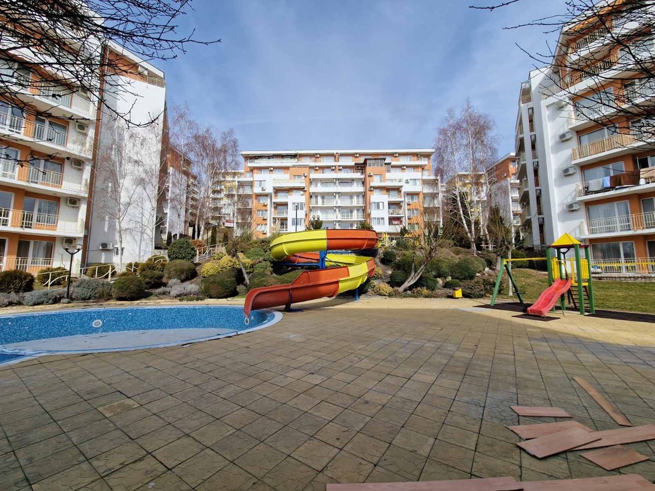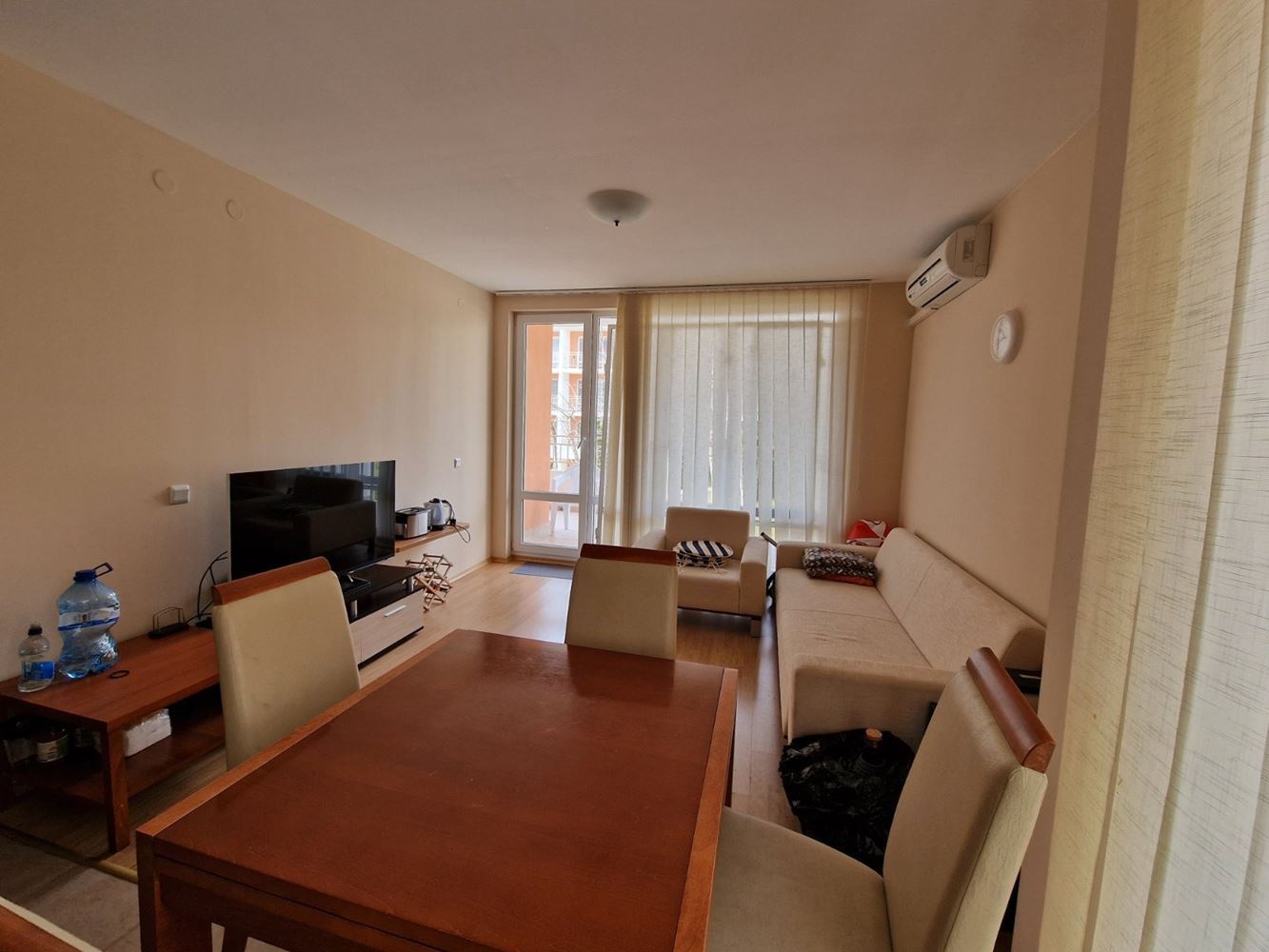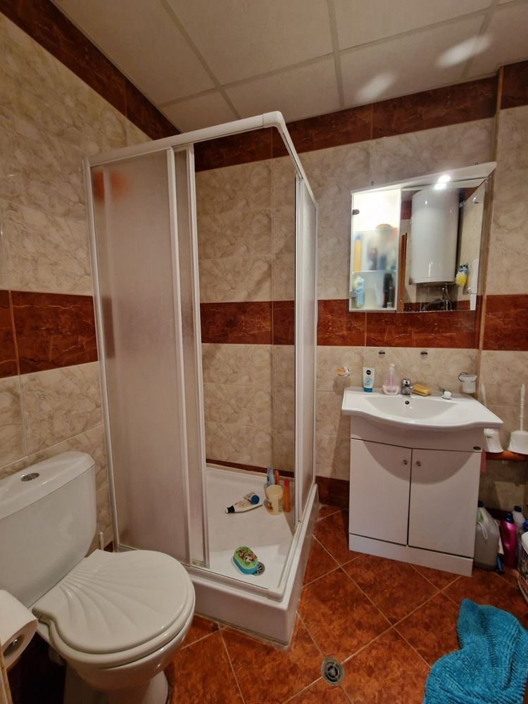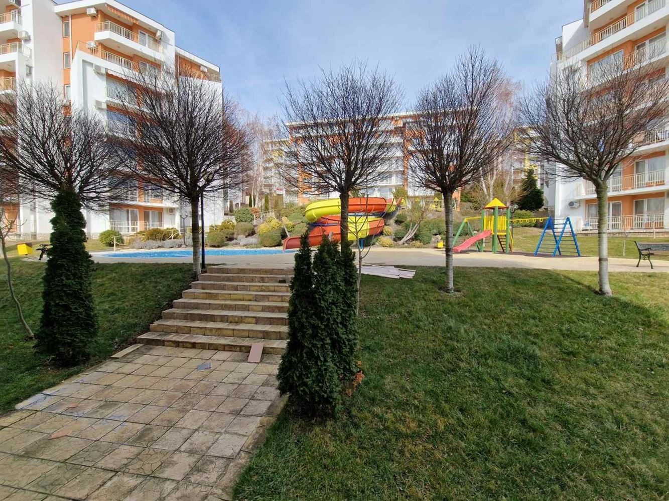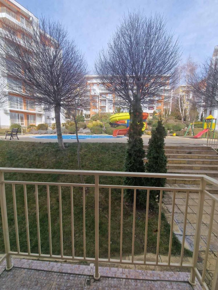 Practical two-bedroom apartment with mountain view in a gated complex in Sveti Vlas. The flat is located on the low ground floor and consists of an entrance hall, living room with kitchen area, two bedrooms, two balconies, bathroom with shower unit and separate WC. The flat is fully furnished and equipped with all necessary appliances including air conditioning. There is 24 hour security. Diverse infrastructure with many swimming pools, tennis courts, spa area, restaurants, cafes, shops and beauty salons, playgrounds and sports grounds, a huge well-groomed area with a variety of flowers, shrubs and trees. There is parking for cars.