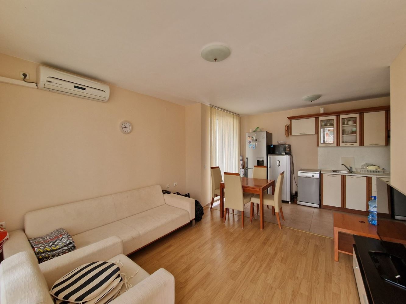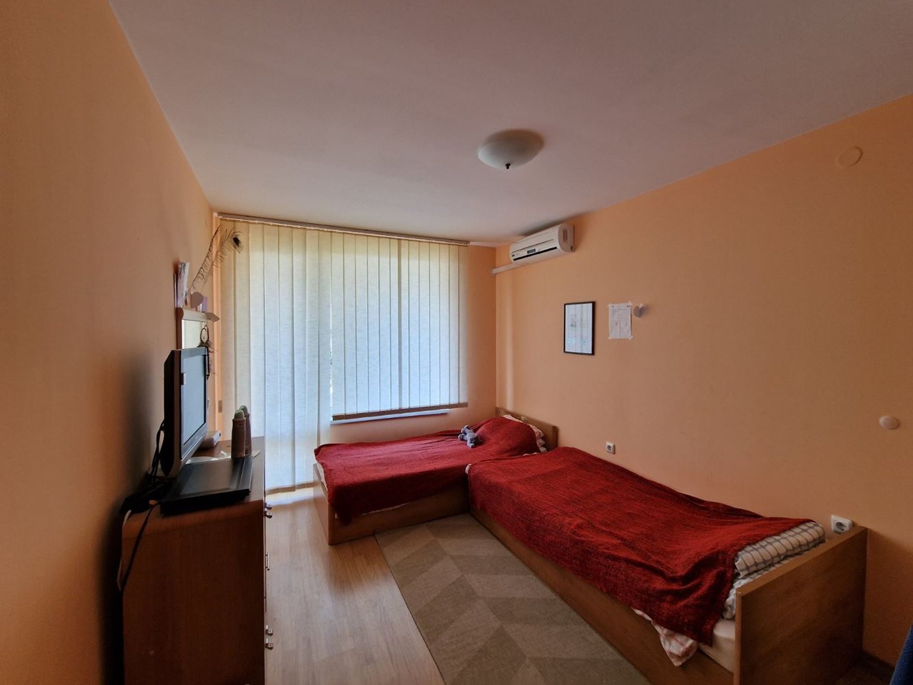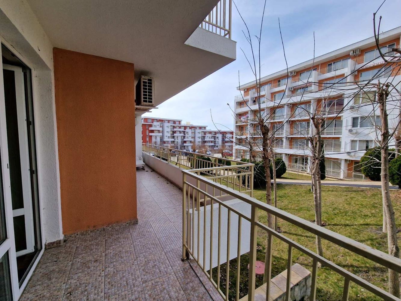 Practical two-bedroom apartment with mountain view in a gated complex in Sveti Vlas. The flat is located on the low ground floor and consists of an entrance hall, living room with kitchen area, two bedrooms, two balconies, bathroom with shower unit and separate WC. The flat is fully furnished and equipped with all necessary appliances including air conditioning. There is 24 hour security. Diverse infrastructure with many swimming pools, tennis courts, spa area, restaurants, cafes, shops and beauty salons, playgrounds and sports grounds, a huge well-groomed area with a variety of flowers, shrubs and trees. There is parking for cars.