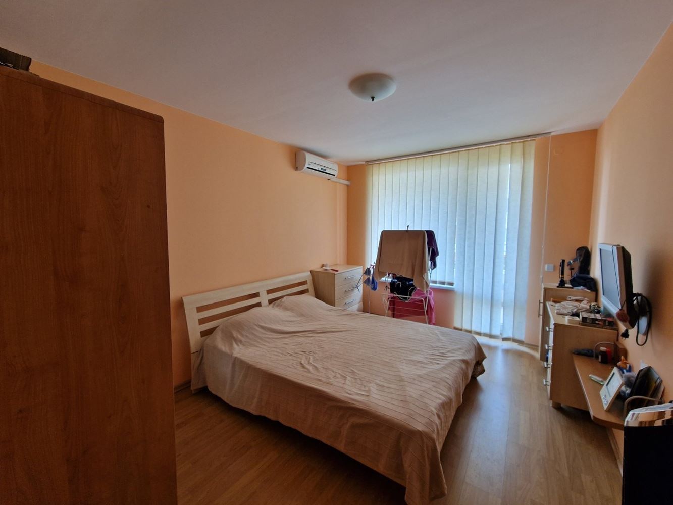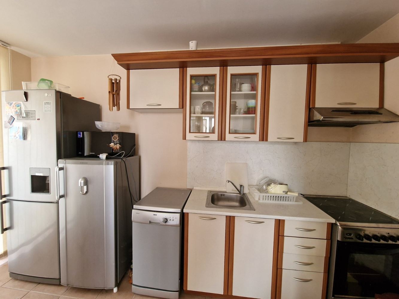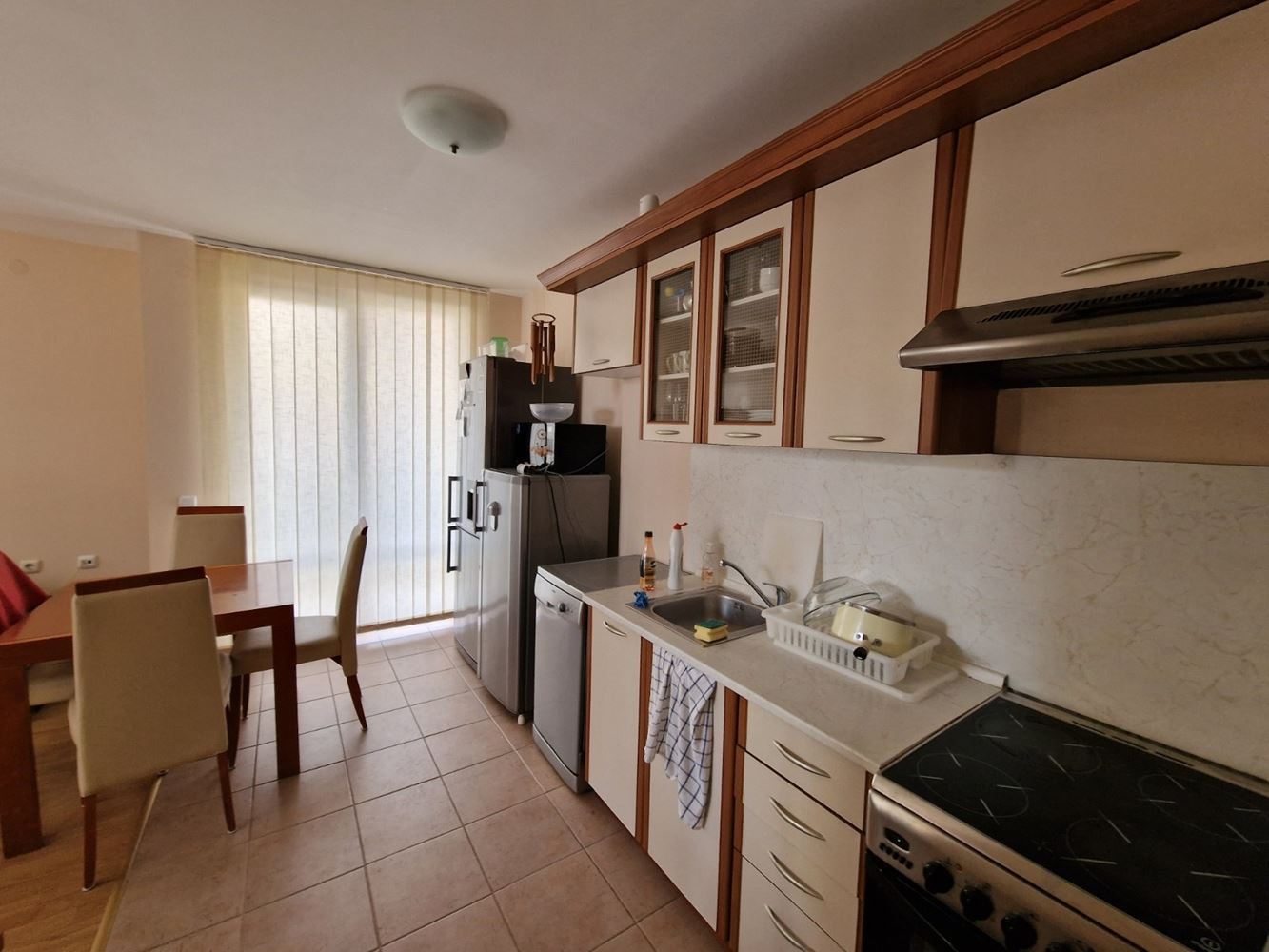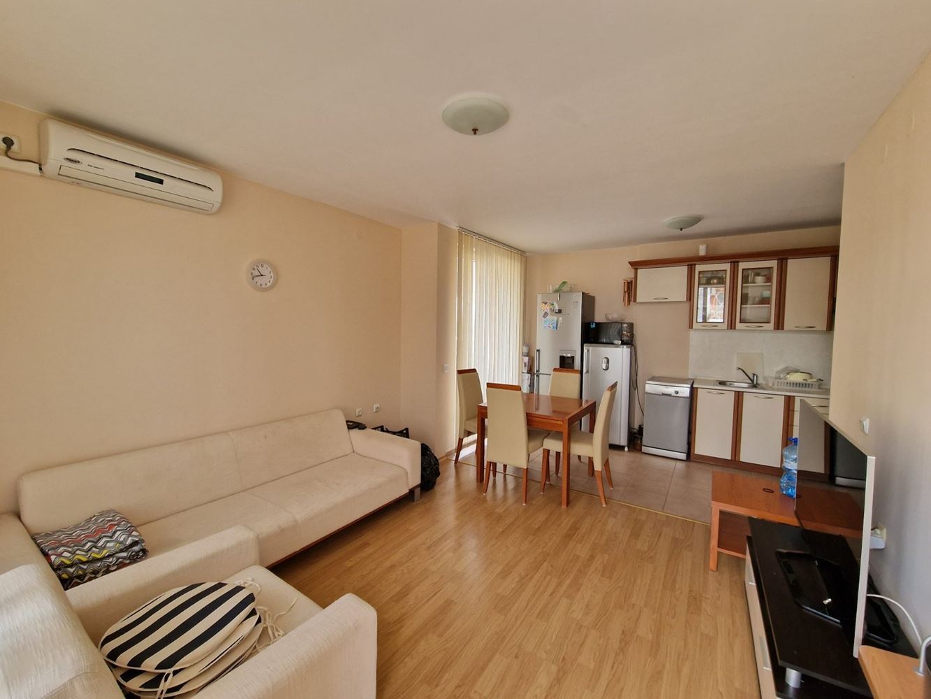 Practical two-bedroom apartment with mountain view in a gated complex in Sveti Vlas. The flat is located on the low ground floor and consists of an entrance hall, living room with kitchen area, two bedrooms, two balconies, bathroom with shower unit and separate WC. The flat is fully furnished and equipped with all necessary appliances including air conditioning. There is 24 hour security. Diverse infrastructure with many swimming pools, tennis courts, spa area, restaurants, cafes, shops and beauty salons, playgrounds and sports grounds, a huge well-groomed area with a variety of flowers, shrubs and trees. There is parking for cars.