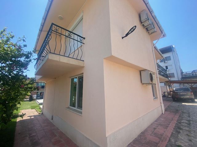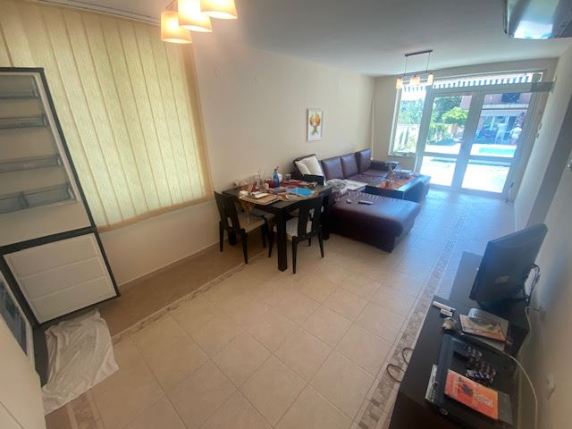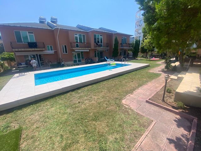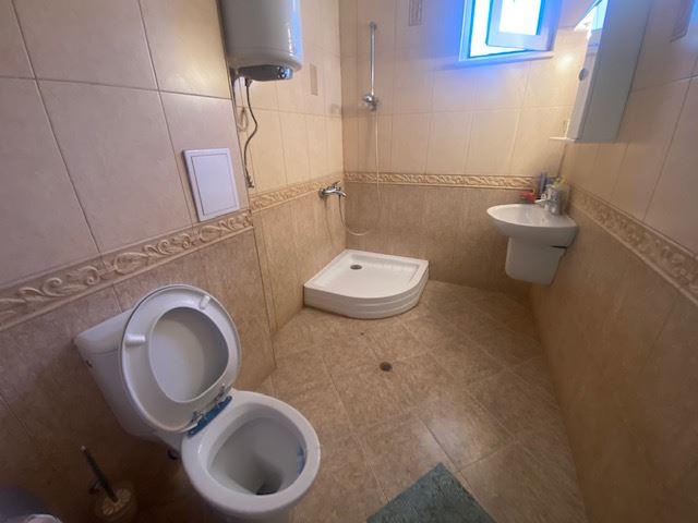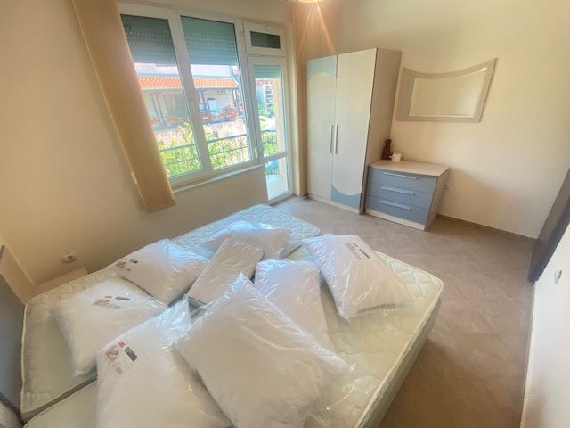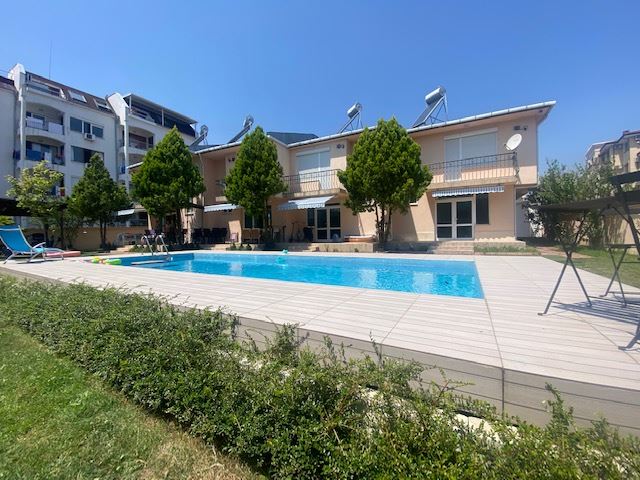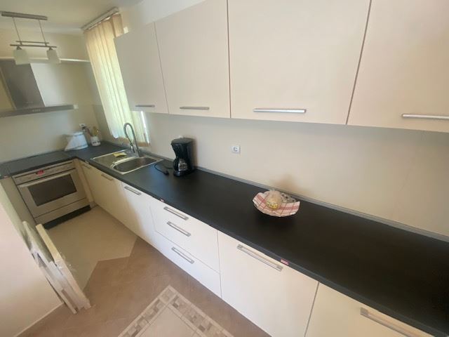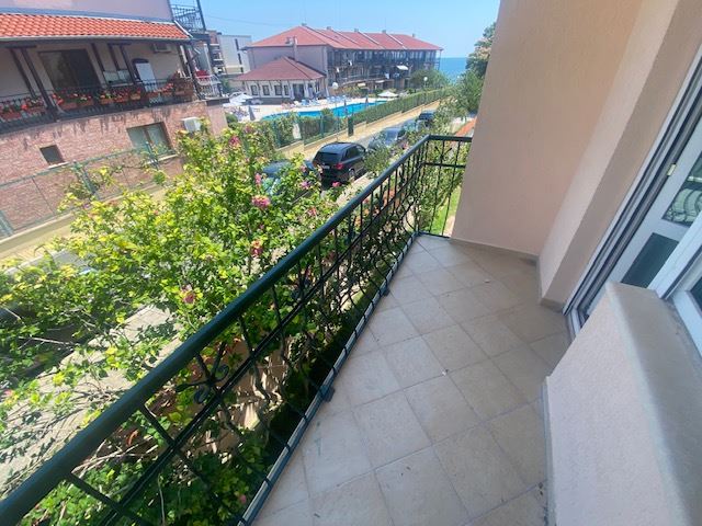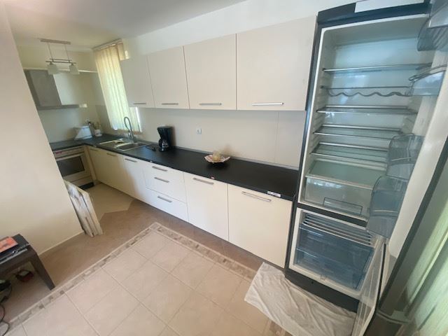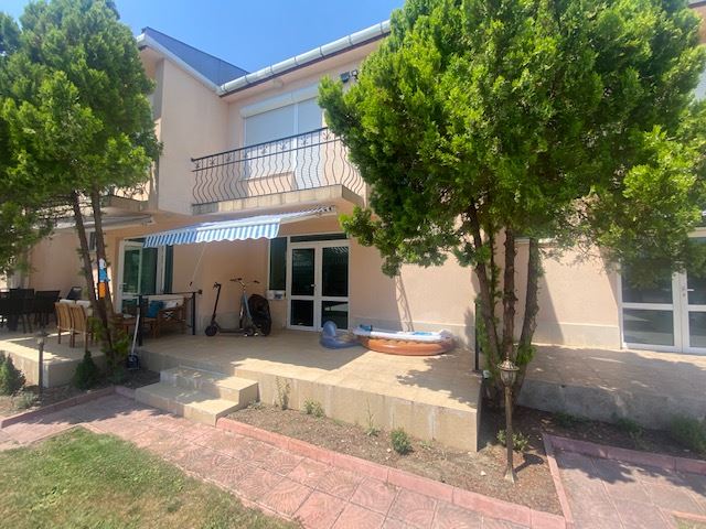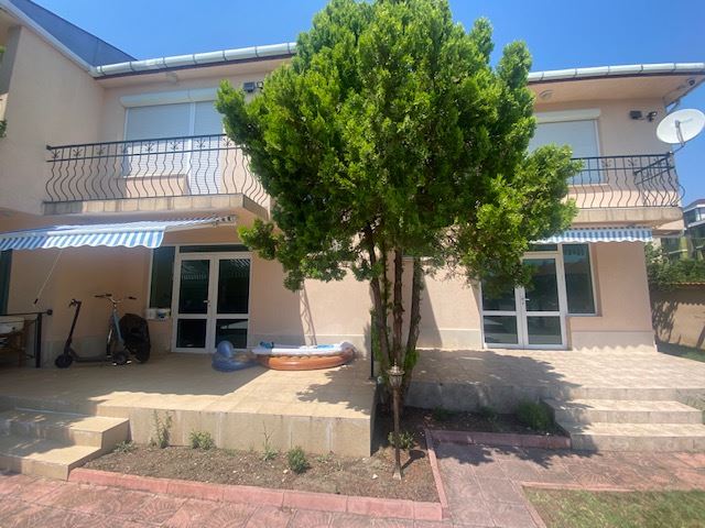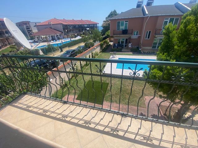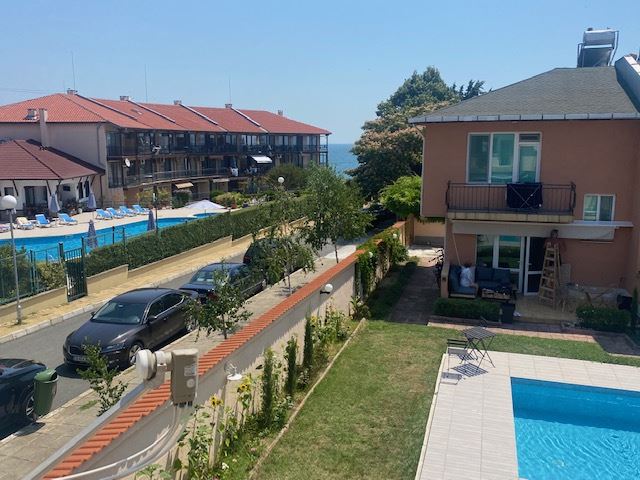 Private house with sea view in the small seaside town of Ravda. The house has two floors, total area 117 m2 and consists of: entrance hall, very bright and spacious living room with dining area and kitchen, bathroom, toilet, storage / laundry room and veranda with direct access to the yard, as well as stairs to the first floor. On the first floor there are two bedrooms, a bathroom and two balconies. The house is fully furnished and ready to move in. The fenced plot with similar houses has a swimming pool, parking space, barbecue area with seating area. No maintenance fees.