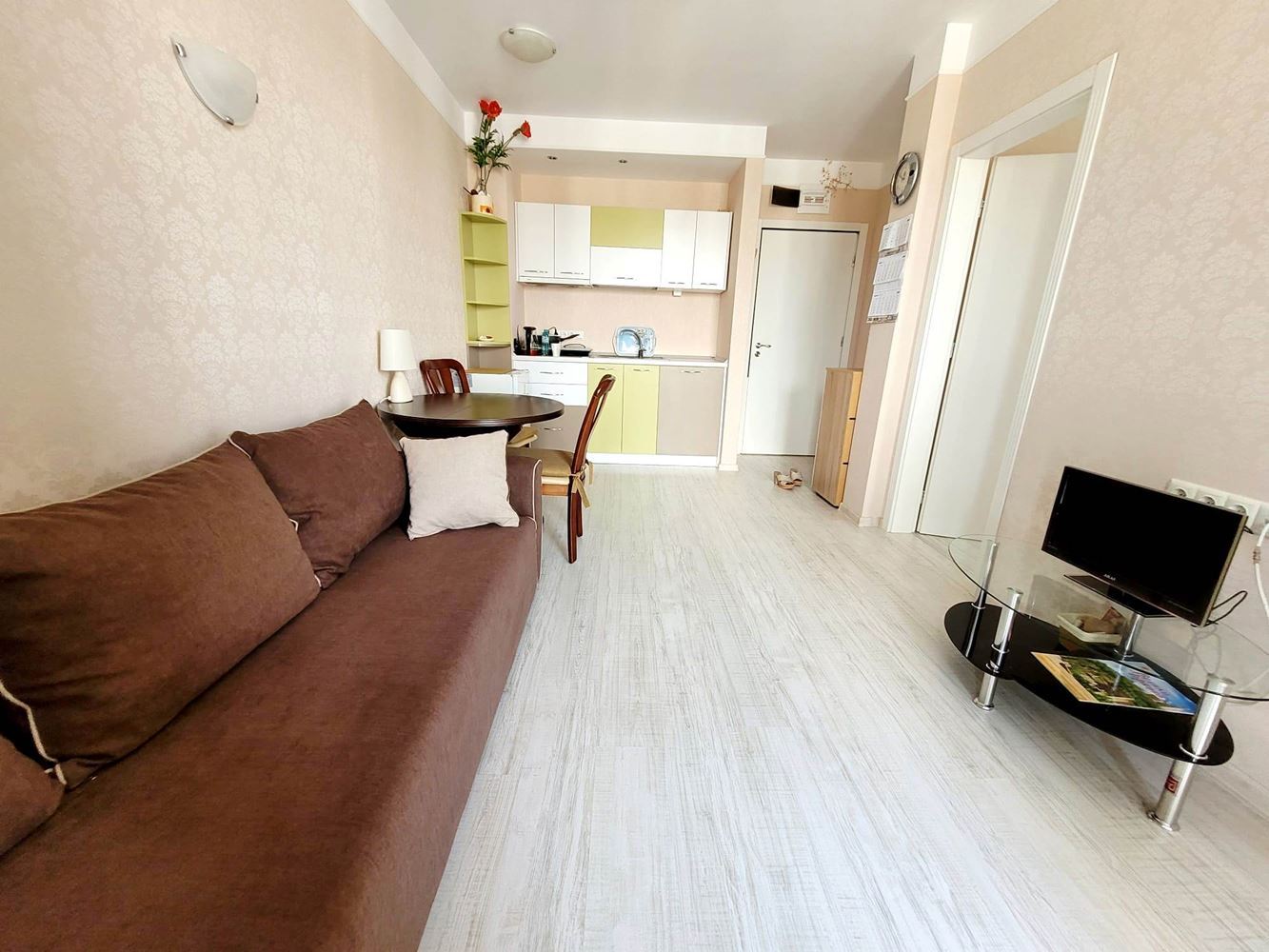 One bedroom stylish apartment in a luxury complex in the resort of Sunny Beach. The complex is known for its quality and beauty as well as the Mediterranean architecture. A beautiful thirty metre swimming pool, green park, children's entertainment. The complex can be used all the year round and is under security and video surveillance. The flat of 53 m2 we offer for sale consists of entrance hall, living room with kitchen area, bedroom, bathroom with WC and terrace. It is beautifully furnished and has all the necessary appliances. All in excellent condition. Great option for summer holidays, permanent residence or for renting.