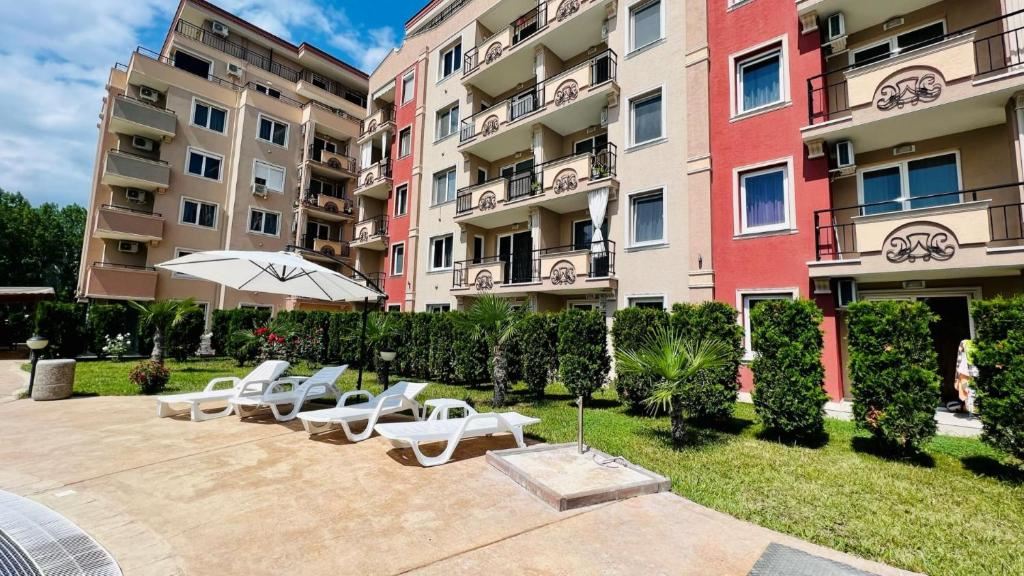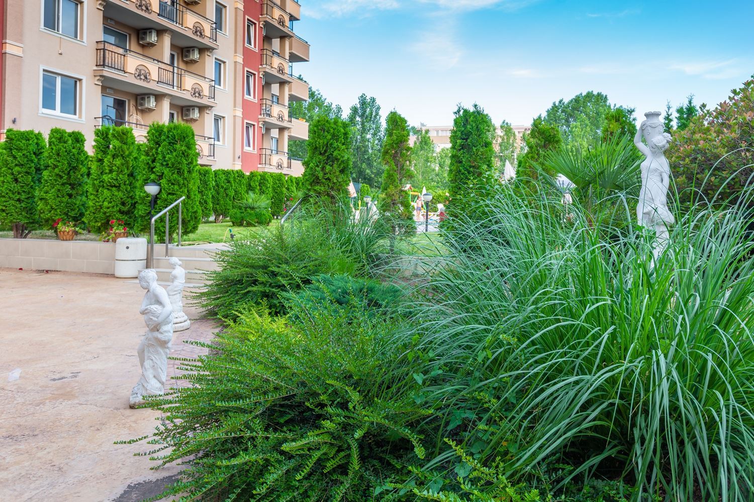 The complex is set in a peaceful and green area of the resort, with landscaped alleys and relaxation zones. Residents enjoy excellent amenities: a large swimming pool, sunbathing and relaxation area, children’s playground, and parking. The gated territory with controlled access and 24/7 security ensures safety and peace of mind for you and your family. The location offers quietness and privacy while keeping you close to the vibrant resort life and its seasonal conveniences.