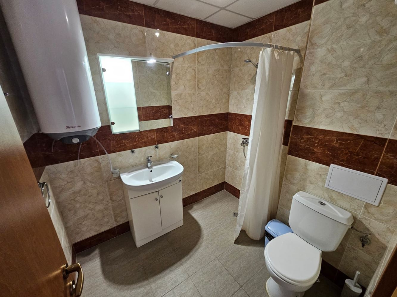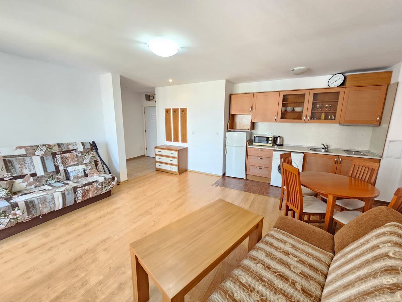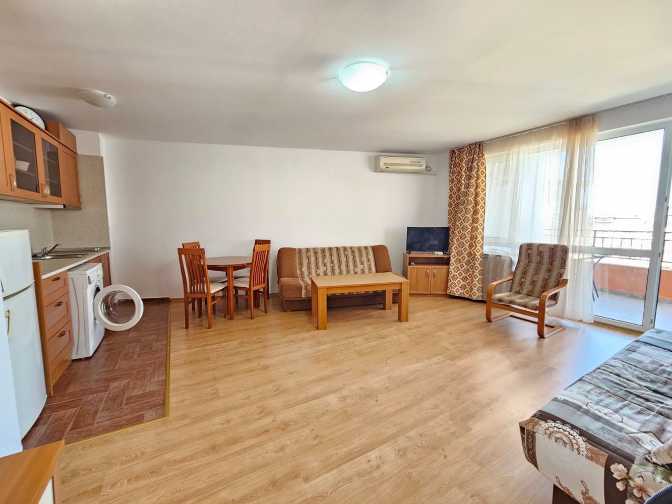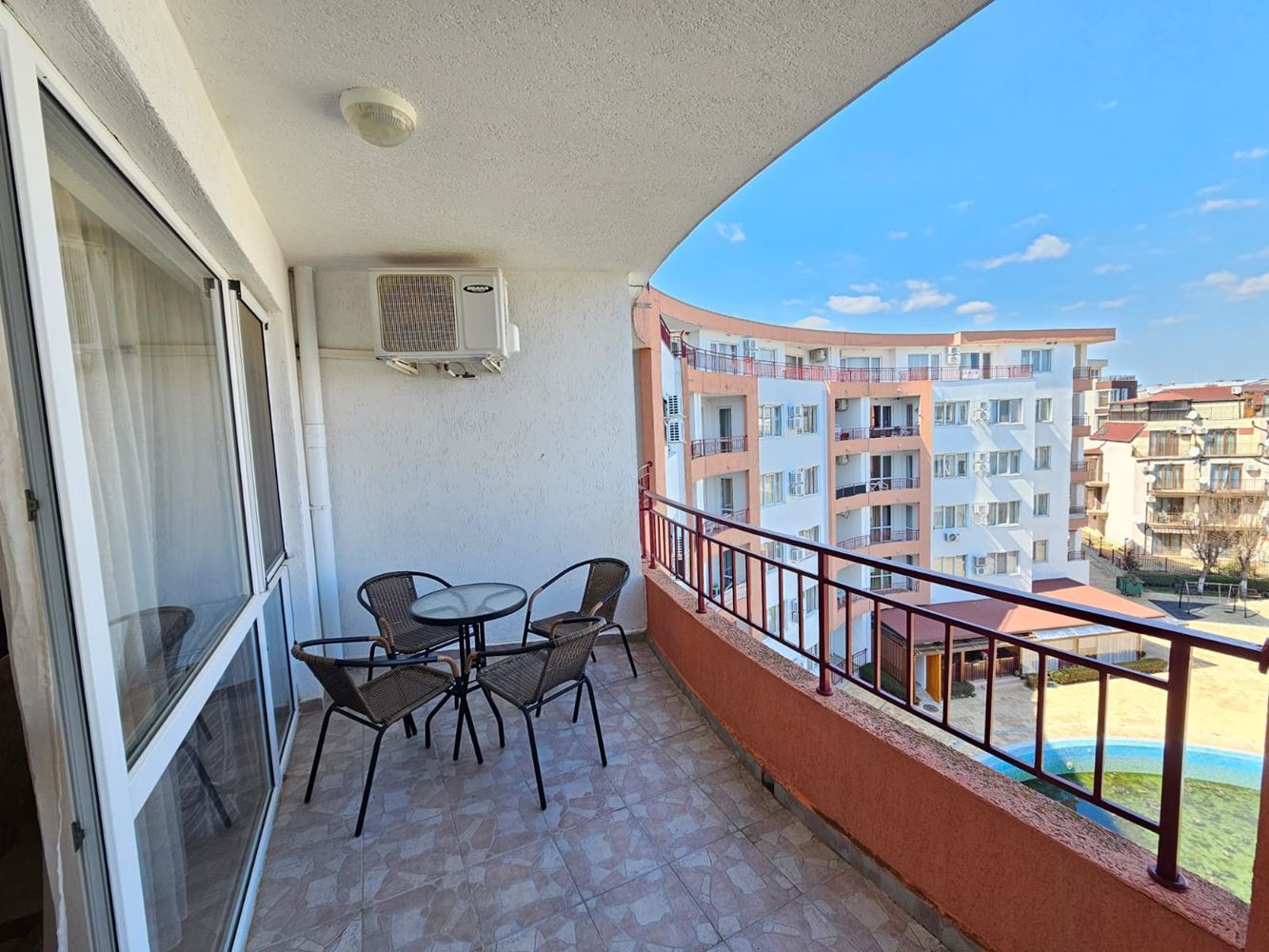 Fully furnished one-bedroom apartment with sea and pool views, located right on the seafront in Ravda, is a true paradise for beach lovers. Situated on the fifth floor, with a total area of 78.29 m², the apartment is ready for immediate occupancy. Upon entering, you will instantly feel its comfort and coziness. The spacious living room with a kitchen provides a perfect place for family gatherings or evenings with friends. The stylish interior and modern furniture add charm to this space. The bedroom is designed with your comfort and peaceful sleep in mind, while the bathroom is fully equipped. A highlight of this property is the large terrace – the perfect spot to spend quality time with your loved ones.