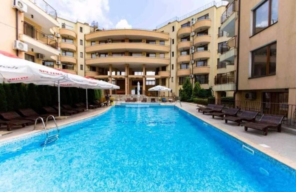 The complex offers a number of amenities: well-maintained green areas, a swimming pool, a spa center for relaxation, a playground for the little ones, and a restaurant with a variety of culinary delights. For your security, there is permanent security, and the convenient parking lot ensures hassle-free parking. The presence of a hypermarket and a public transport stop near the complex complement the amenities of the location.