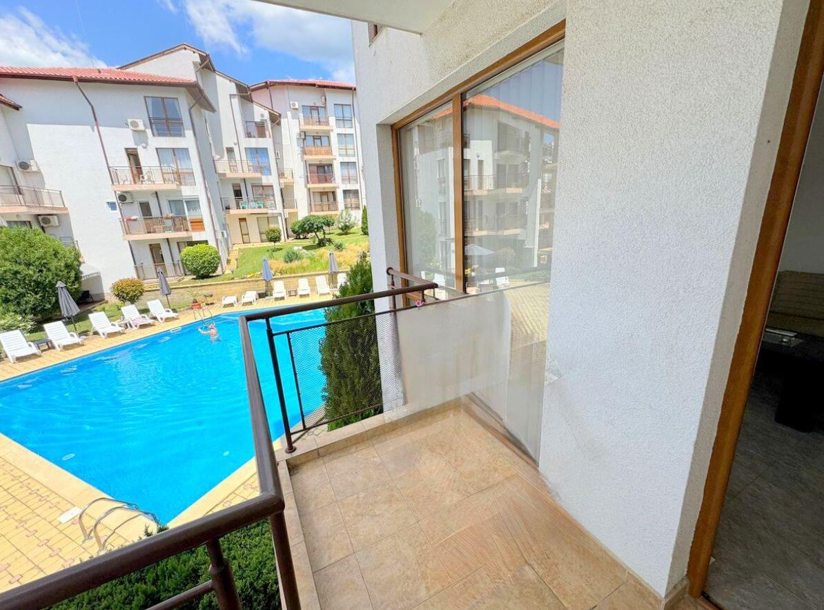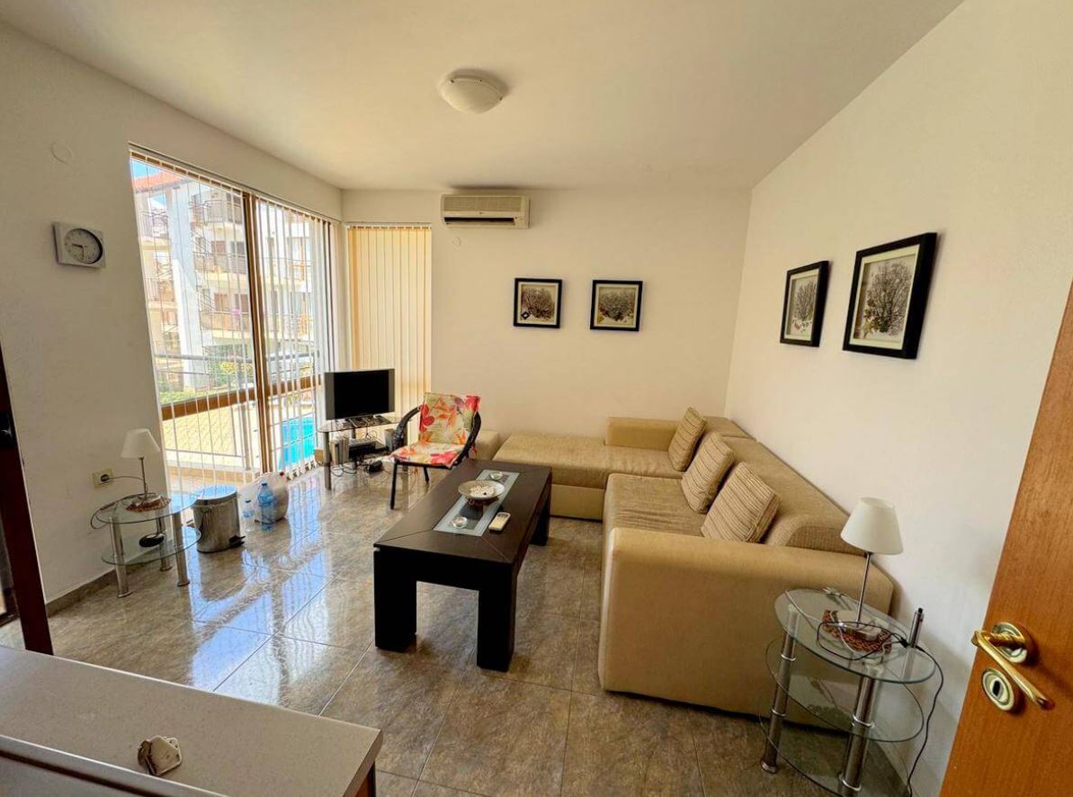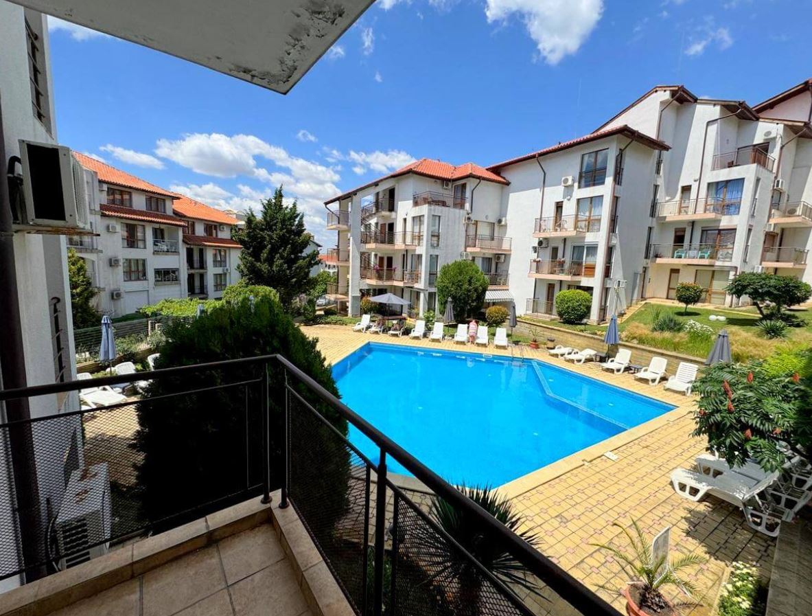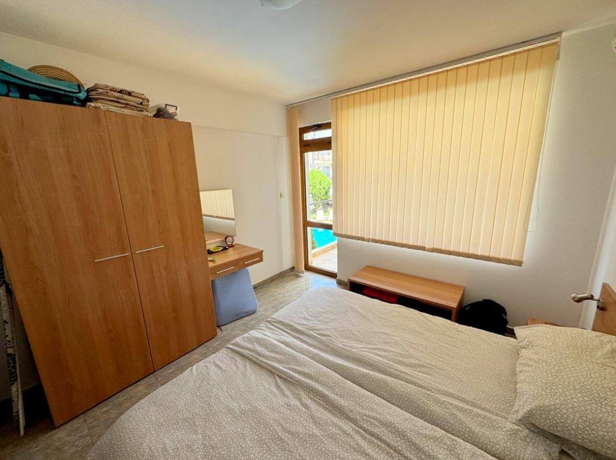 We present you an opportunity for investment or personal use - one bedroom apartment with magnificent pool view in the prestigious resort town of Sveti Vlas. Located on the second floor, this property with a total area of 60 m² offers comfort and coziness just a few meters from the beach. The apartment includes two spacious rooms - a bright and welcoming living room with dining area and fully equipped kitchen, as well as a cozy bedroom. From the balcony you will enjoy a wonderful view of the luxurious outdoor swimming pool and sunbathing terrace with sun loungers at your disposal.