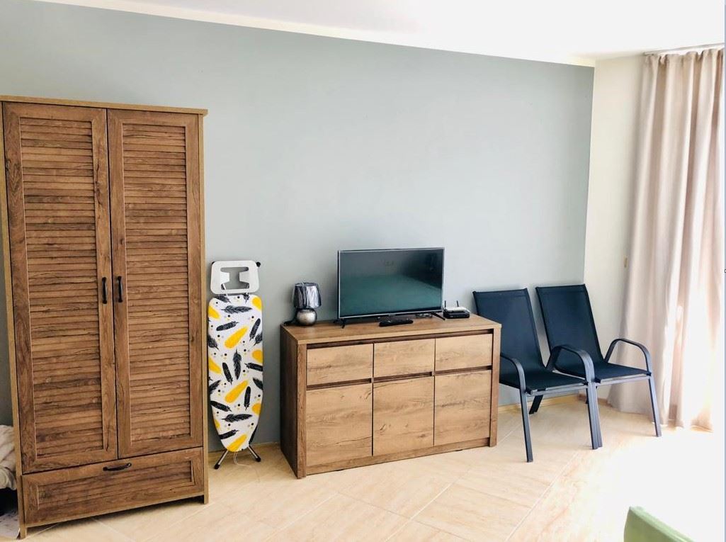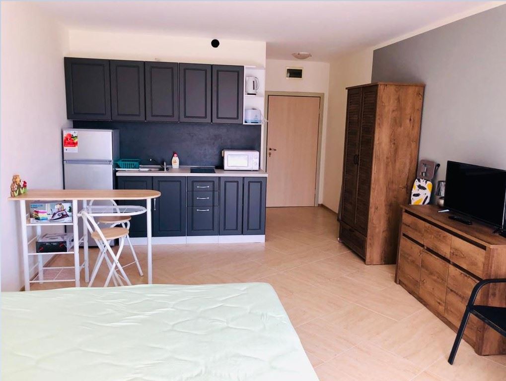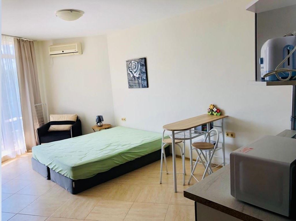 The complex in which the studio is located is favourably situated in a quiet location, offering privacy and tranquillity against the backdrop of the bustling city. At the same time it is easily accessible and close to popular tourist destinations such as Pomorie, Sunny Beach and Nessebar. The spacious area of the complex outside the city districts creates a feeling of natural harmony. The complex has everything you need for relaxing and living: restaurant, bar, large swimming pools for adults and children, beach, playgrounds, gym and even a spa.