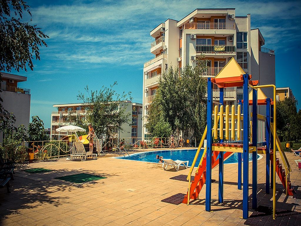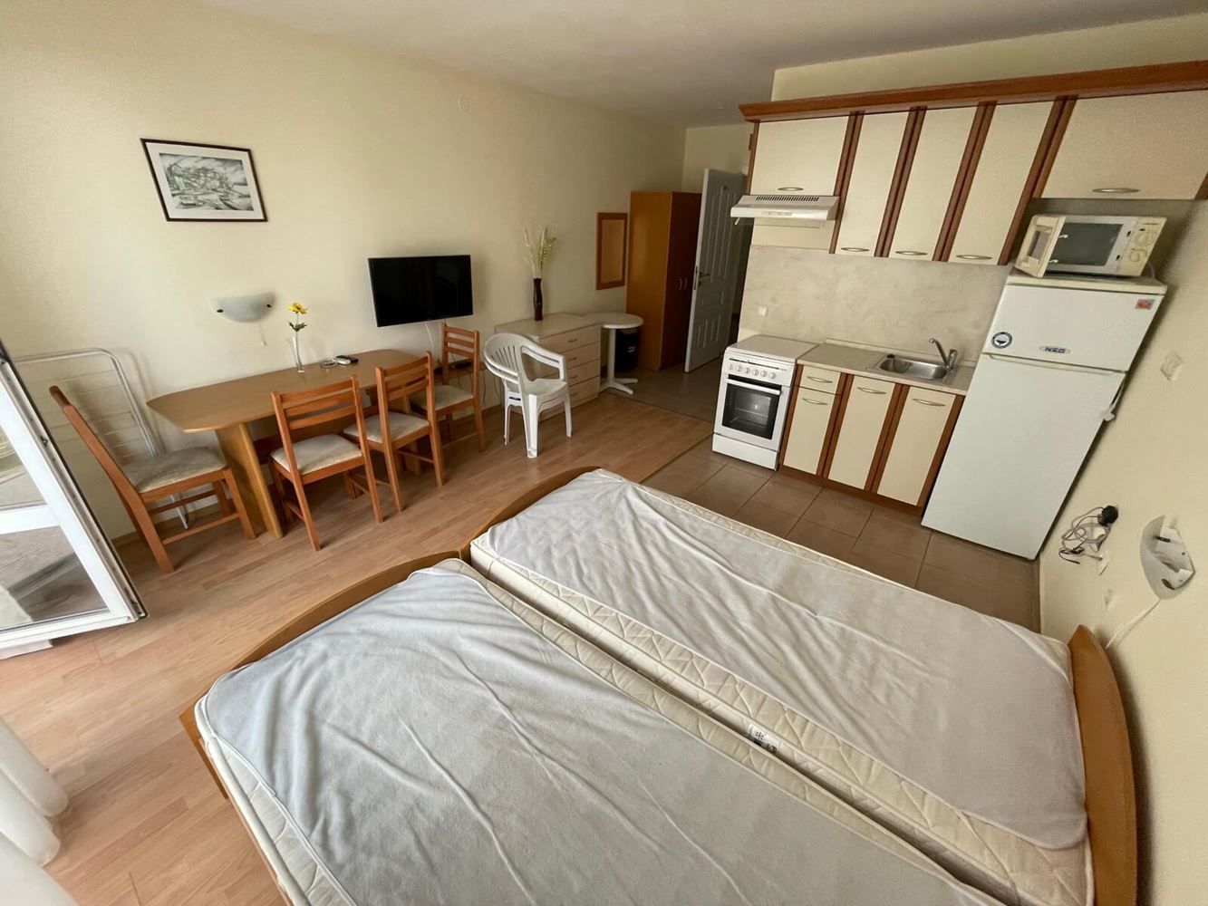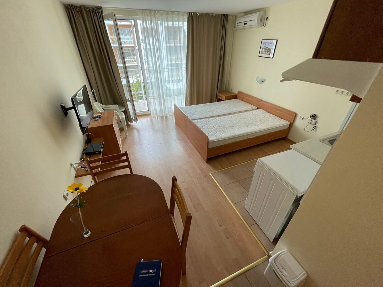 Excellent studio flat with sea view in the complex on the second line. The complex is located in a picturesque area in the resort town of Sveti Vlas. It is a beautiful area with magnificent views of the sea and the mountains. The complex has all the necessary infrastructure, working bar and confectionery, restaurants, grocery shops, shop for beach accessories, fitness room, sauna, internet club, spa and hamam, children's club, playground, hairdresser, massage, medical centre, exchange office, parking, travel agency, 18 pools, tennis courts, security and more. The flat is located on the third floor of the building. The flat has an area of 40 m2 and consists of a spacious room with kitchen and sitting area, bathroom with WC and a nice balcony. There is a sea view. The flat is fully furnished and equipped.