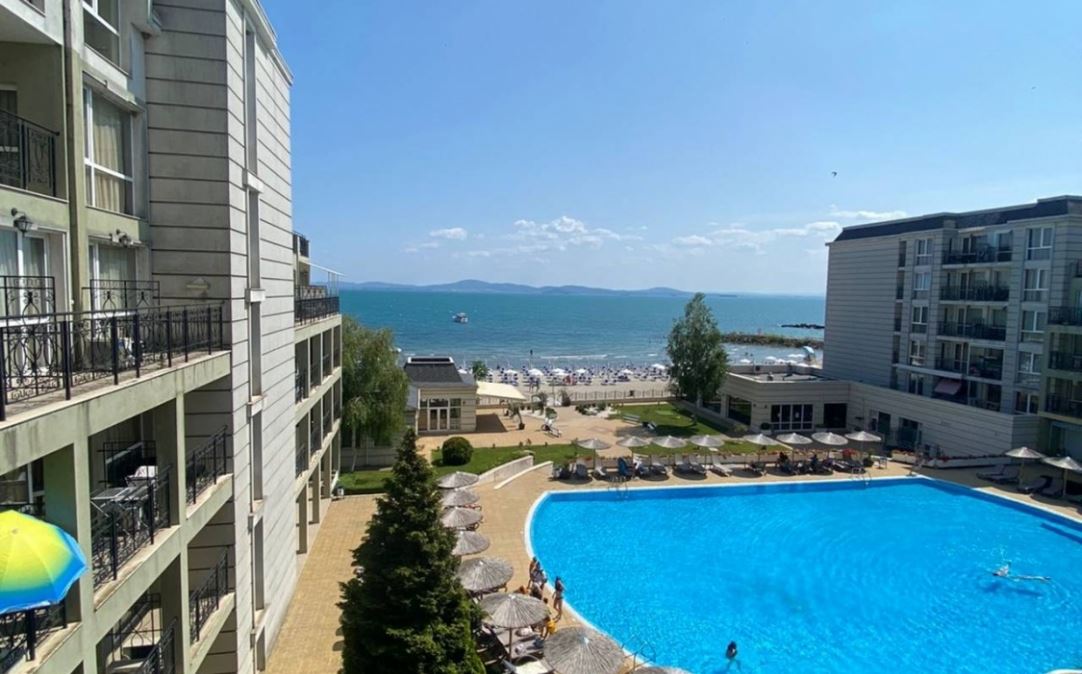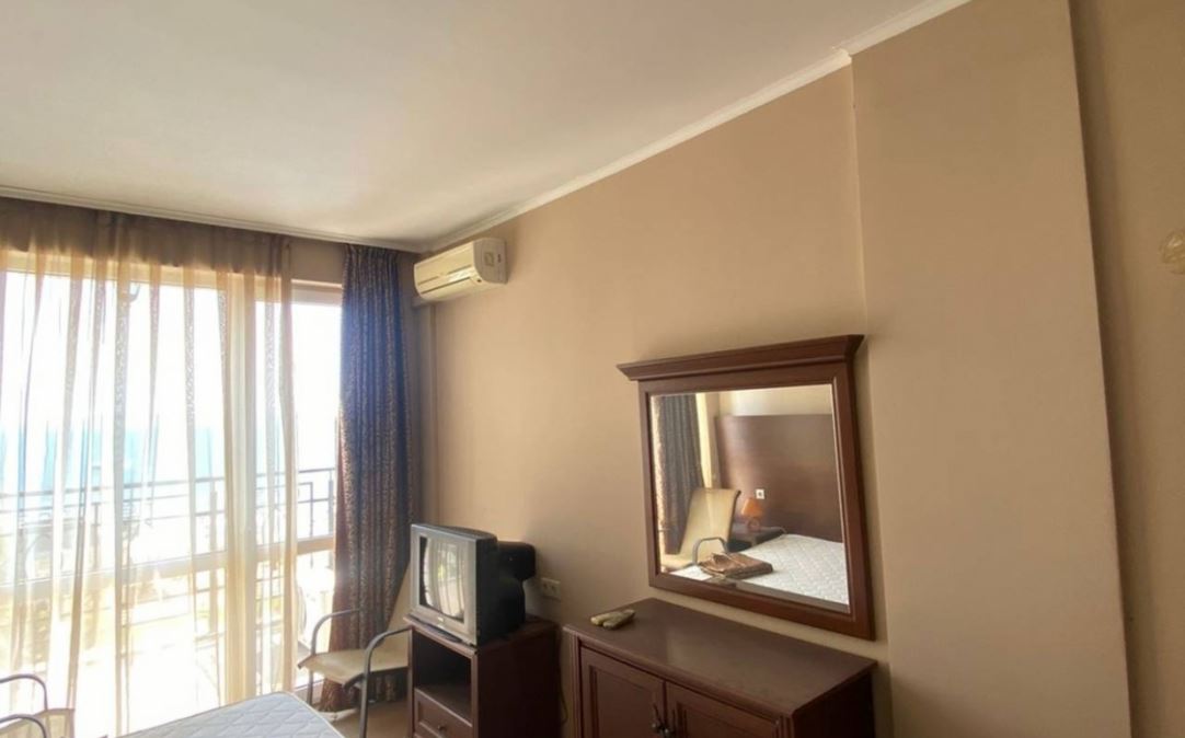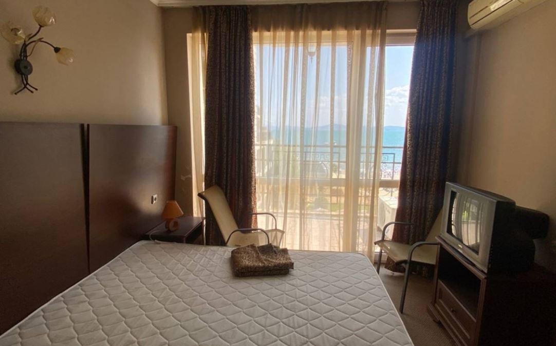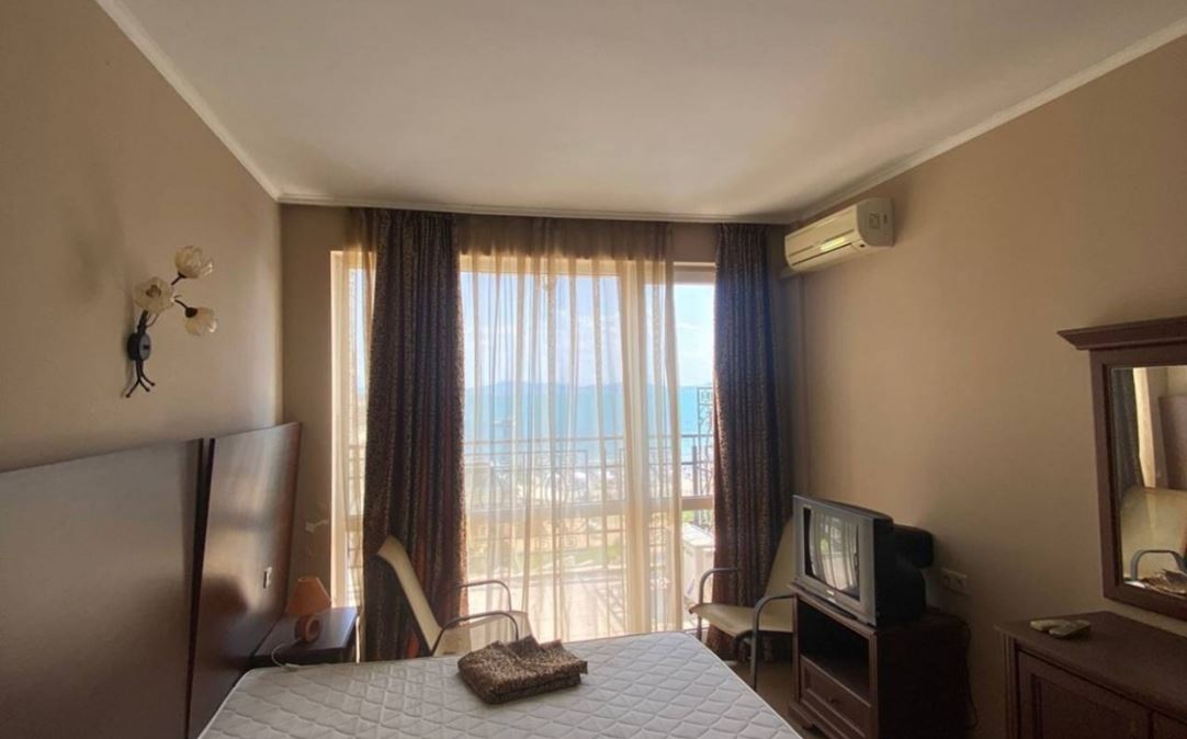 For sale is a furnished studio with sea view in the prestigious four-star hotel complex on the south beach, in the new part of the town. The property is located in the beautiful beachfront area of Pomorie. The apartment is located on the fourth floor and offers 33,66 m2 of well-used area. This cozy studio consists of a spacious room that combines a living room and a sleeping area, as well as a modern kitchen equipped with everything you need: built-in ceramic hob, extractor fan and fridge. The bathroom is functional and includes a bathtub for your comfort. From the terrace you can enjoy a stunning view of the sea, which creates a unique feeling of relaxation and tranquility. The studio is in need of partial renovation, and the new owner can customize it according to their preferences.