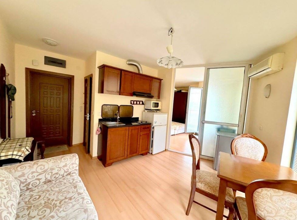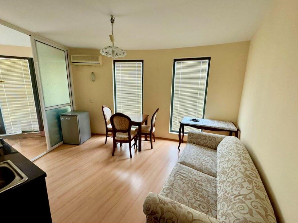 We offer a 56 sq.m apartment on the third floor of a five-story building in Sunny Beach. The apartment consists of a spacious living room with kitchenette, bedroom, bathroom, and terrace, providing cozy and functional living for year-round residence or vacation stays. The apartment is fully furnished with furniture and appliances, ready for immediate move-in.