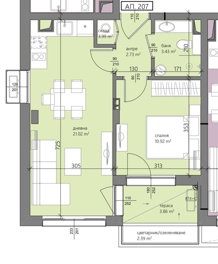 The apartment impresses with a well-thought-out layout – a living room with a kitchenette, a cozy bedroom, a bathroom, and a balcony that provides a pleasant space for relaxation and fresh air. The bright and spacious rooms create a feeling of openness and comfort, while the interior is finished with contemporary materials and elegant details, giving it a complete and stylish look.