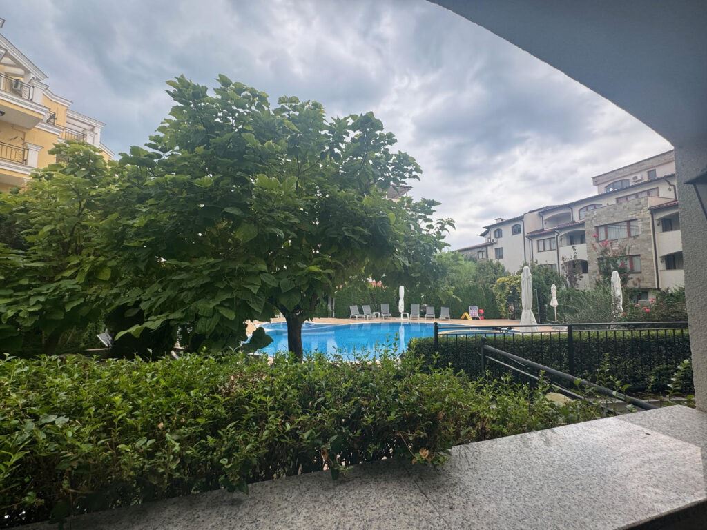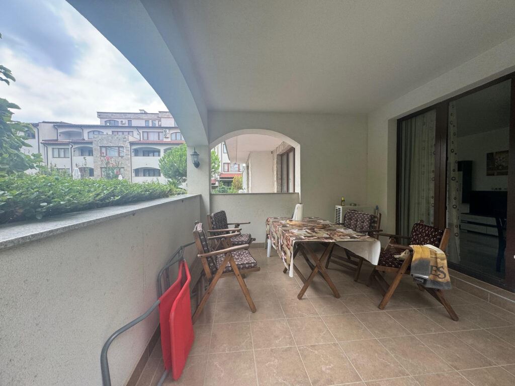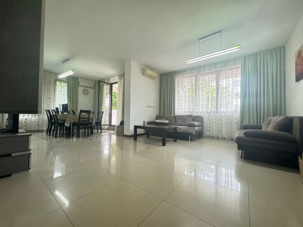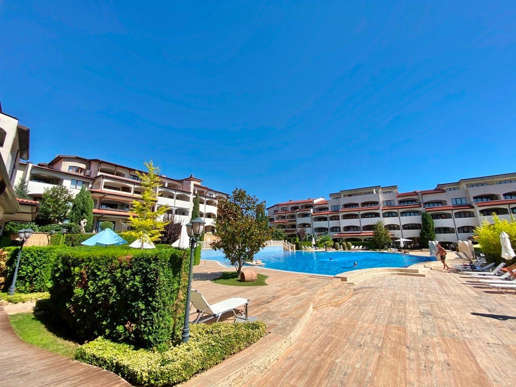 Spacious fully furnished one bedroom apartament with a large yard of about 150 m2 is located in a beautiful sea front complex in the town of Sveti Vlas. The apartament of 124 square metres is located on the ground floor and consists of an entrance hall, a spacious living room with kitchenette, a bedroom with bathroom and toilet, two terraces. There is a possibility to separate one more bedroom. The apartament is fully furnished and ready to live in or rent out as an investment property. The complex has 24 hour security, video surveillance, limited access, technical support and maintenance of common areas, parking, swimming pool with sun loungers around, restaurant, pool bar, etc. The complex is located 10 m from the sea shore and close to the central part of Sveti Vlas. There is a developed infrastructure around the complex. Nearby there are supermarkets, shops, pharmacy, polyclinic, bus stop, restaurants, fast food, beach, aqua park and other entertainment.