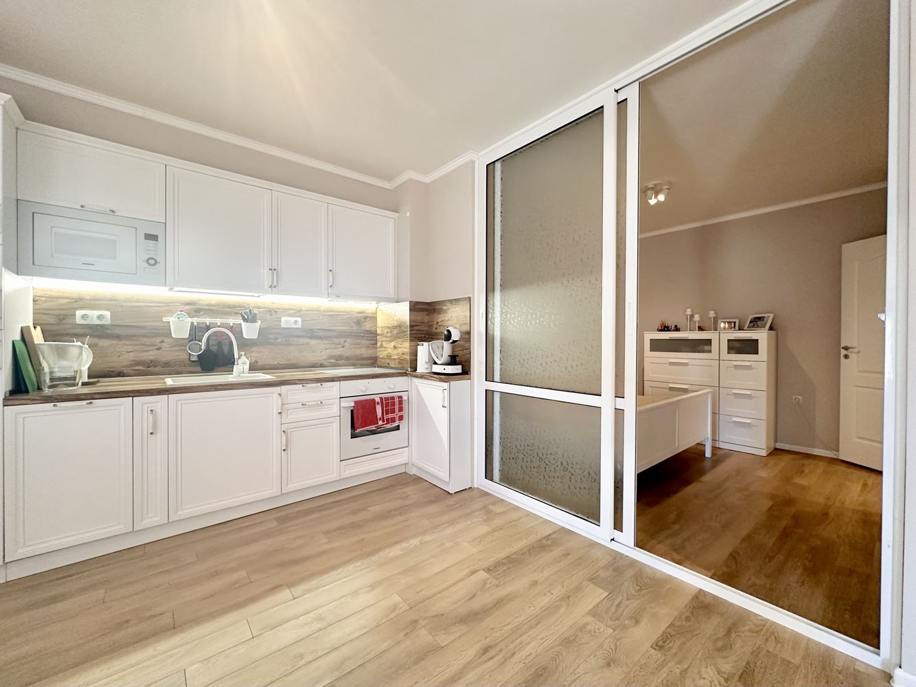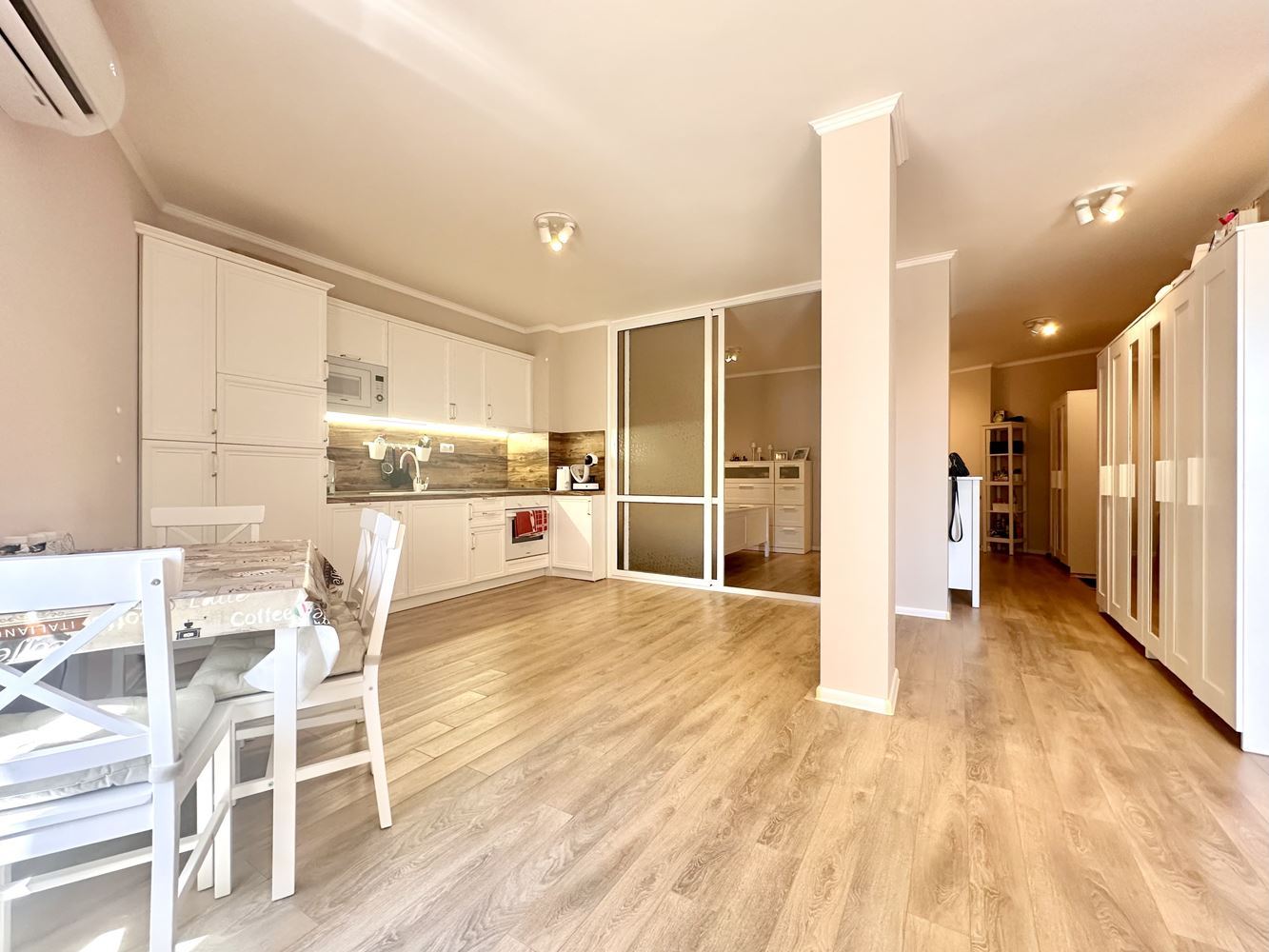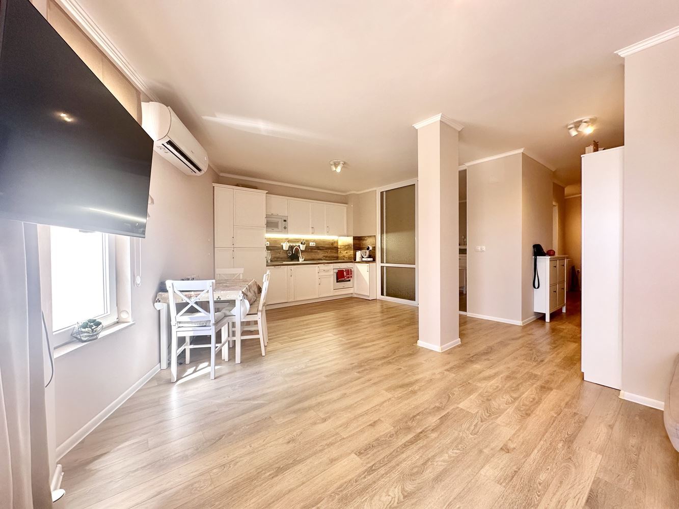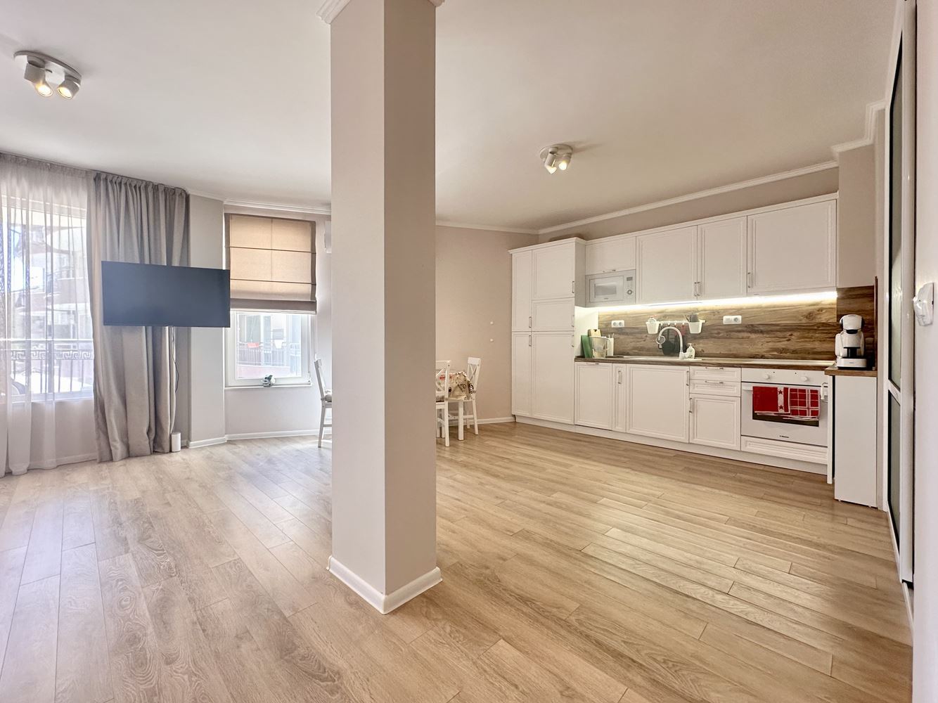 The apartment impresses with its spaciousness and functional layout, creating a sense of freedom and light. The large windows reveal a beautiful view of the pool and the sea, turning every day into a pleasure. This is a place where you can enjoy your morning coffee with a sea horizon or relax in the evening in a calm and cozy atmosphere.