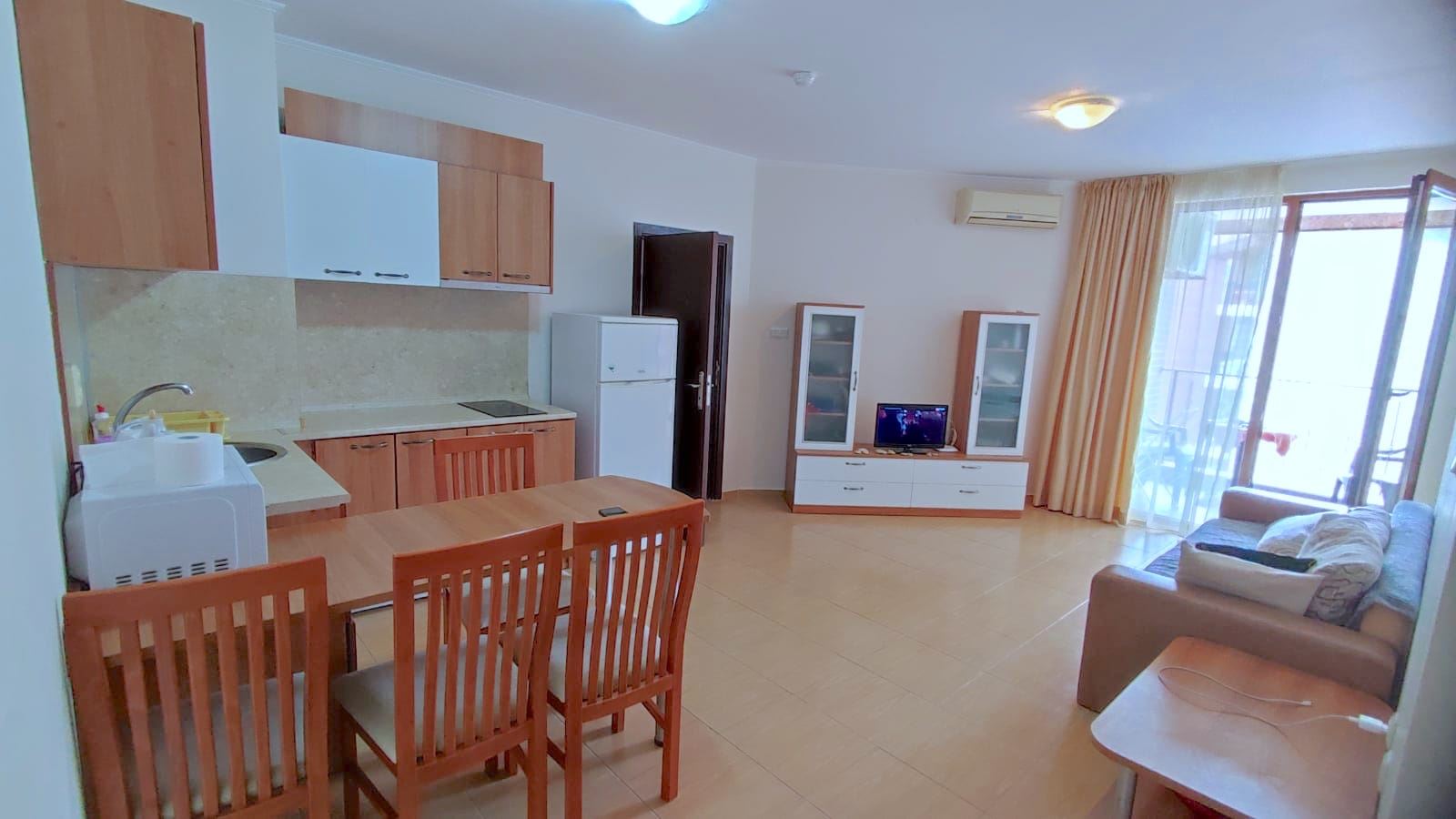 We offer a spacious one bedroom apartment in a complex with excellent infrastructure. The apartment is located on the fourth floor and has an area of 70 square meters, which provides spacious and comfortable living. There is an entrance hall, a living room with kitchen and dining area, one bedroom and a bathroom with shower. The apartment is sold with furniture and appliances, ready to live in. The complex is located in a mega-complex surrounded by picturesque squares with diverse vegetation, playground, swimming pool for children and adults, as well as areas for recreation and walking. The complex is located between Ravda and Nessebar, just 200 meters from the beach and 300 meters from the water park "Paradise". This convenient location allows you to enjoy a sea vacation and a variety of entertainment. The complex has two restaurants, cafes, minimarket, small spa center, tennis courts, children's playground and free parking.