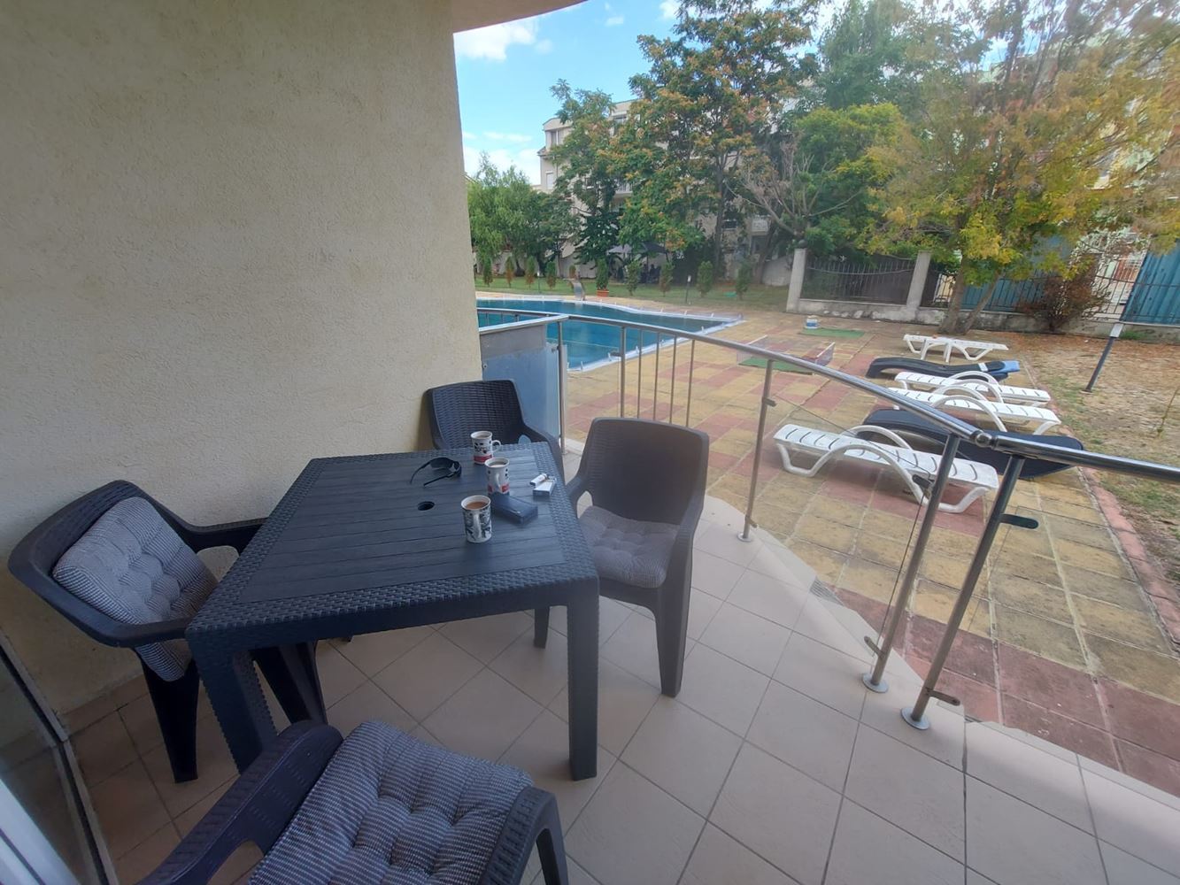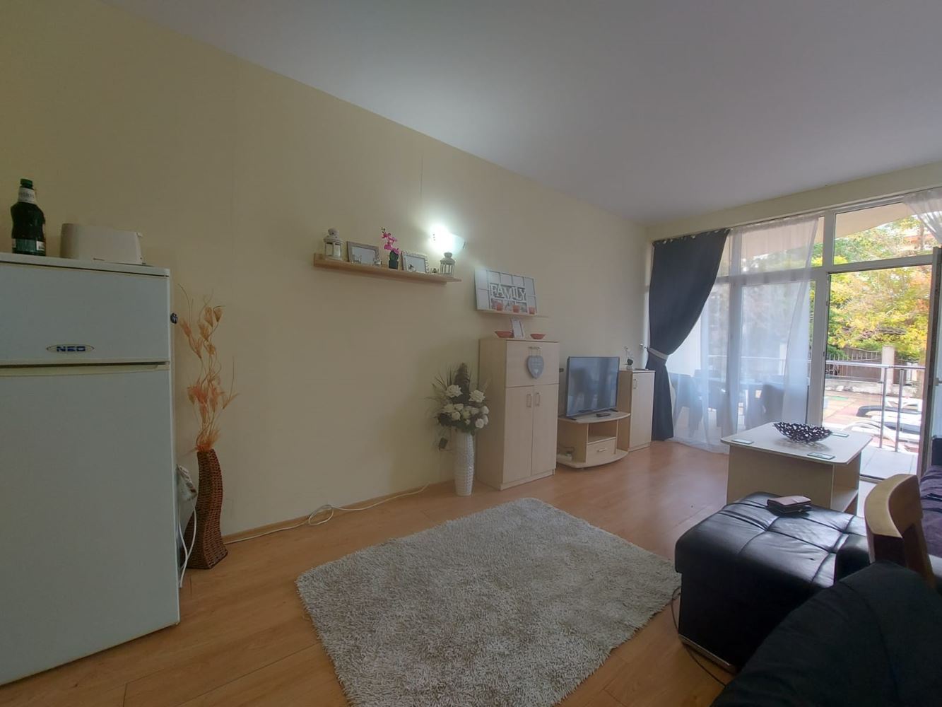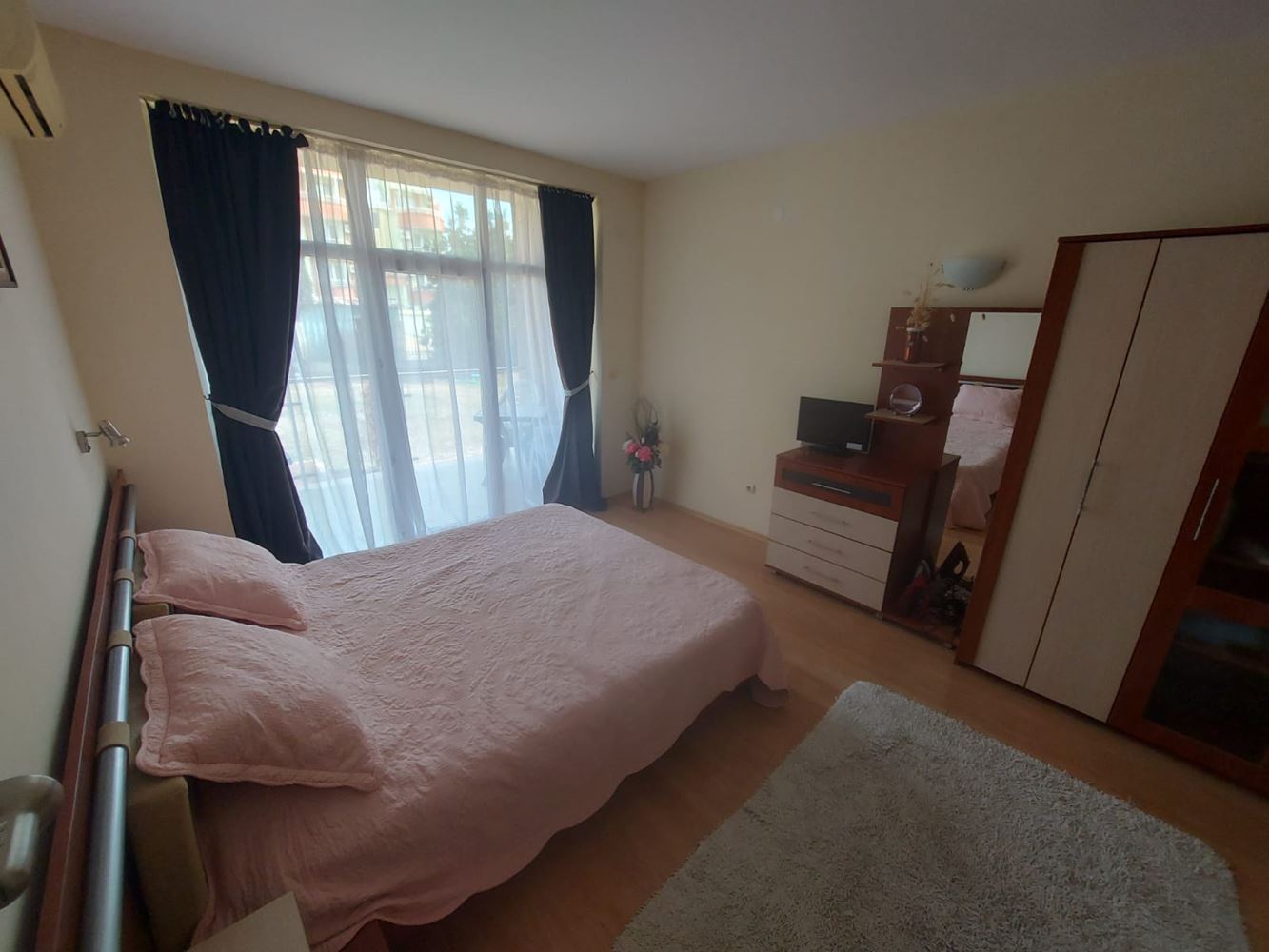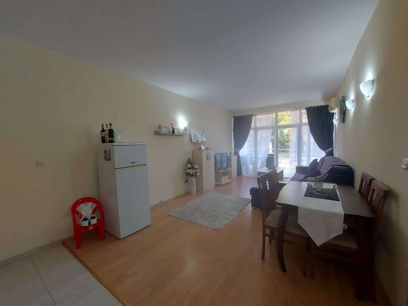 We present an exceptionally spacious one-bedroom apartment with a total area of 96 m², located on the ground floor of a well-maintained complex in Sunny Beach. The property impresses with its functional layout, cozy interior, and pleasant pool view – an ideal combination for comfortable living and an excellent investment. The apartment consists of a hallway, a spacious living room with a designated kitchen and dining area, one bright and quiet bedroom, a bathroom with toilet, a separate guest toilet, and a large terrace. The terrace has direct access from the living room and offers a lovely view of the pool and the complex, creating a sense of space and relaxation. The generous area allows for convenient furnishing and zoning according to your needs. The apartment is sold fully furnished, ready for immediate move-in. Carefully selected furniture adds coziness and completeness to the interior, and the practical layout facilitates everyday life – especially convenient is the ground floor with easy access, no stairs.