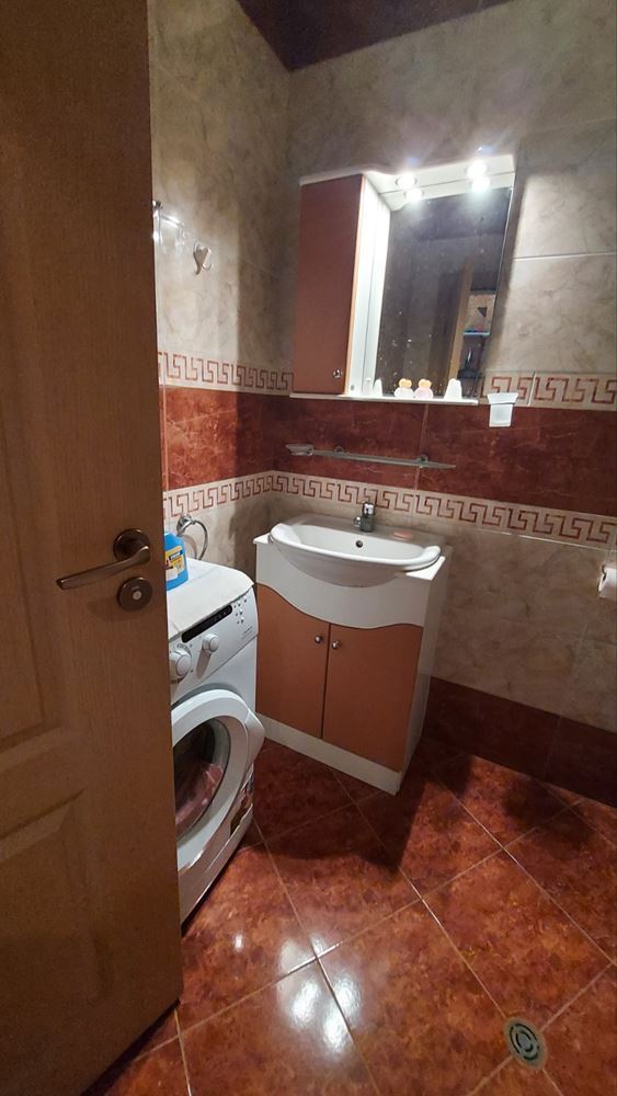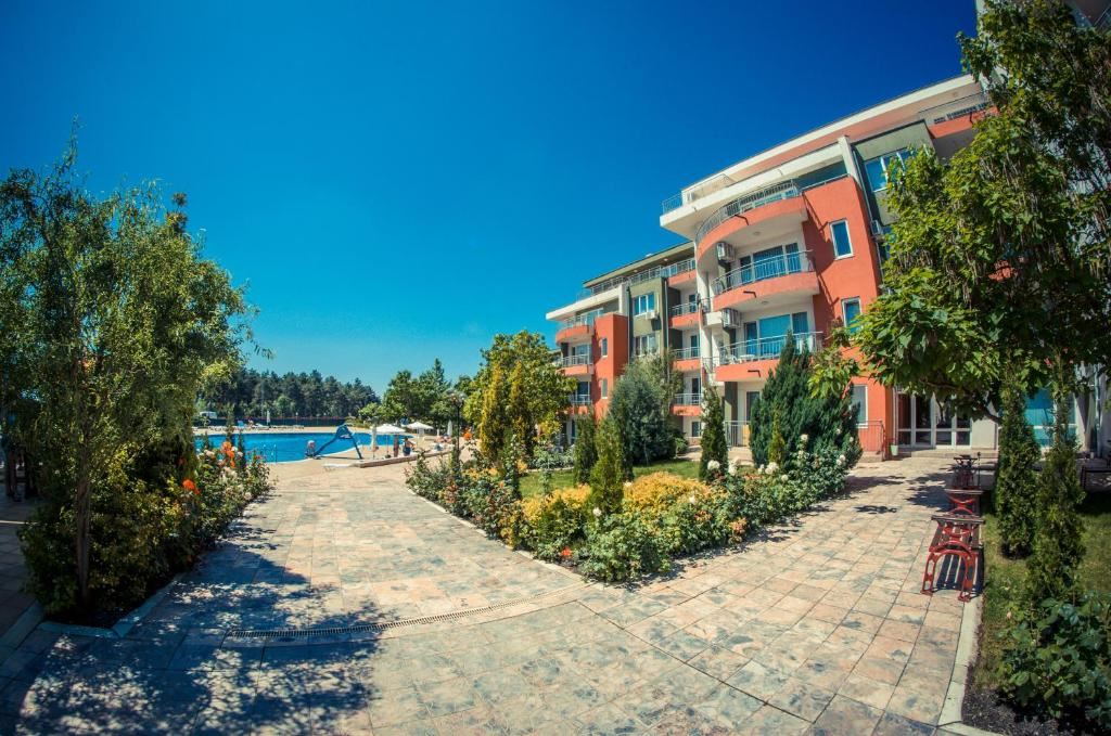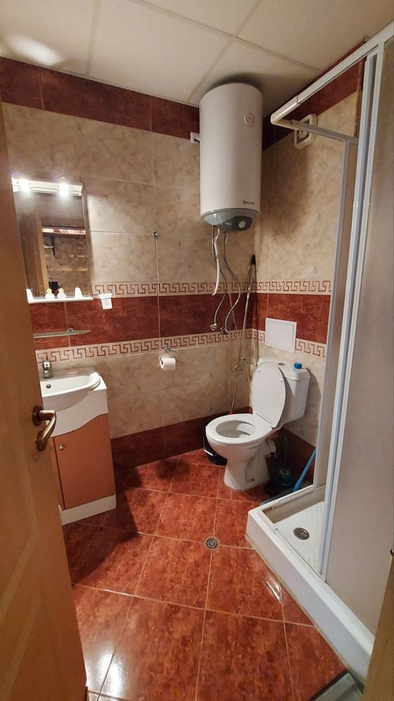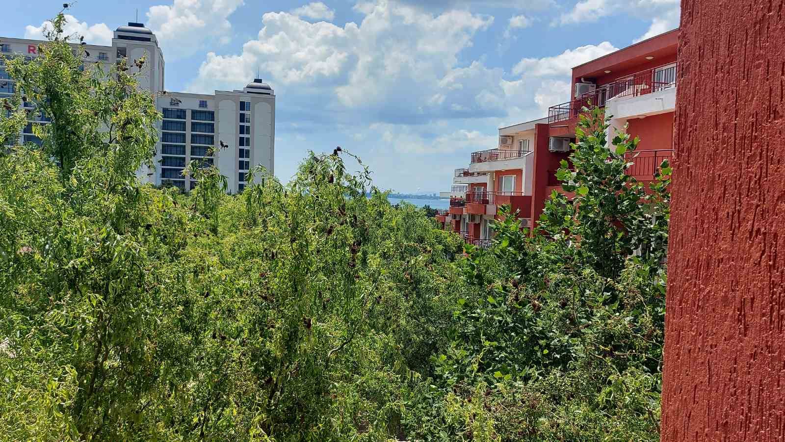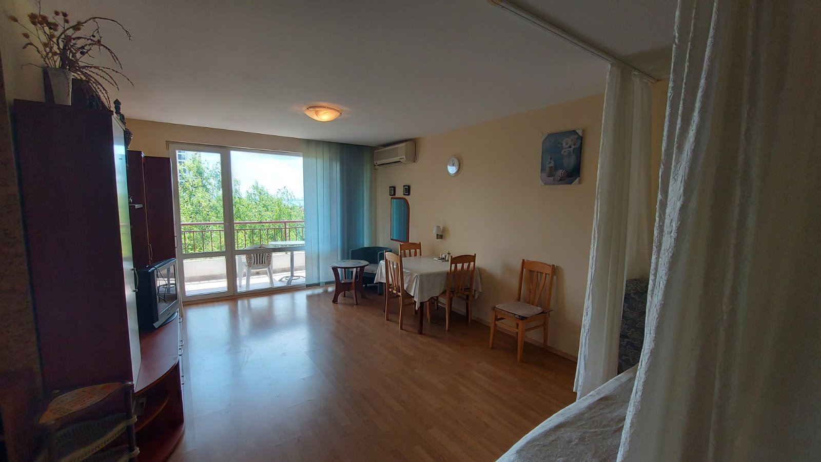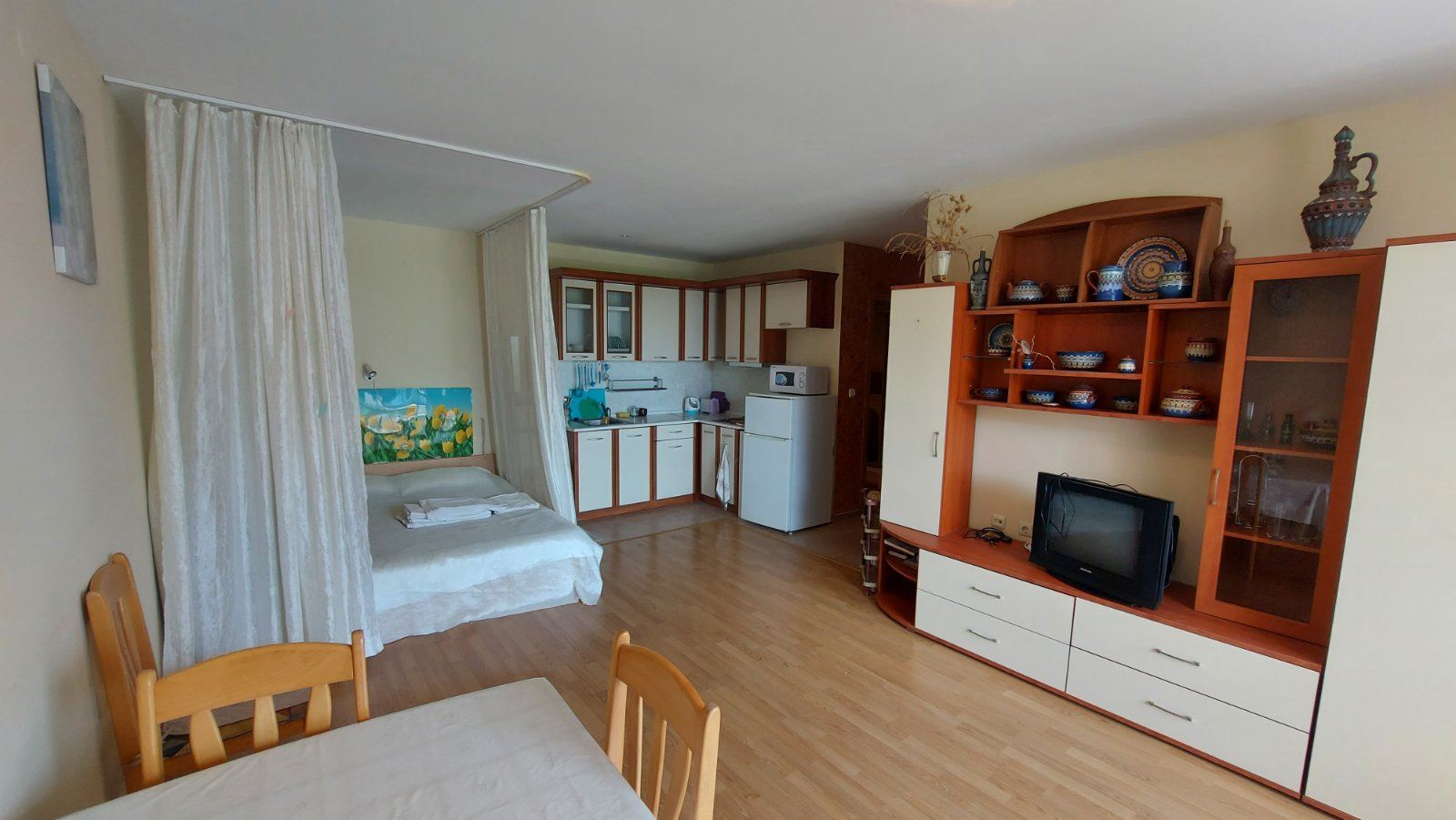 Large studio flat with sea view in a cozy apartment complex in the northern part of Sunny Beach. The complex is located near a pine forest and has beautiful greenery of conifers, flower beds and lawns. The air in the complex is very clean and fresh, the rest in such an environment will bring immense pleasure. The complex has a large swimming pool with slide and sun loungers, playground, tennis court and football field for outdoor activities, shop, restaurant, laundry room, massage room, billiards, fitness centre. Clean and shallow beach is located 300 meters from the complex. This studio flat of 52 m2 is located on the first floor. It consists of a living room with open-plan kitchen, bathroom with toilet and a balcony. The flat is sold furnished and equipped.