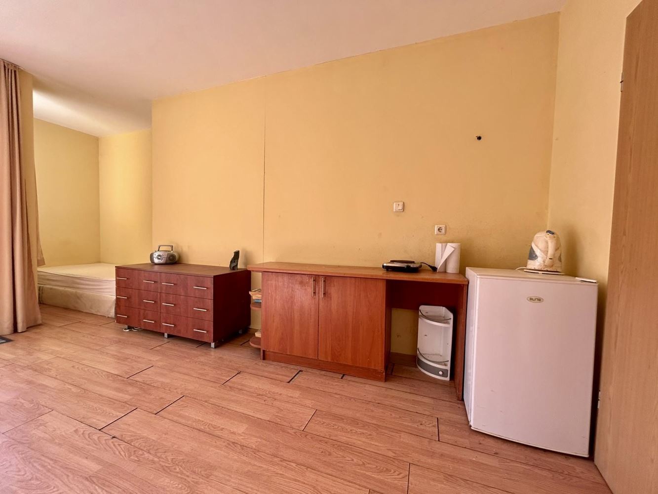 We offer for sale a sunny and spacious ground-floor studio with a total area of 41 m², located in a well-maintained building/complex in Ravda. The apartment impresses with large panoramic windows that provide abundant natural light and a pleasant view of the greenery, pool, and partial sea view. The property is functionally organized as an open space with designated areas for living, kitchen, and sleeping, and comes with existing furniture – ready to move in or rent out without additional investment. The bathroom with toilet is in excellent condition. The highlight is the spacious terrace, ideal for morning coffee, post-beach relaxation, or outdoor gatherings with friends.