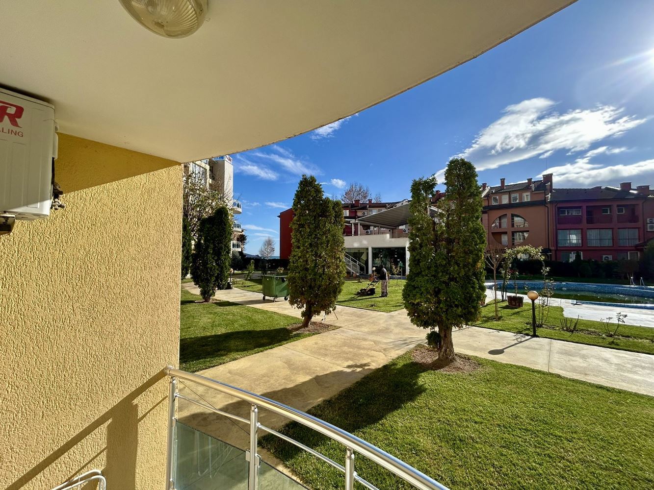 The complex offers an outdoor pool, beautifully landscaped areas, and relaxation zones — a peaceful environment that contributes to a vacation-like feeling throughout the year. The studio is suitable for both year-round living and summer holidays, thanks to its convenient location and the comfort it provides.