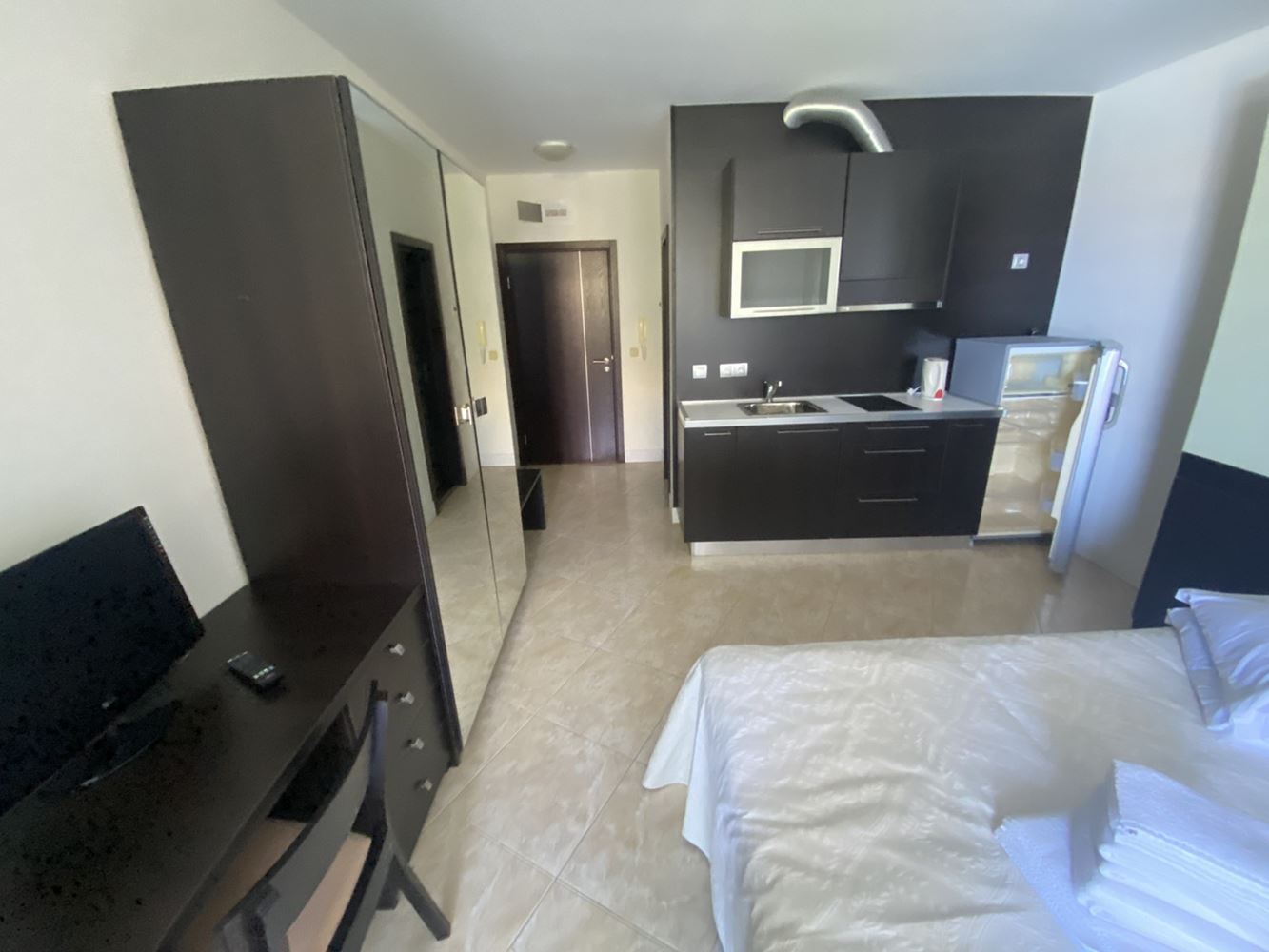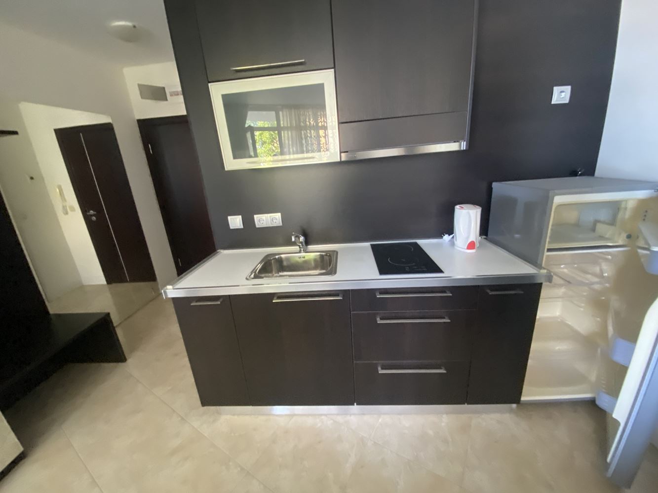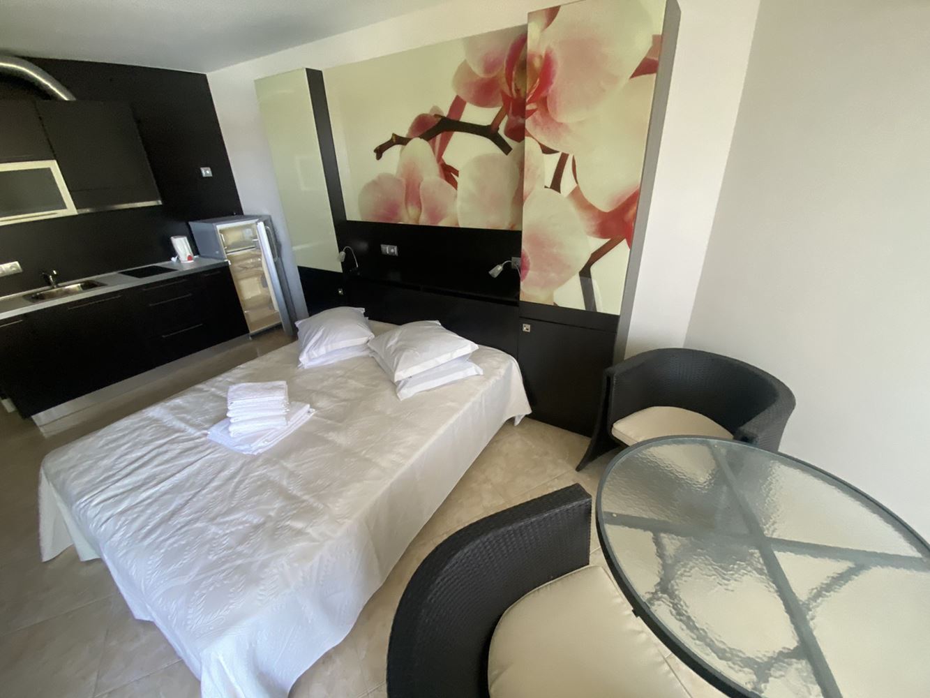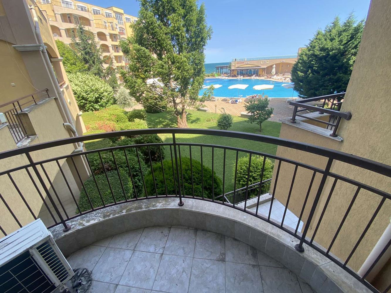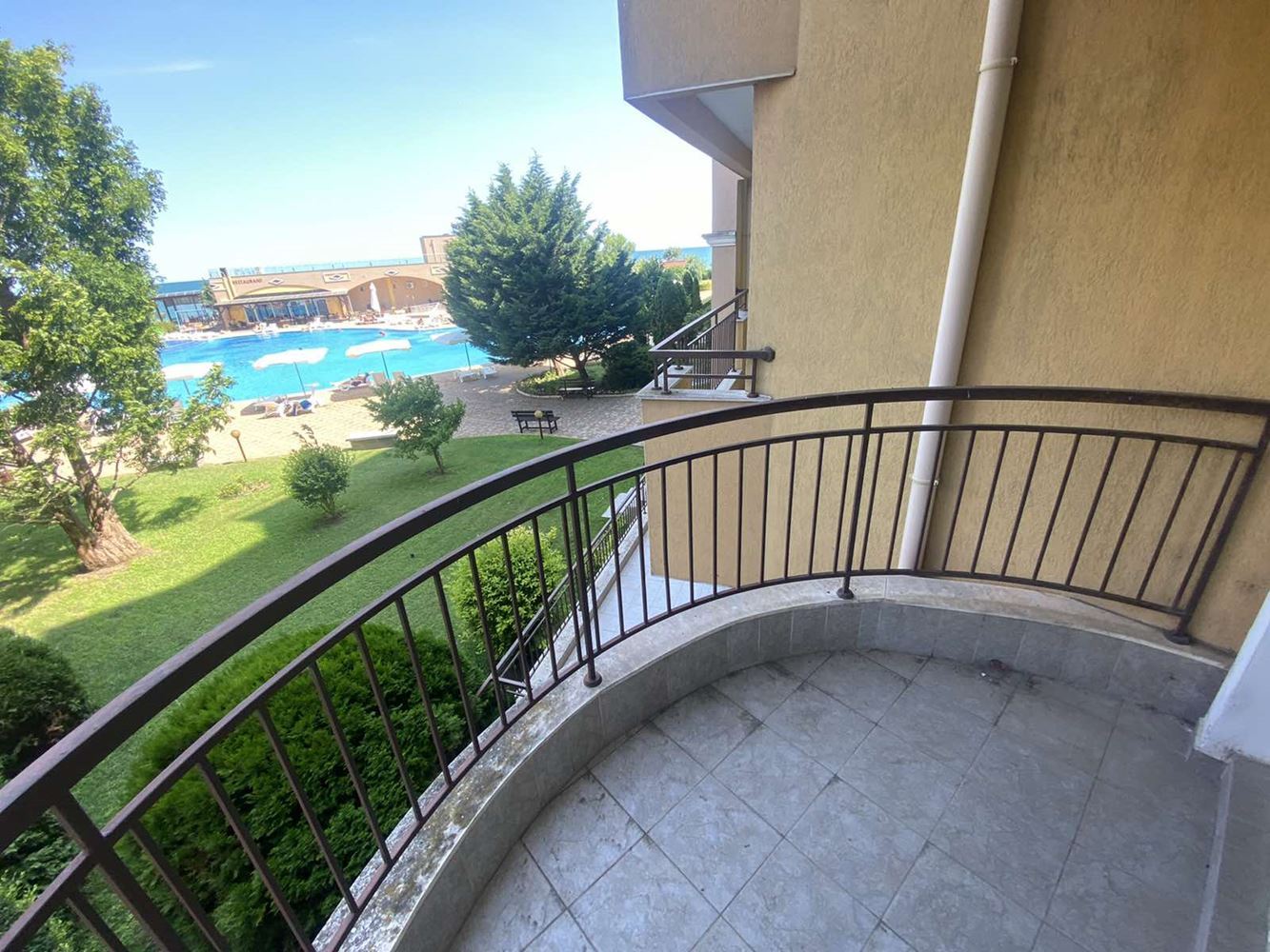 Spacious studio flat with sea view on the first line in the original complex. The 40 m2 flat is on the first floor and has a balcony with a beautiful view of the sea and the swimming pool. The flat is fully furnished in style and quality, with a kitchenette and everything you need for a comfortable stay. There are household necessities and accessories. The complex is favorably located in a quiet place, near the town of Pomorie and close to Sunny Beach and the ancient town of Nessebar. The complex with its spacious area is situated outside the town. There is everything you need for recreation and wholesome living, including a restaurant, bar, large swimming pools, beach, playgrounds and swimming pool, gym, spa.