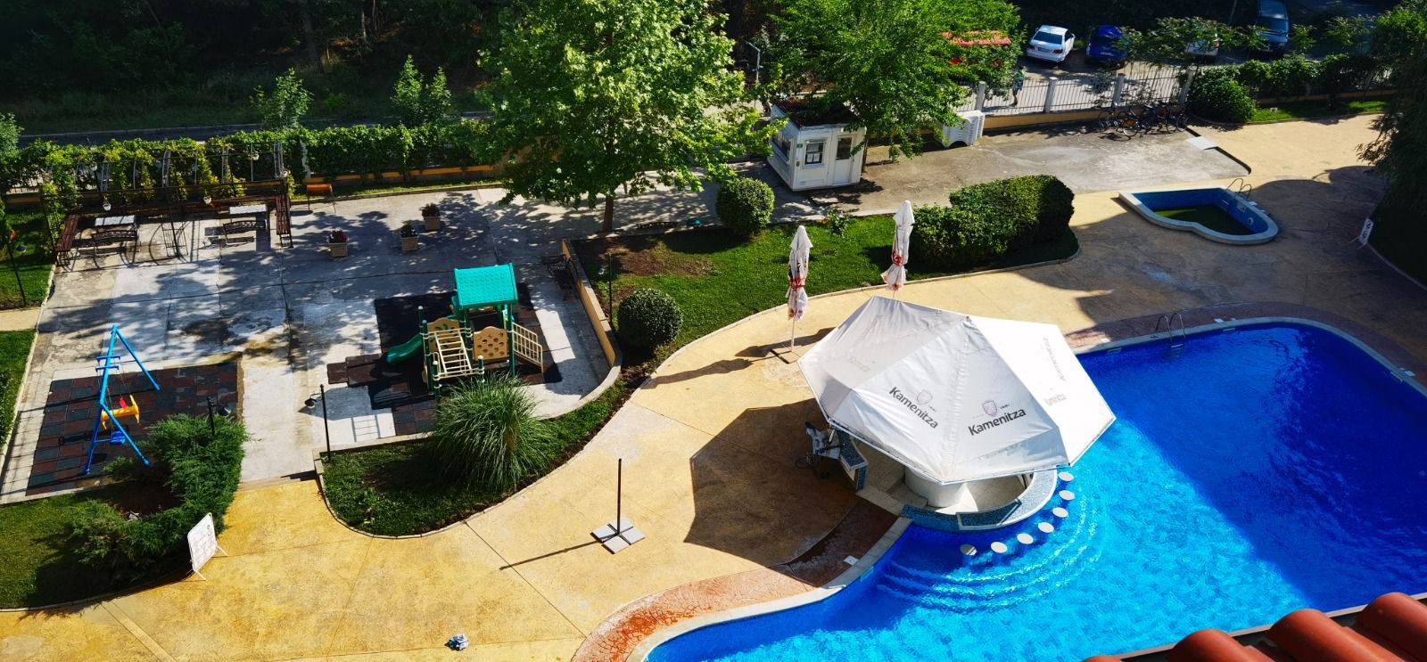 - Outdoor swimming pool with sun loungers and relaxation area;