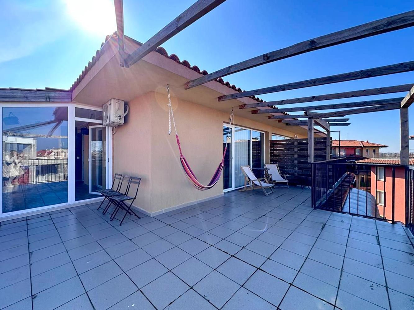 We offer an exceptionally attractive three-room apartment in a prestigious residential complex, located only 400 meters from the Sunny Beach shoreline. The property has an area of 112 m² and is situated on the fifth, top floor, which guarantees quiet, peace, and more personal space. This is an excellent opportunity for a family home, a holiday residence, or an investment with high rental potential. The apartment is offered furnished and equipped with all necessary appliances, which means you can move in immediately and start enjoying the benefits of your new home. The property is spacious and bright, with well-distributed rooms that provide comfort and functionality for everyday living.