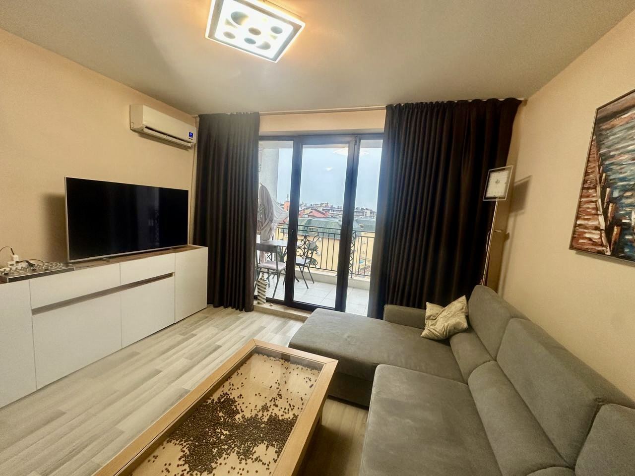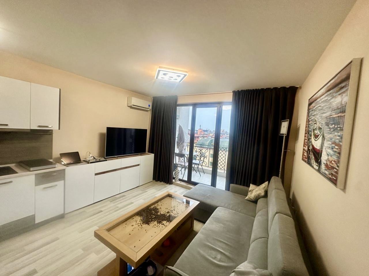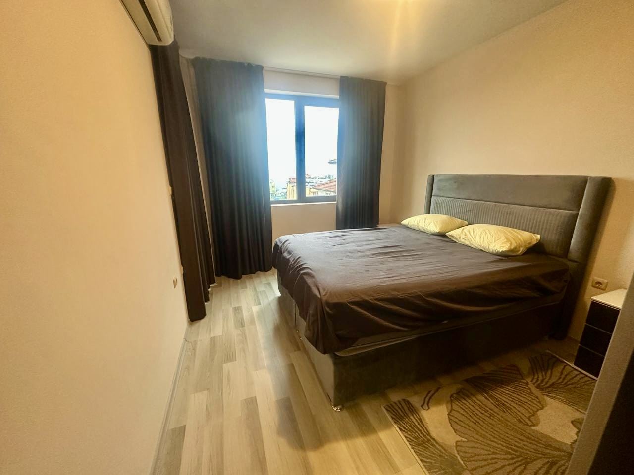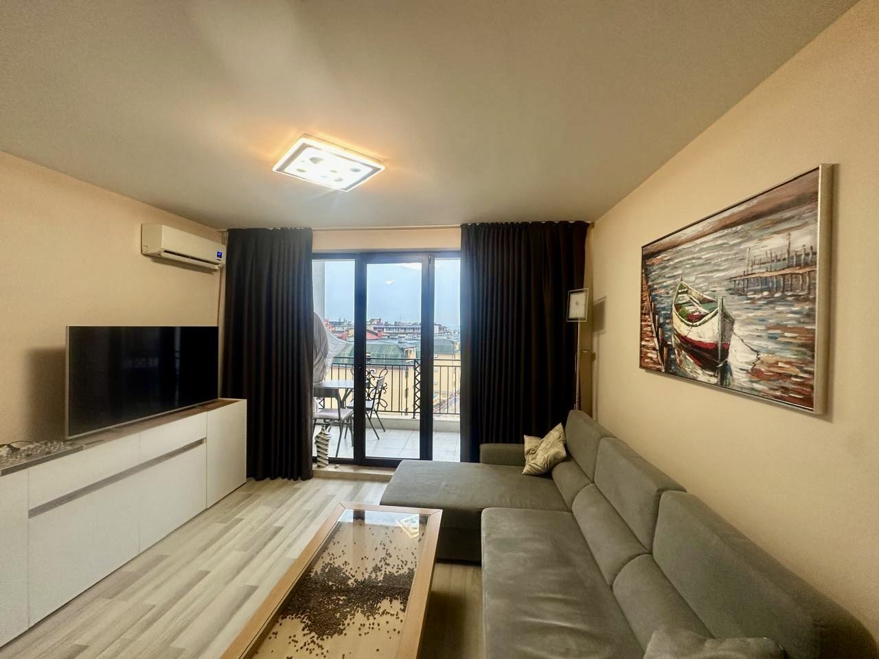 We present to you an exceptional three-room apartment with an area of 91 m², located on the fifth floor in the prestigious “Apollon” complex in Nessebar. The property impresses with an incredible sea view, which unfolds before you every day – a panorama bringing a feeling of freedom, space, and tranquility. The apartment has an excellent functional layout, combining comfort and convenience. The spacious living room with a large kitchen creates a feeling of light and air, providing enough space both for a dining area and for a cozy relaxation corner. The two large bedrooms ensure tranquility and personal space for the whole family or guests. The property has two bathrooms with toilets, which is an extremely practical solution for a larger household, as well as two terraces, from which you can enjoy the beautiful view of the sea and the green areas of the complex. At the entrance there is a convenient corridor, which complements the functionality of the dwelling. The apartment is fully furnished, comfortable, and ready to move in, with the furniture and layout selected with consideration for comfortable everyday living or a carefree vacation. The spaces are bright and well organized, creating a feeling of a home where everything is in its place.