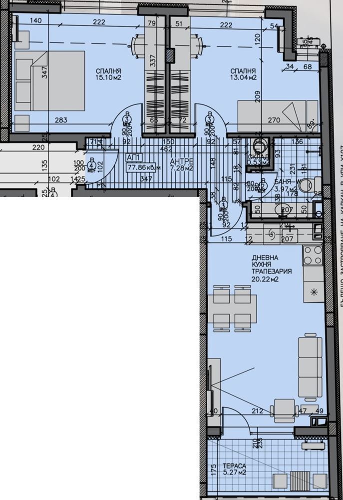 The apartment has a southeast exposure, providing plenty of natural light and a pleasant atmosphere throughout the day. The dwelling consists of an entrance hall, spacious living room with kitchen, two bedrooms, bathroom with toilet, and a balcony, which offers the possibility for relaxation and views of the surroundings. The apartment will be delivered in “shell and core” condition, allowing the new owners to complete the interior according to their preferences and taste.