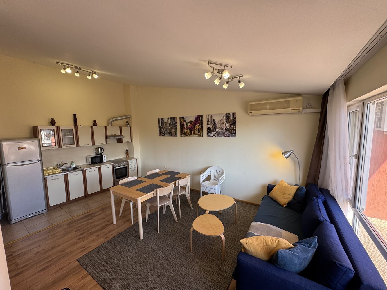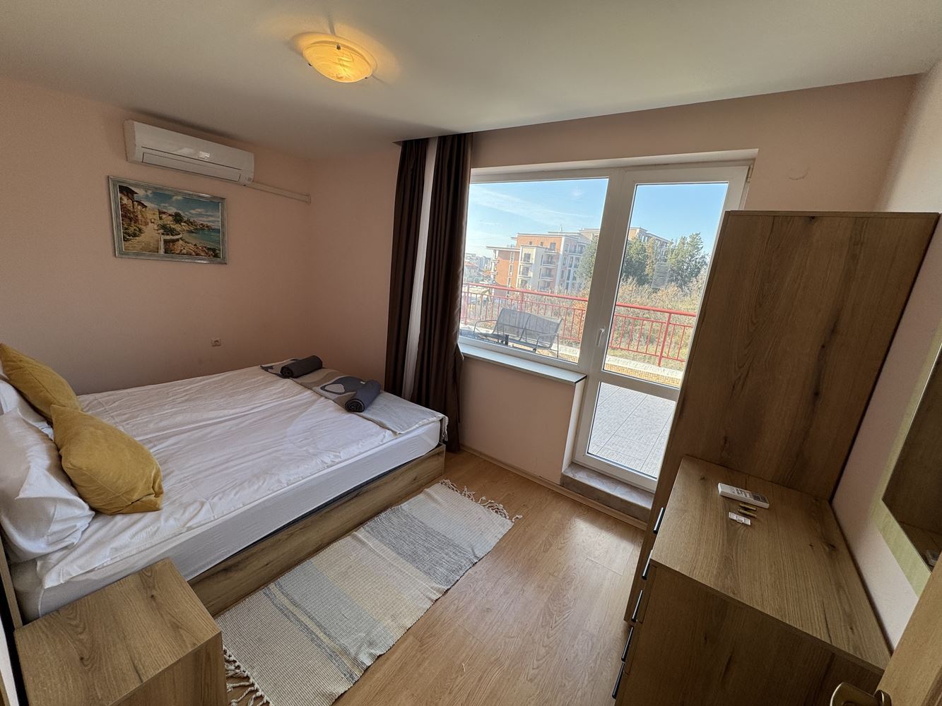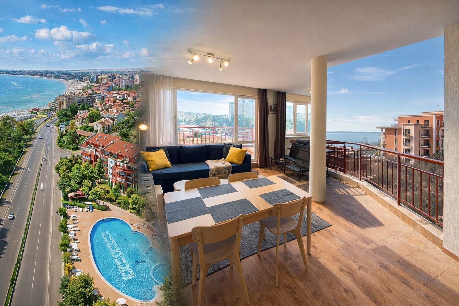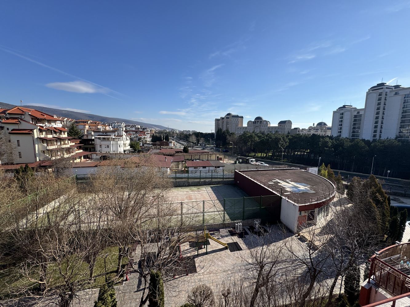The complex offers a wide range of amenities and attractions for residents. On the premises, you will find swimming pools for adults and children, a children’s water slide, safe and entertaining playgrounds, a tennis court, a football field, and outdoor fitness equipment, ideal for maintaining an active and healthy lifestyle. For additional convenience, the complex includes a beach equipment shop, laundry and ironing services, and a cozy restaurant with garden serving exquisite cuisine with stunning panoramic views of Sunny Beach and the bay.