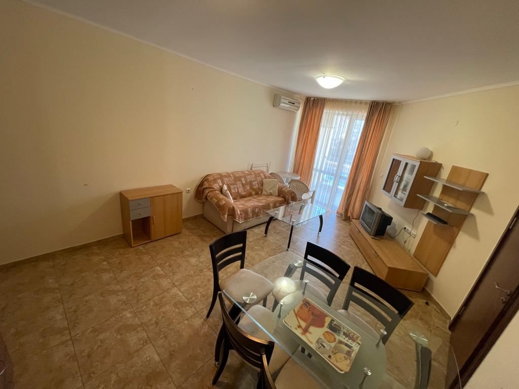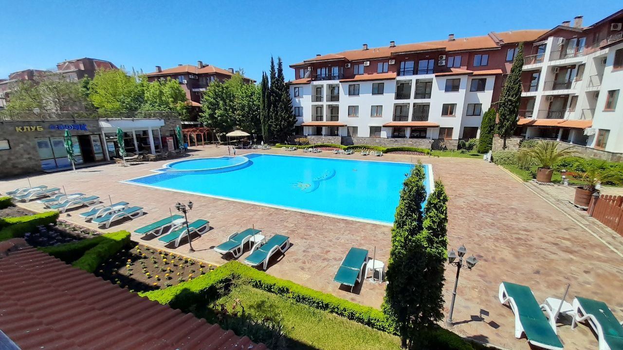 Fully furnished two-bedroom apartment in a complex with all amenities in Nessebar. The area with good infrastructure, all the necessary communications and good transport links. The sea is only 200 m away from the complex. From here you can easily reach any part of the town of Nessebar - the main public transport stops are located in the immediate vicinity. The flat of 82 m2 is located on the fourth floor. It consists of an entrance hall, living room with kitchenette, two bedrooms, two WCs and a balcony. The balcony has a direct view to the swimming pool. The apartment is well furnished, with a fitted kitchen and air-conditioning units.
