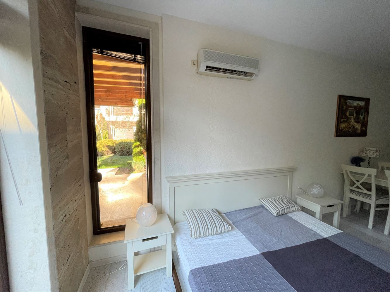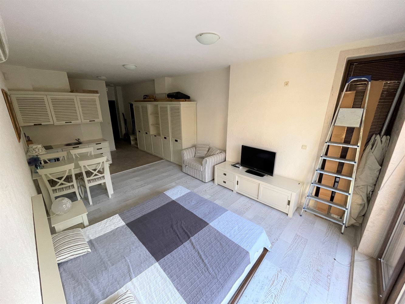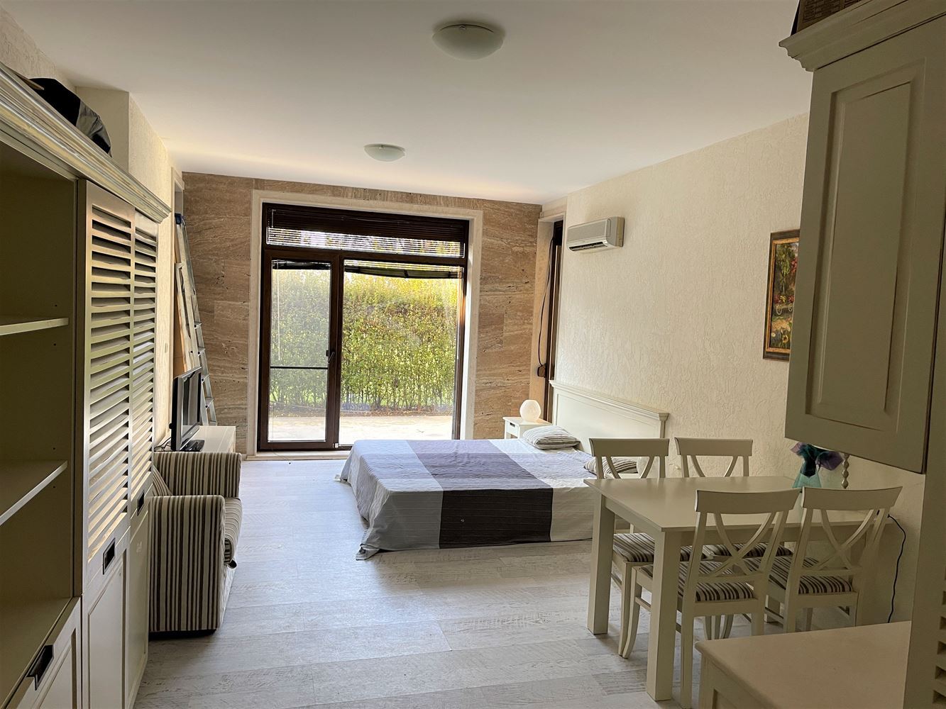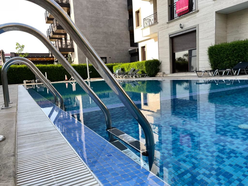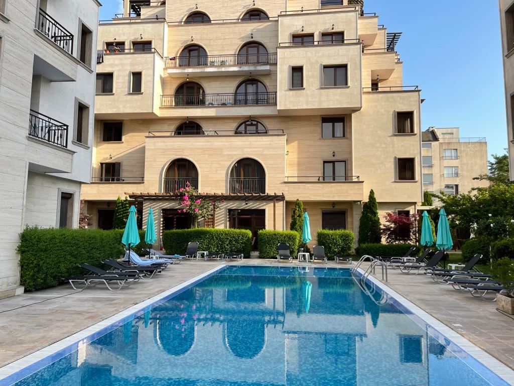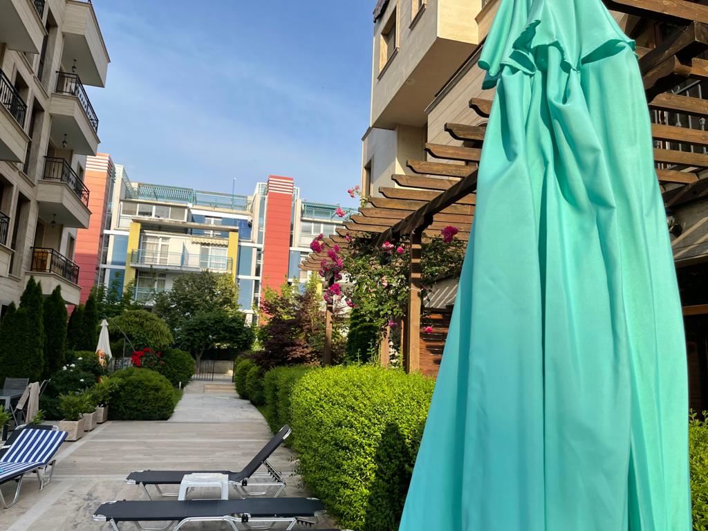 Studio in a modern complex located in the southern part of the resort of Sunny Beach, in a quiet and peaceful area, 400 meters from the sea and the beach "Cocoa", a walk to which takes no more than five minutes. Nearby there is a picturesque creek and a large natural park with dunes and rich vegetation, which brings a calm and pleasant peaceful atmosphere. The area is well-developed with many restaurants, bars, shops, discos and other resort facilities, bus stops and a hospital nearby. The ancient museum town of Nessebar is a 15 minute walk from the complex. This lovely studio flat with size 39m2 is located on the ground floor and has an English yard veranda. It is offered with stylish new furniture and equipment.