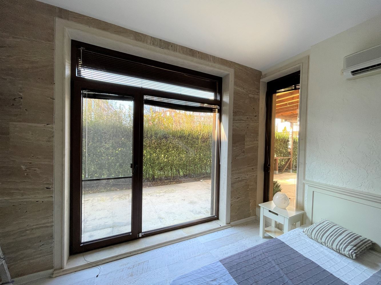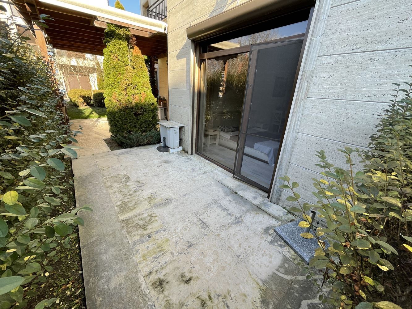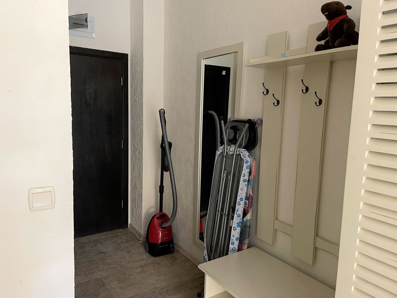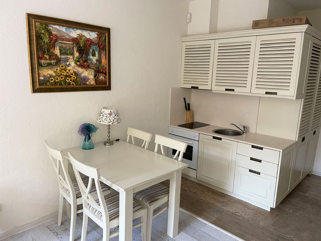 Studio in a modern complex located in the southern part of the resort of Sunny Beach, in a quiet and peaceful area, 400 meters from the sea and the beach "Cocoa", a walk to which takes no more than five minutes. Nearby there is a picturesque creek and a large natural park with dunes and rich vegetation, which brings a calm and pleasant peaceful atmosphere. The area is well-developed with many restaurants, bars, shops, discos and other resort facilities, bus stops and a hospital nearby. The ancient museum town of Nessebar is a 15 minute walk from the complex. This lovely studio flat with size 39m2 is located on the ground floor and has an English yard veranda. It is offered with stylish new furniture and equipment.