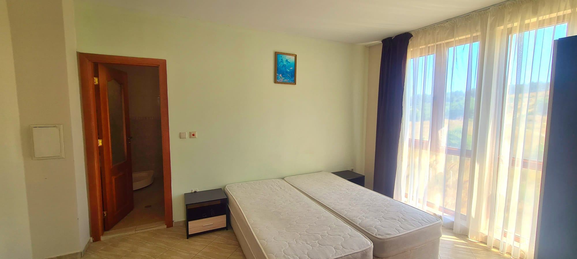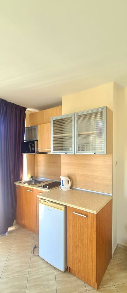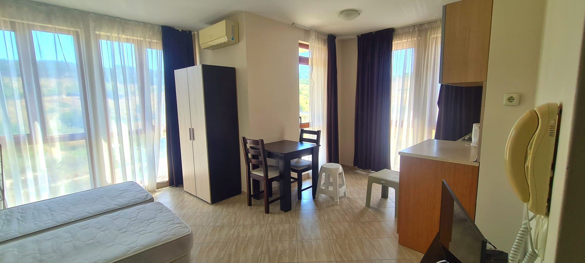 A studio in a residential building in a new area of Sozopol is a cosy accommodation located on the first floor. The total area of the studio is 41 square metres. It is fully furnished, which makes it ready for comfortable living. The studio has a beautiful view of the forest, which creates an atmosphere of tranquility and natural beauty. The location in the new neighbourhood of Sozopol provides silence and privacy, which is especially valuable for those wishing to escape the hustle and bustle of the city. The area is characterised by modern development and there are only new buildings in the immediate vicinity of the studio. This creates an impression of freshness and modernity, and also ensures that there are no problems associated with the old infrastructure. It is important to note that there is no service tax in this house, which can be an added advantage for the residents. The presence of complete infrastructure in the neighbourhood makes living in the studio convenient and functional. Shops, cafes, restaurants, as well as other public facilities are located nearby, providing everything you need for a comfortable life.