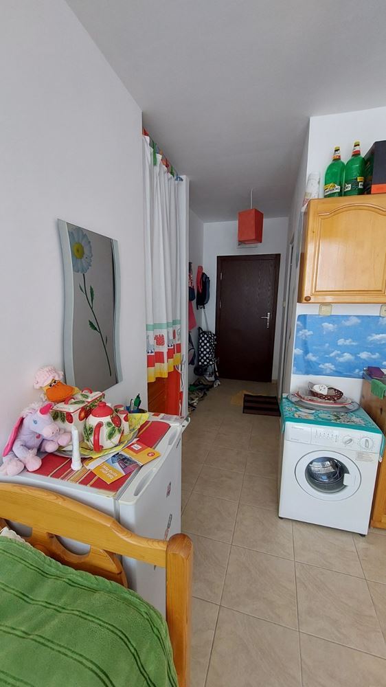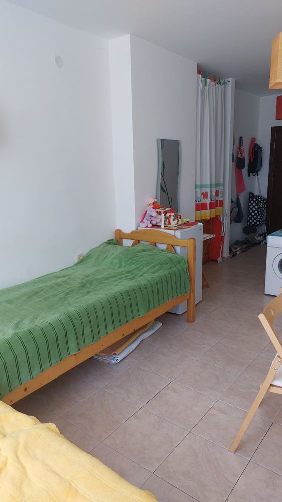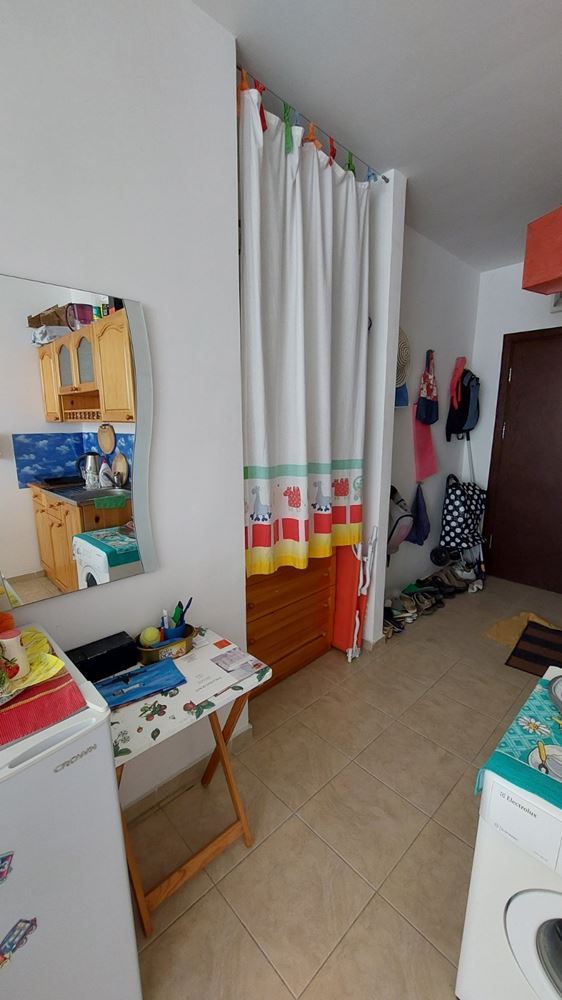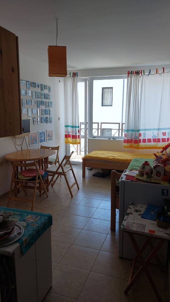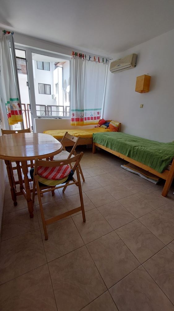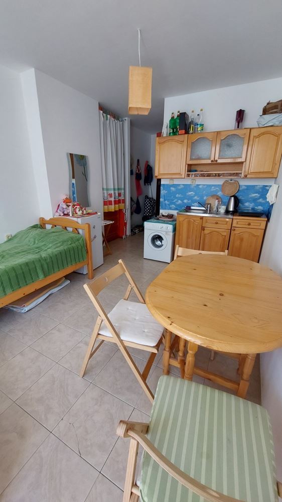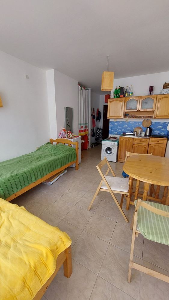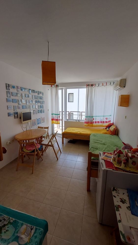 Cozy studio flat in a complex at the foot of the mountains and the sea in the prestigious area of Sunny Beach. The air in this area is phenomenally healthy as the complex is surrounded by coniferous forest on one side and the sea on the other. The complex offers many facilities from a children swimming pool and jacuzzi, to an exchange office, a safe deposit box and a snack bar. This 30m2 flat is located on the third floor. It comprises entrance hall, bathroom, kitchen-sleeping room and balcony. The apartment comes fully furnished and equipped. The studio can be used as a permanent residence, a holiday home every summer or as an investment for renting.