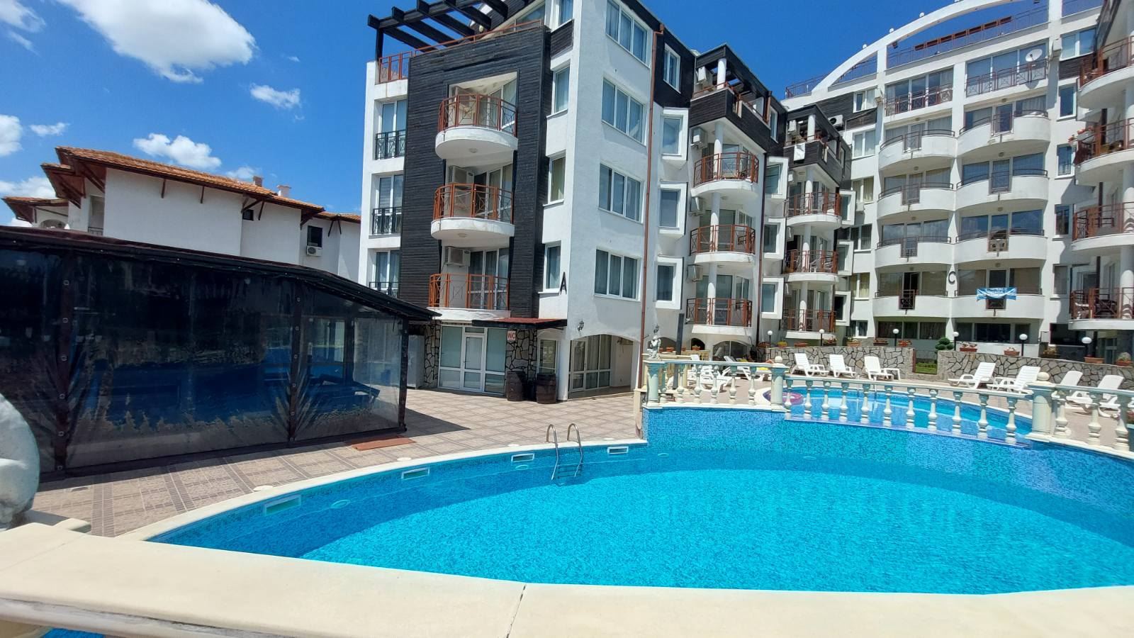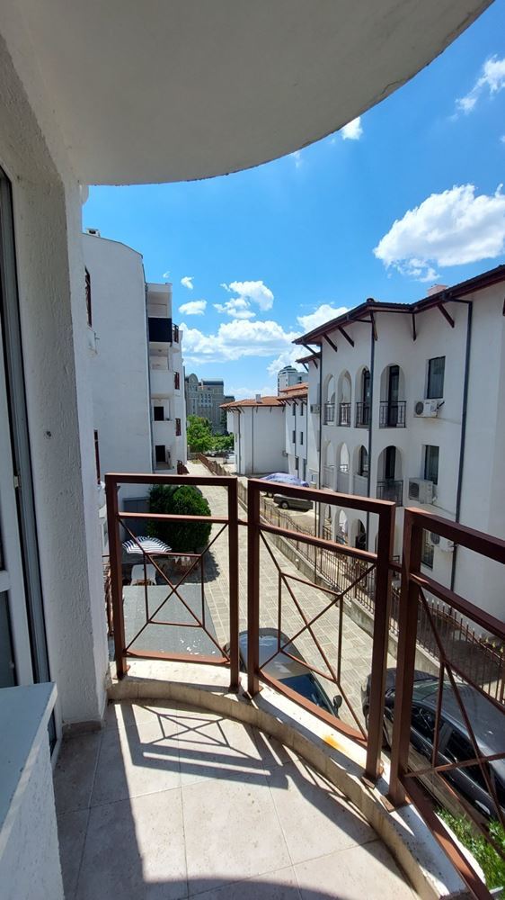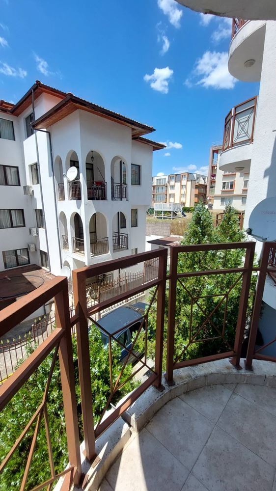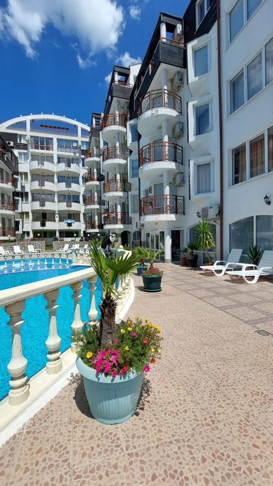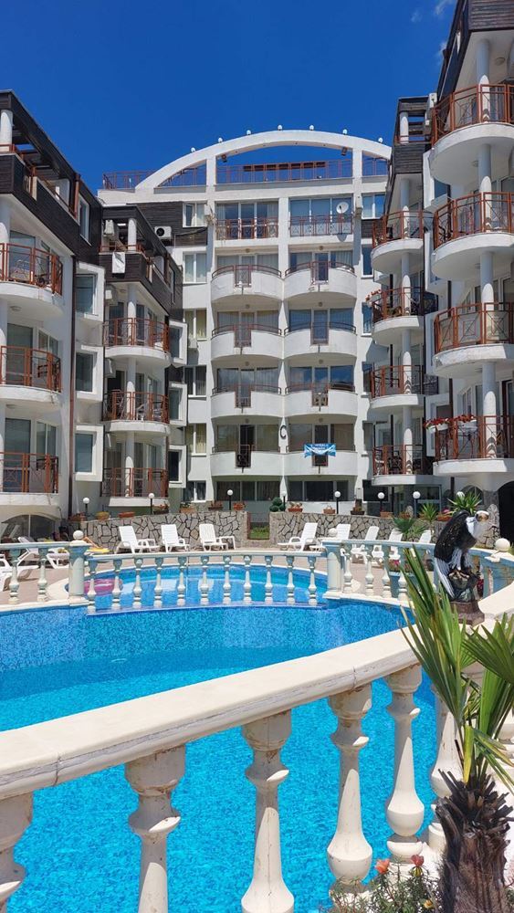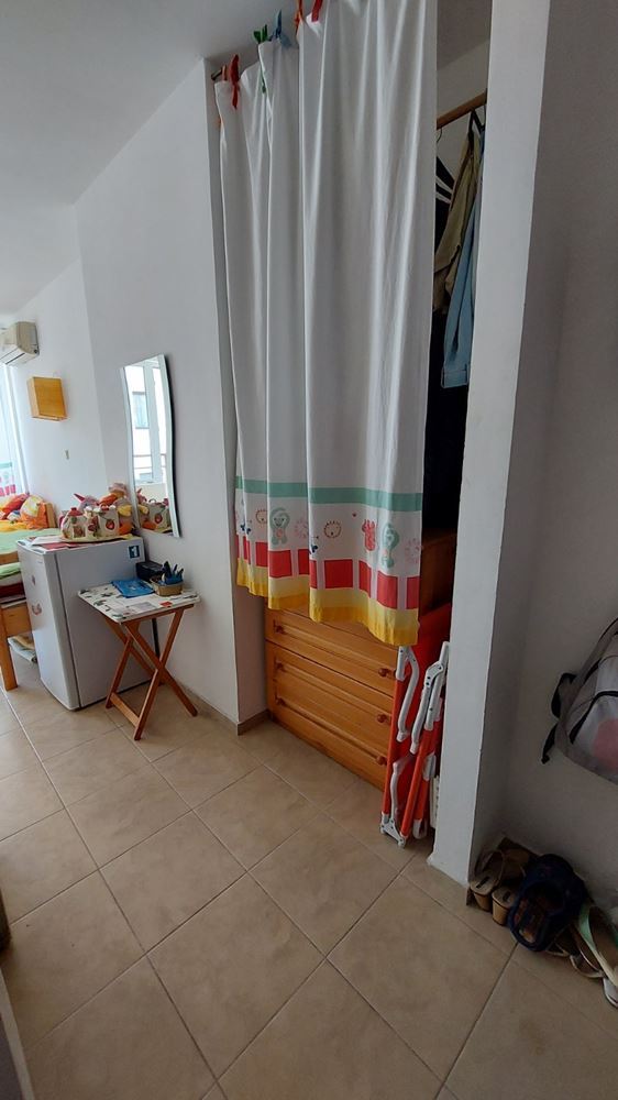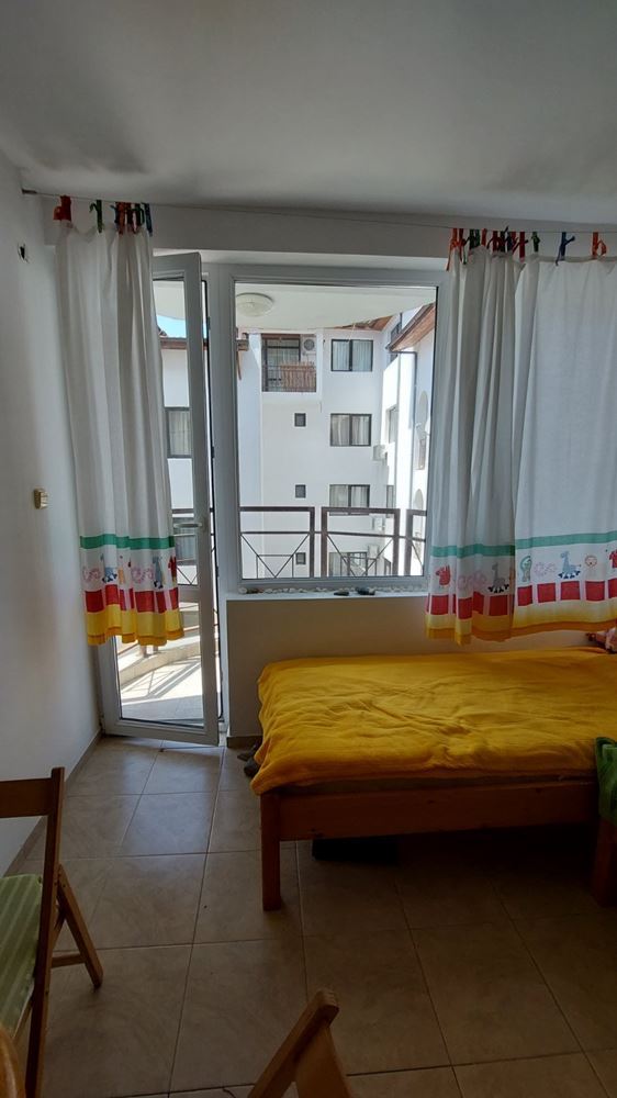 Cozy studio flat in a complex at the foot of the mountains and the sea in the prestigious area of Sunny Beach. The air in this area is phenomenally healthy as the complex is surrounded by coniferous forest on one side and the sea on the other. The complex offers many facilities from a children swimming pool and jacuzzi, to an exchange office, a safe deposit box and a snack bar. This 30m2 flat is located on the third floor. It comprises entrance hall, bathroom, kitchen-sleeping room and balcony. The apartment comes fully furnished and equipped. The studio can be used as a permanent residence, a holiday home every summer or as an investment for renting.