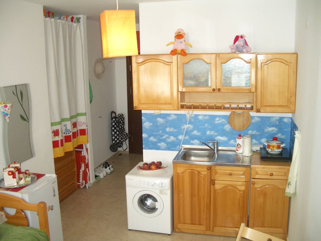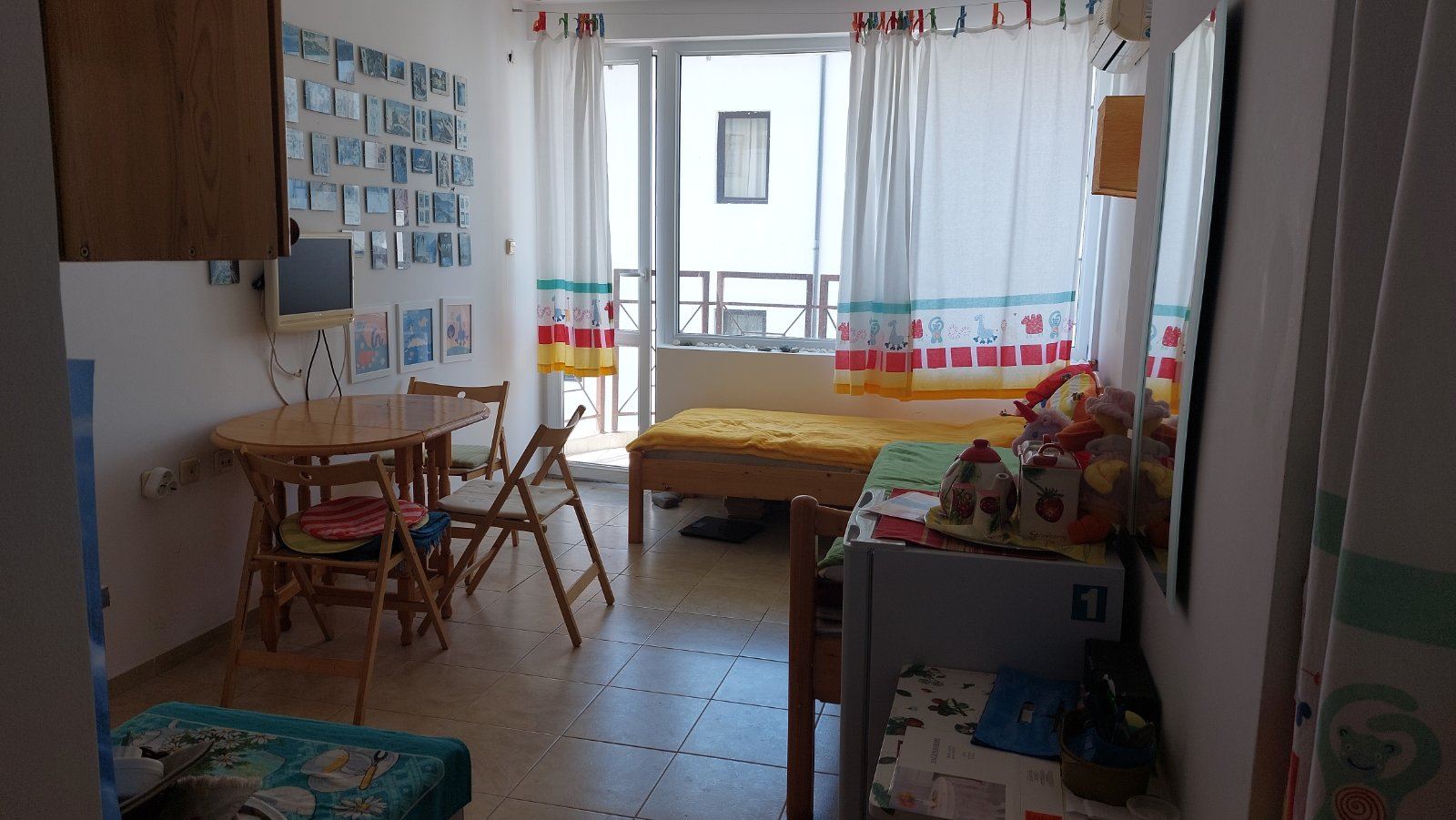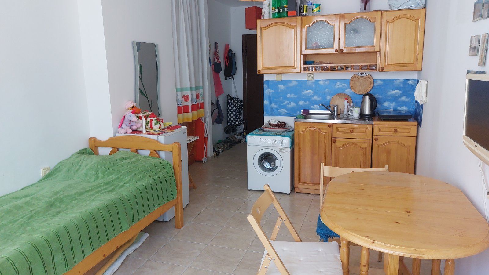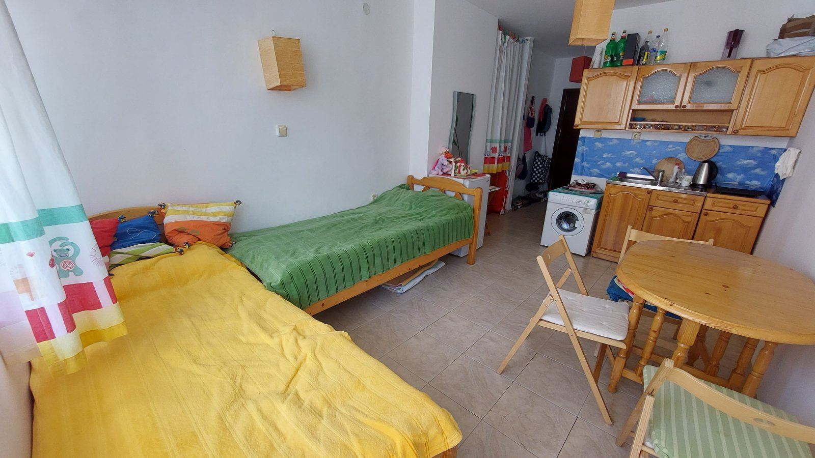 Cozy studio flat in a complex at the foot of the mountains and the sea in the prestigious area of Sunny Beach. The air in this area is phenomenally healthy as the complex is surrounded by coniferous forest on one side and the sea on the other. The complex offers many facilities from a children swimming pool and jacuzzi, to an exchange office, a safe deposit box and a snack bar. This 30m2 flat is located on the third floor. It comprises entrance hall, bathroom, kitchen-sleeping room and balcony. The apartment comes fully furnished and equipped. The studio can be used as a permanent residence, a holiday home every summer or as an investment for renting.