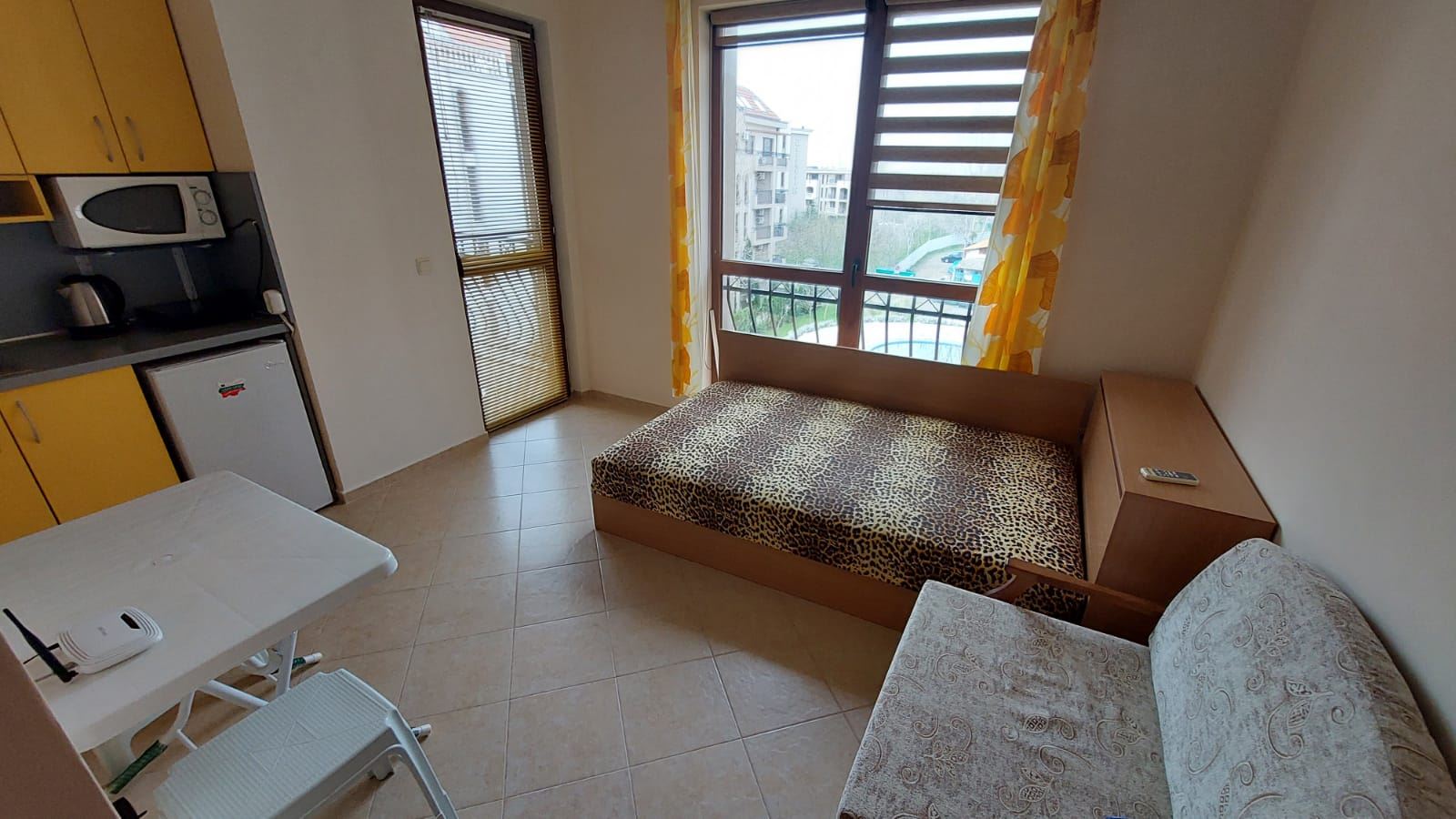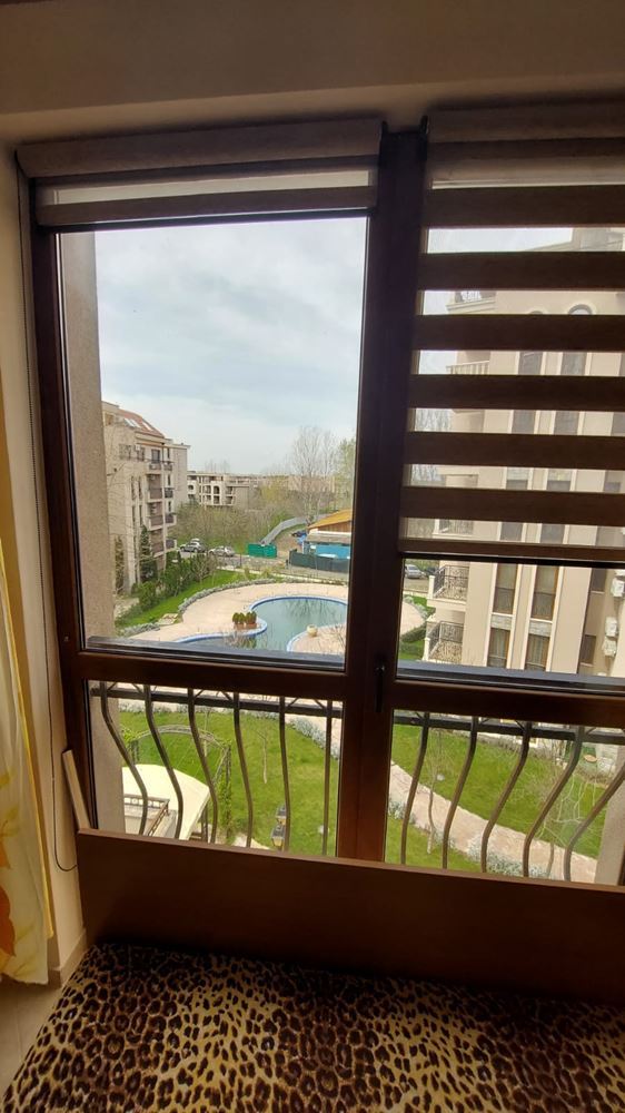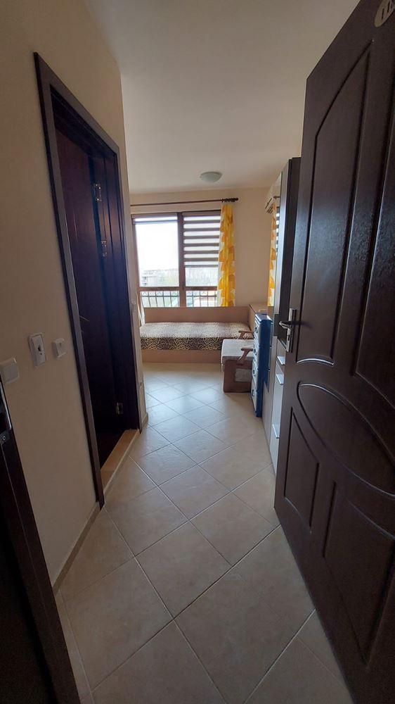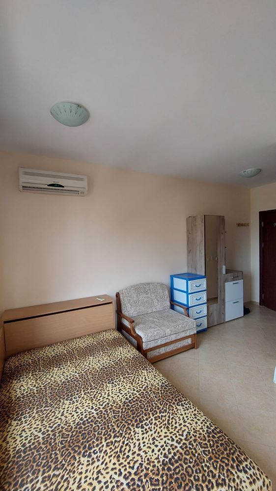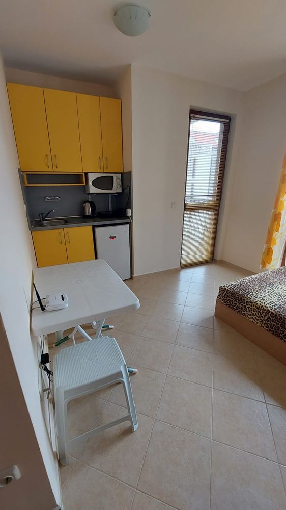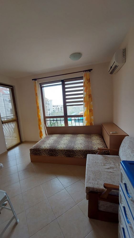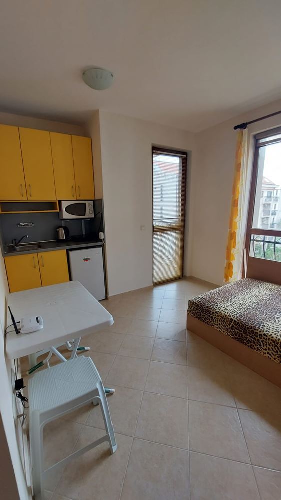 Studio type studio in a luxury complex located in the resort of Sunny Beach, 100 metres from the Aqua Park and 500 metres from the sea. The advantage of living in this complex is the access to the entertainment and facilities that are offered in the vast grounds. Residents are offered two large children's aqua parks, fitness centre, restaurant with a variety of cuisine, bar, supermarket, cinema under the stars in the open air, wellness centre with Jacuzzi, beauty salon, massage, sauna, 9 large swimming pools, playground with animator, ample parking, security and quality service. The flat is on the fourth floor, fully equipped and ready to move in.