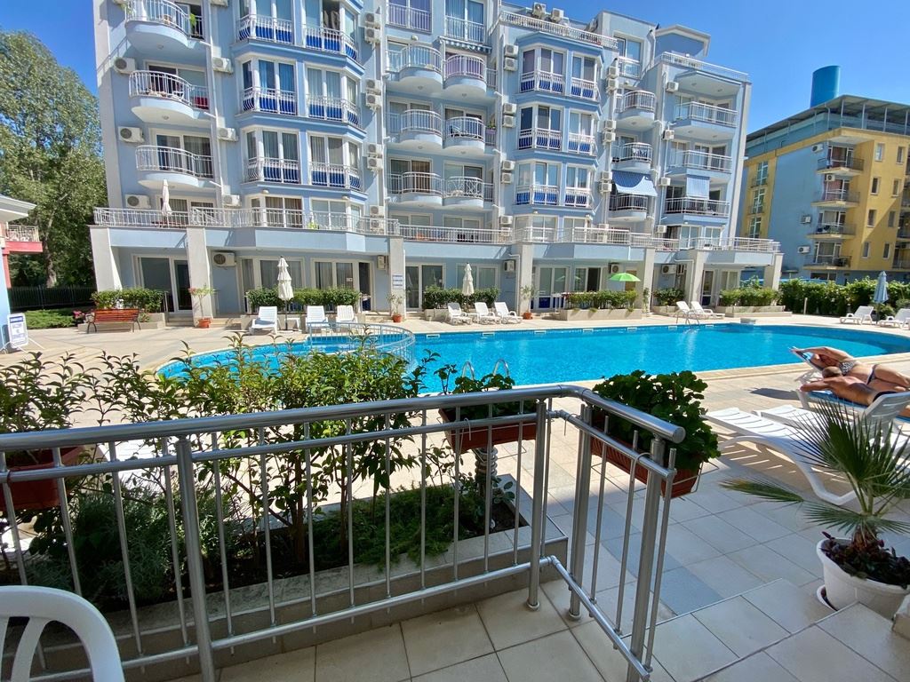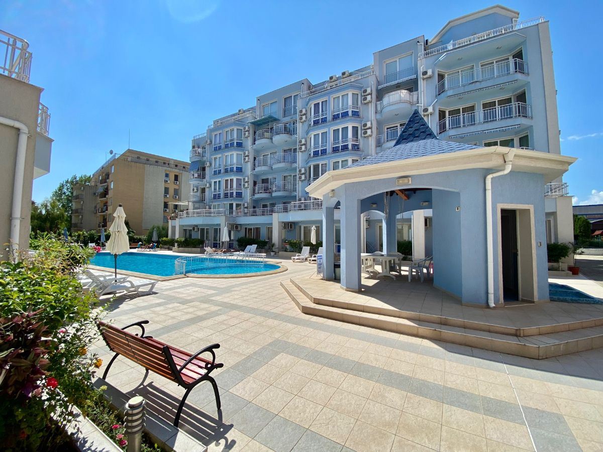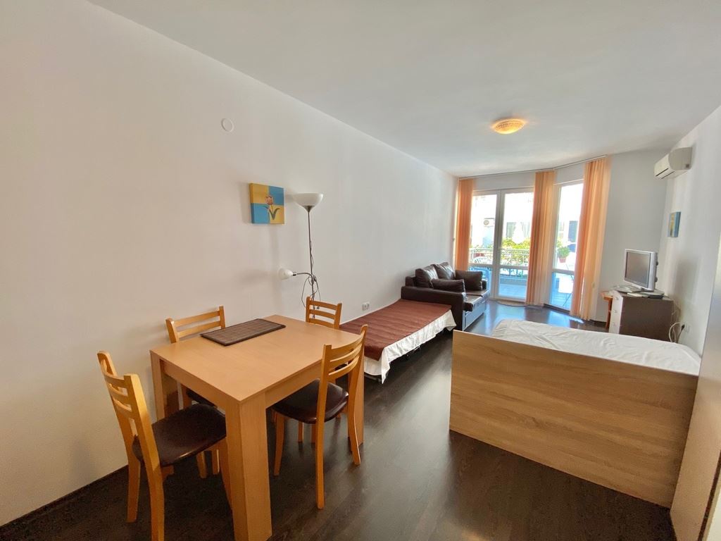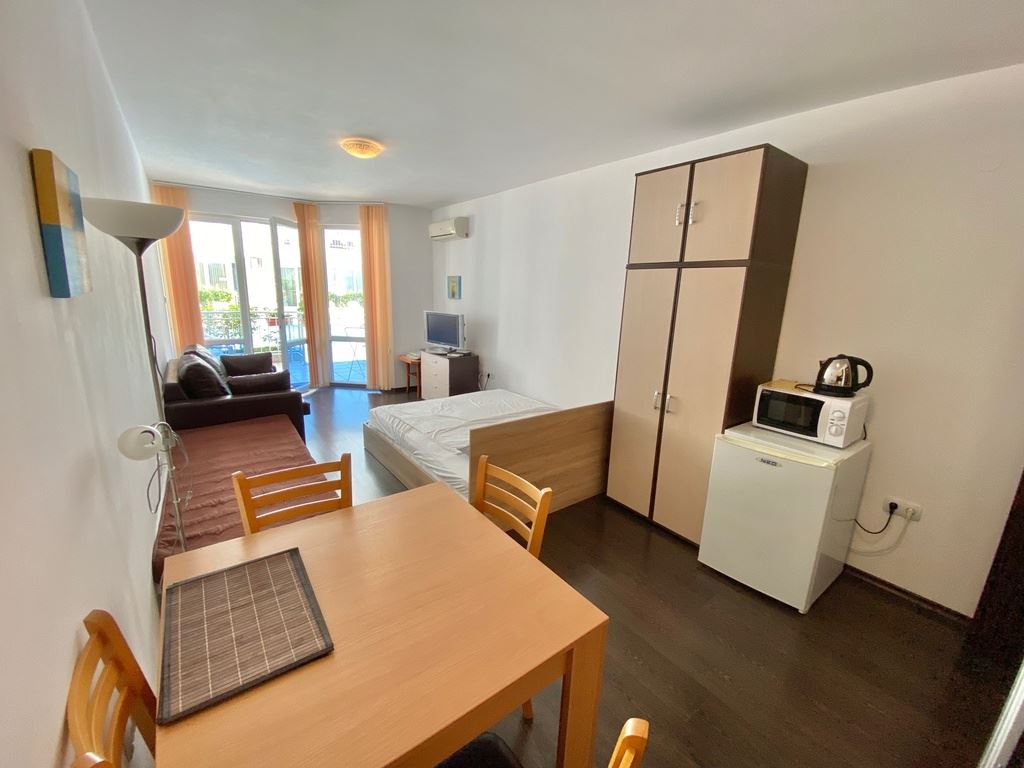 A spacious studio flat in a new development located in the resort of Sunny Beach. The studio is located on the ground (ground floor) and has a total living area of 50 m2. It consists of an entrance hall, living room with kitchen area, bathroom with shower unit and a big veranda with access to the inner yard and pool. The flat faces East. The property is sold furnished and equipped with air conditioning. The complex is located near the centre of the resort. Nearby are the shops, the most popular restaurant, cafeterias and other amenities. The sea and the beach are about 400 m away. The complex offers all the necessary conditions for both summer holidays, and for a comfortable permanent residence all year round, commissioned in 2012.