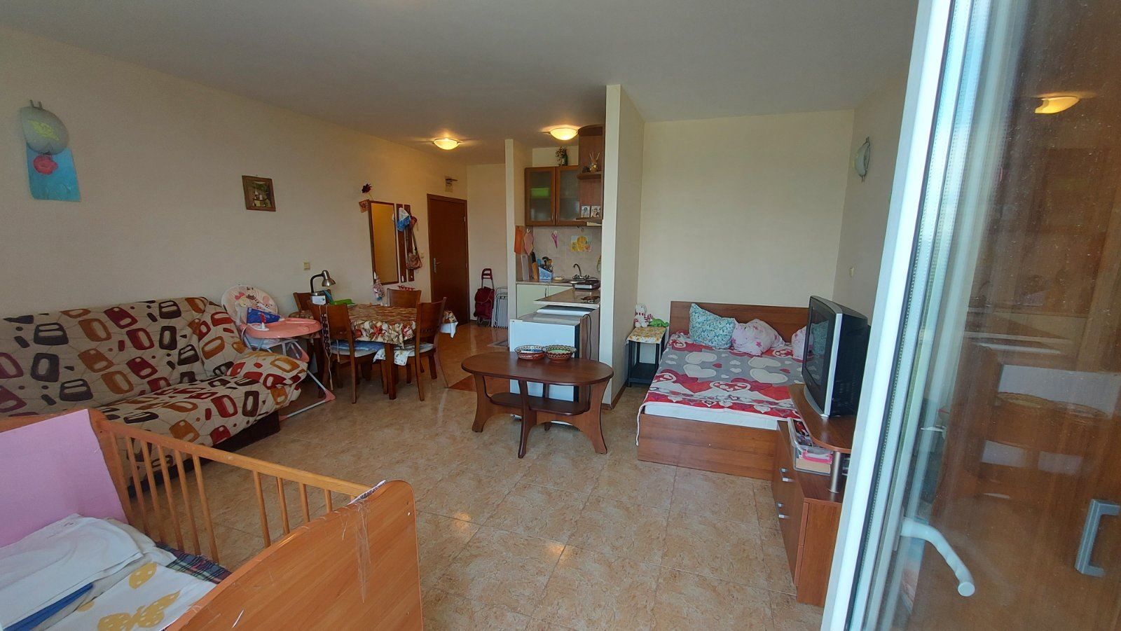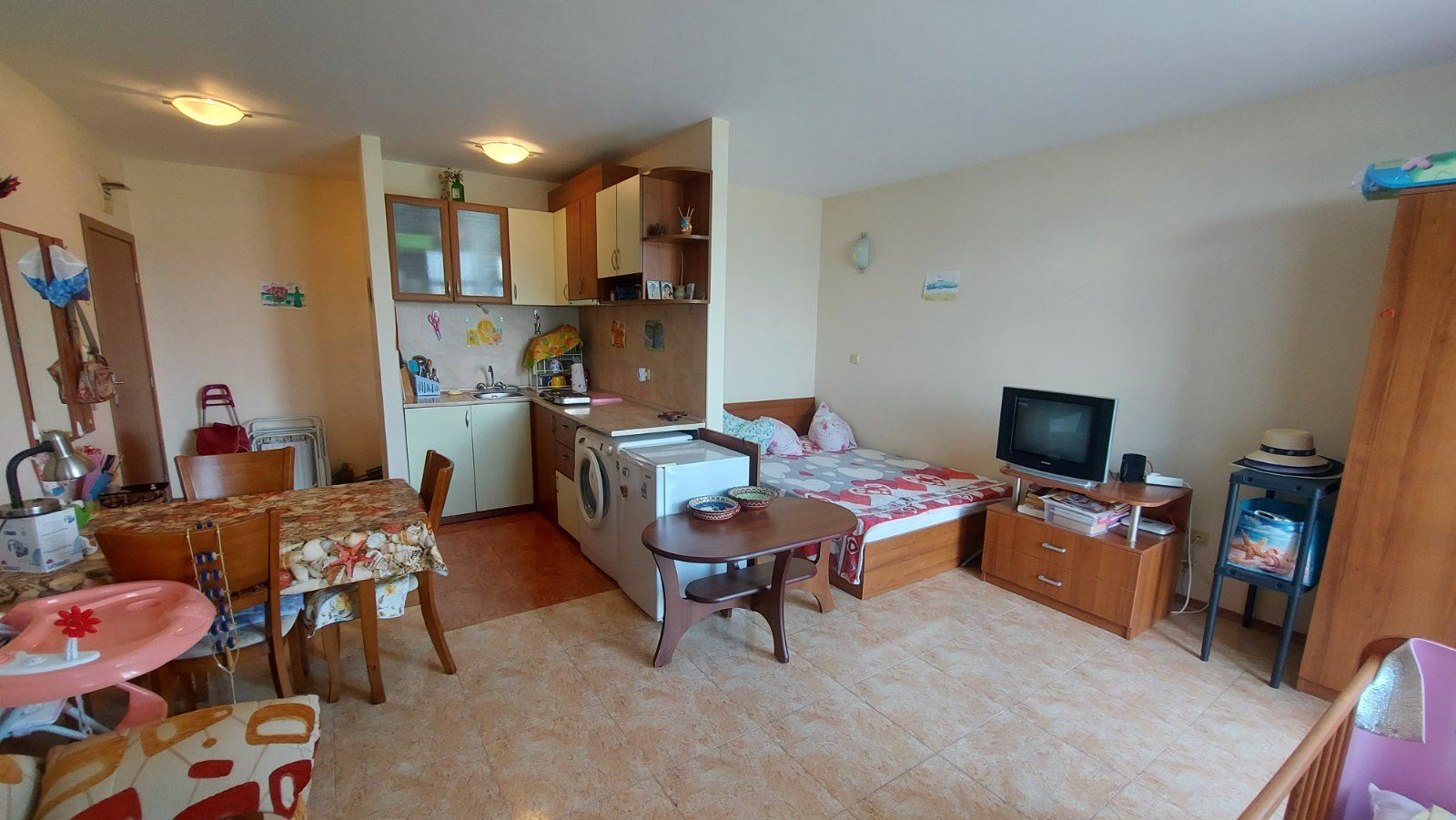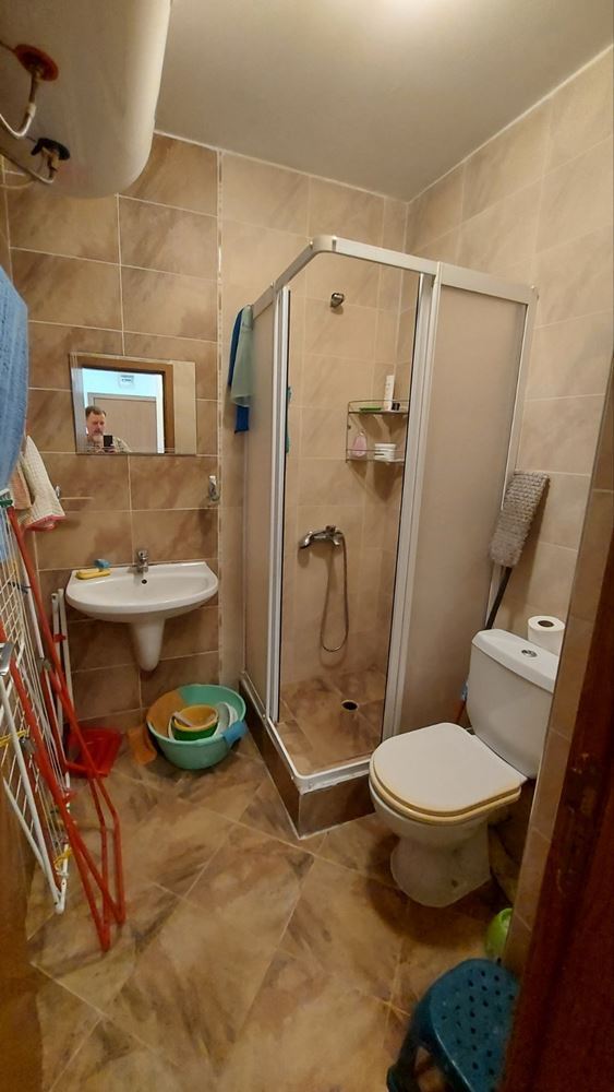 Large studio in a gated complex located 400m from the sea in Sunny Beach. The location of the complex is very good as it is a short walk to the famous Cacao Beach and also just a couple of kilometres from the town of Nessebar, an ancient museum city, a UNESCO World Heritage Site. Due to this proximity tourists often choose these flats for rent. The flat with total area of 54 m2 is located on the first floor. It consists of a living room with kitchenette, bathroom with shower and WC and a balcony. The flat is sold fully furnished and equipped. The complex has a big swimming pool, children playground, fitness room, restaurant, pool bar, year-round security, underground parking.