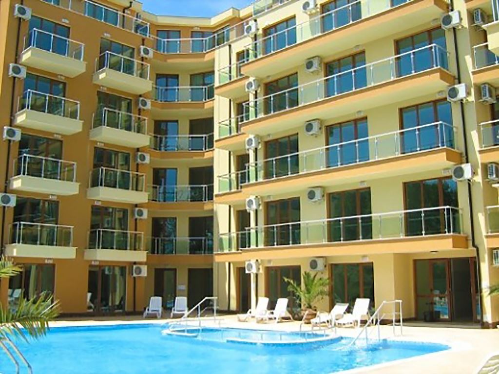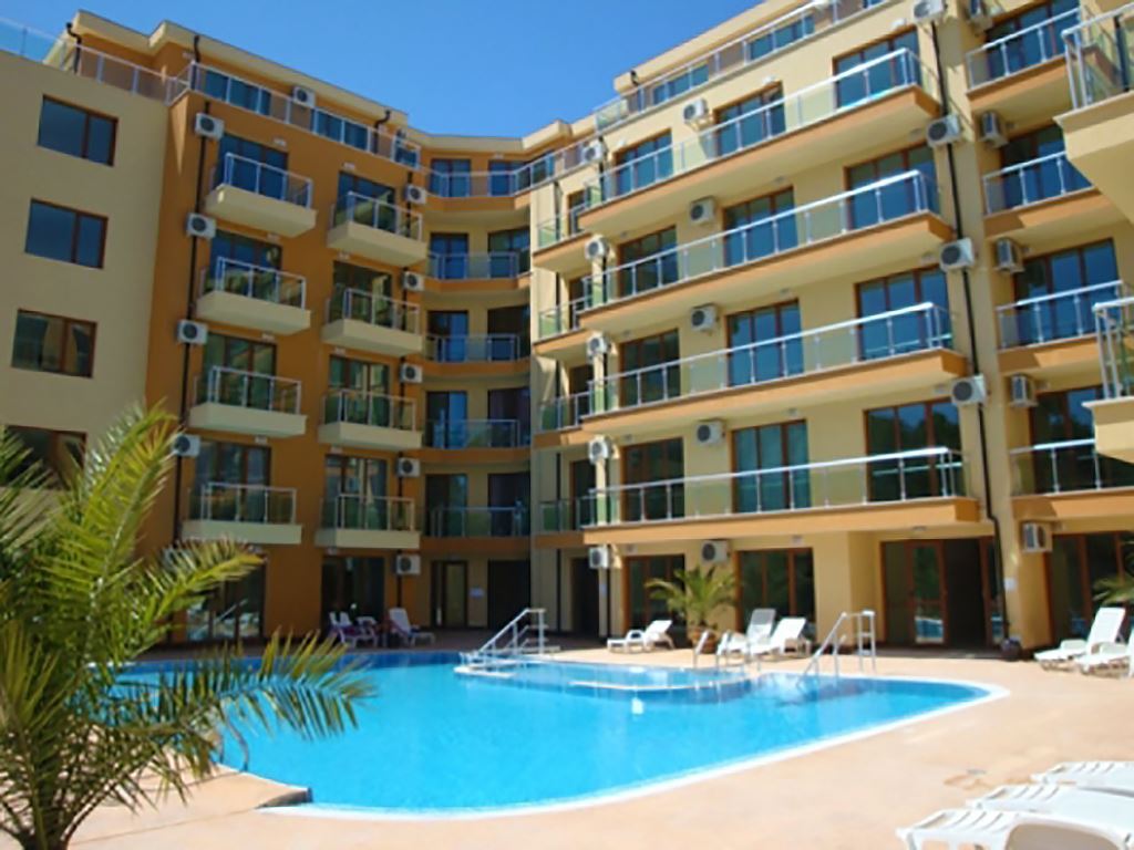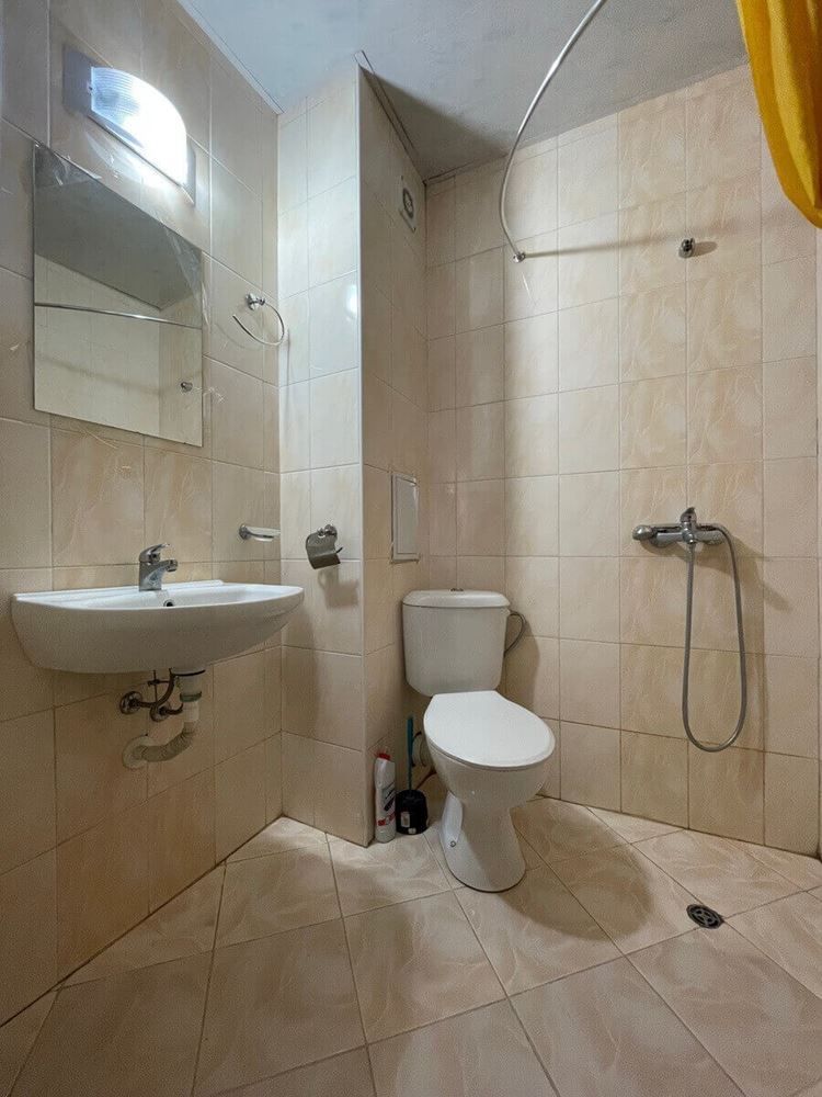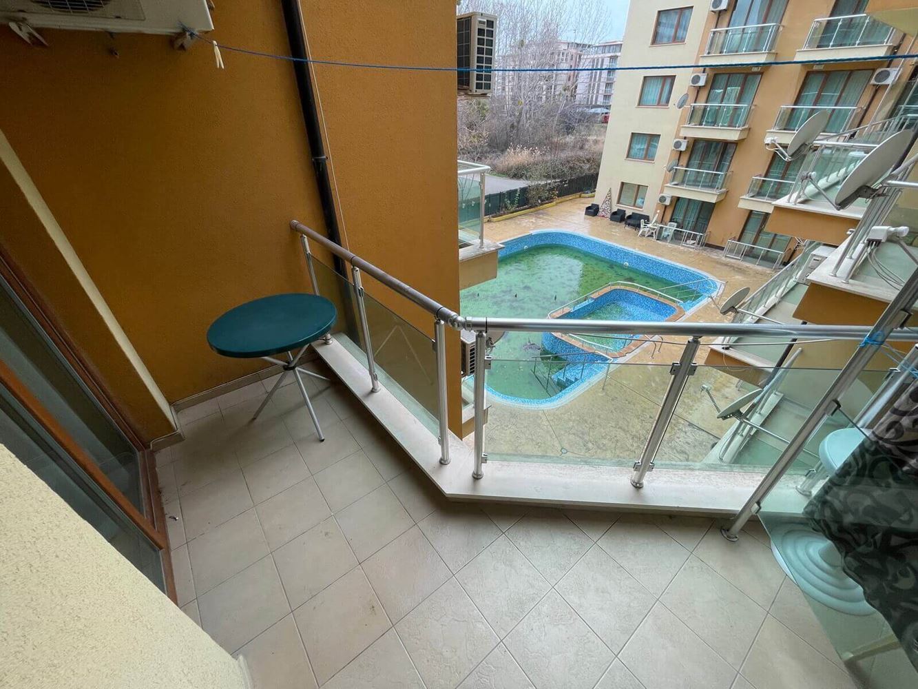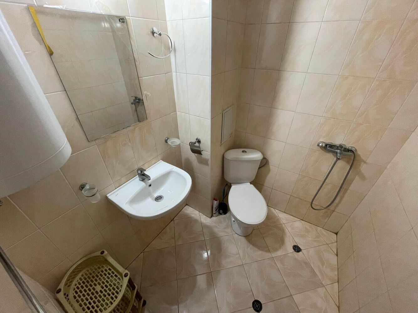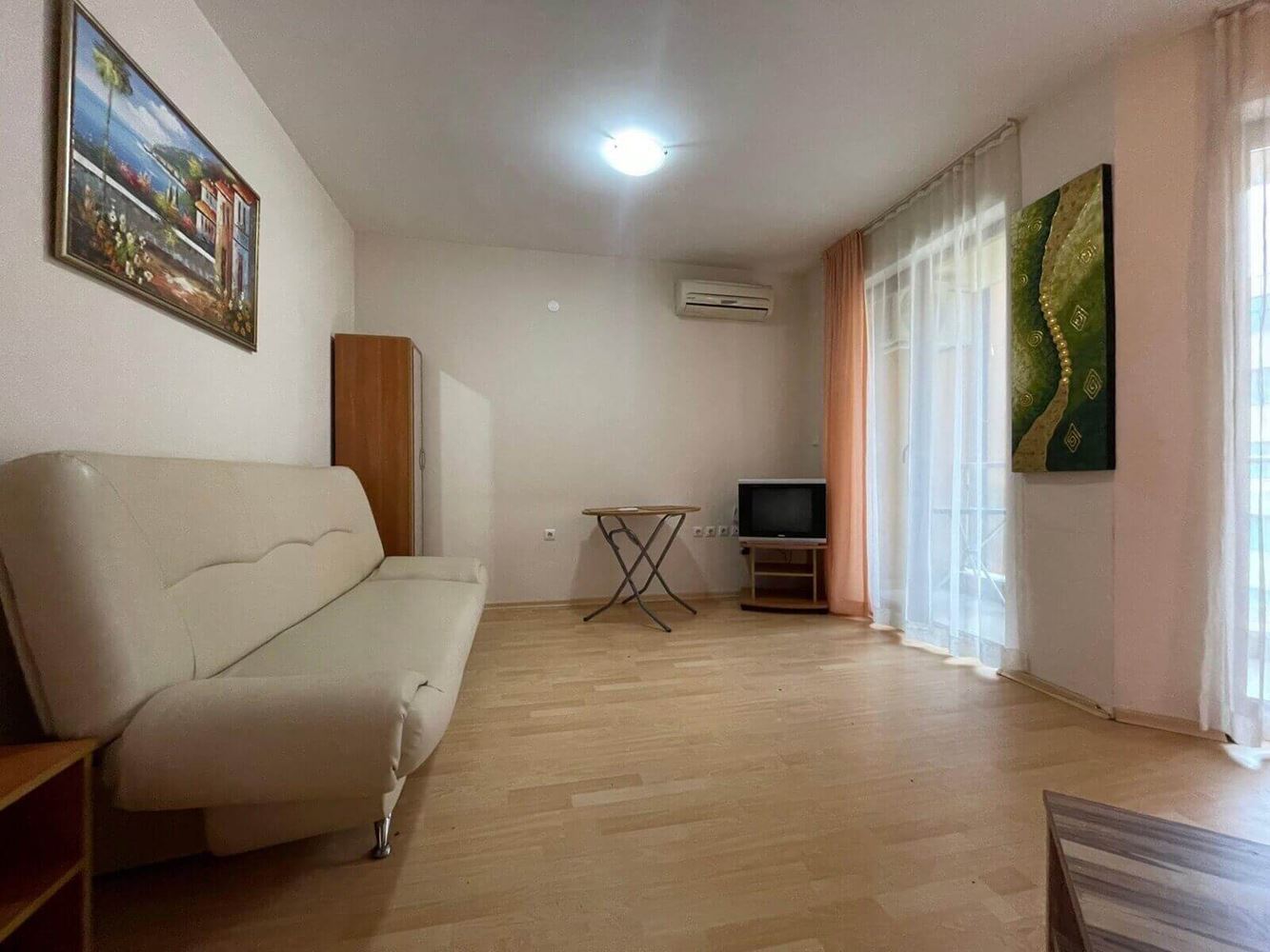 Studio in a quiet and peaceful area of Sunny Beach. The 35m2 flat is located on the third floor. It consists of a hallway with kitchen area and sleeping area, bathroom with shower and toilet and a terrace. The studio is for sale fully furnished and equipped. The beachfront and lively seafront street are a short walk away, about six minutes walk. The complex has a swimming pool, free parking and landscaped grounds. Quiet and peaceful living is guaranteed.
