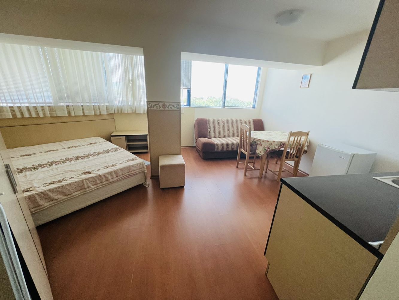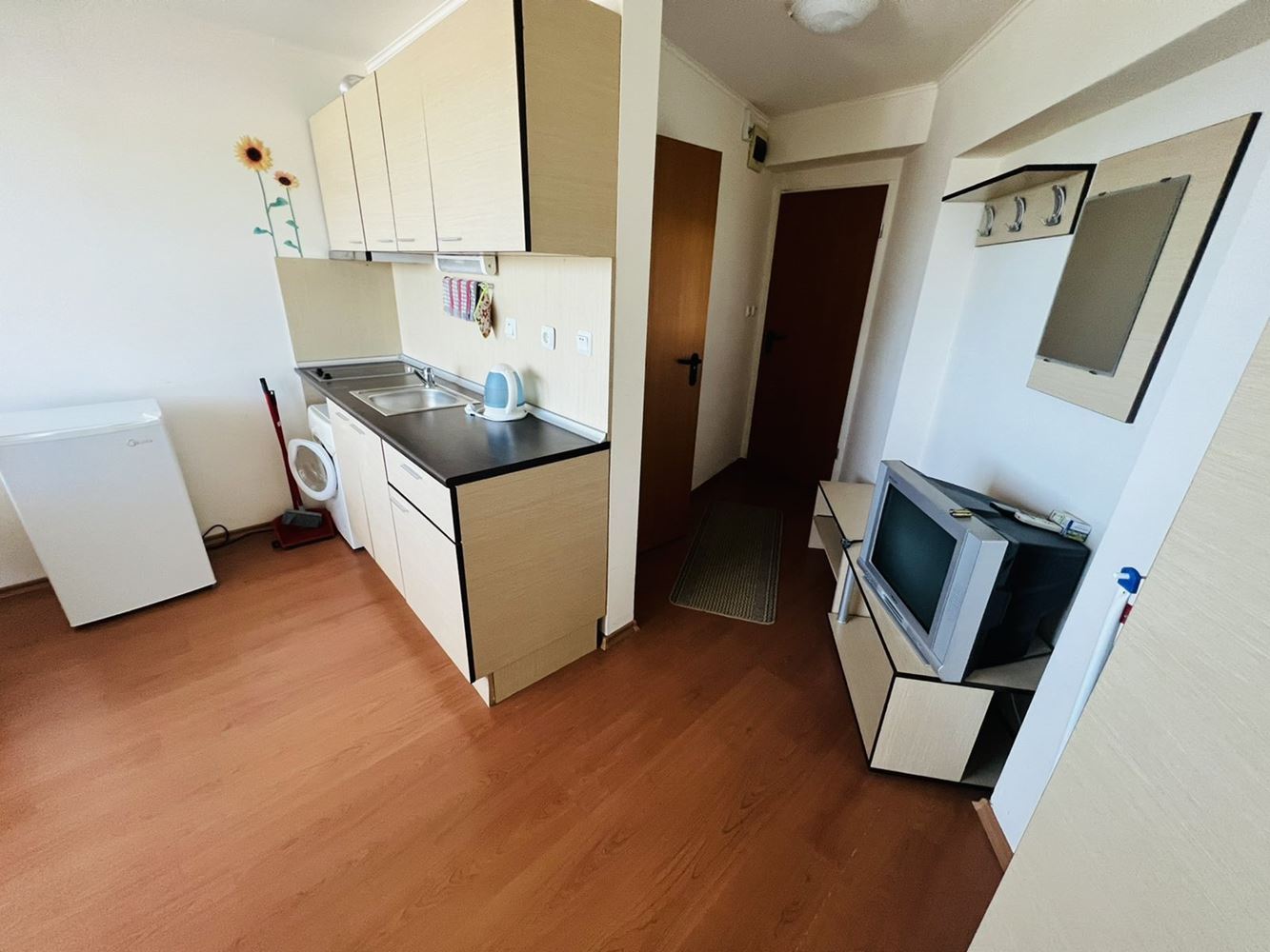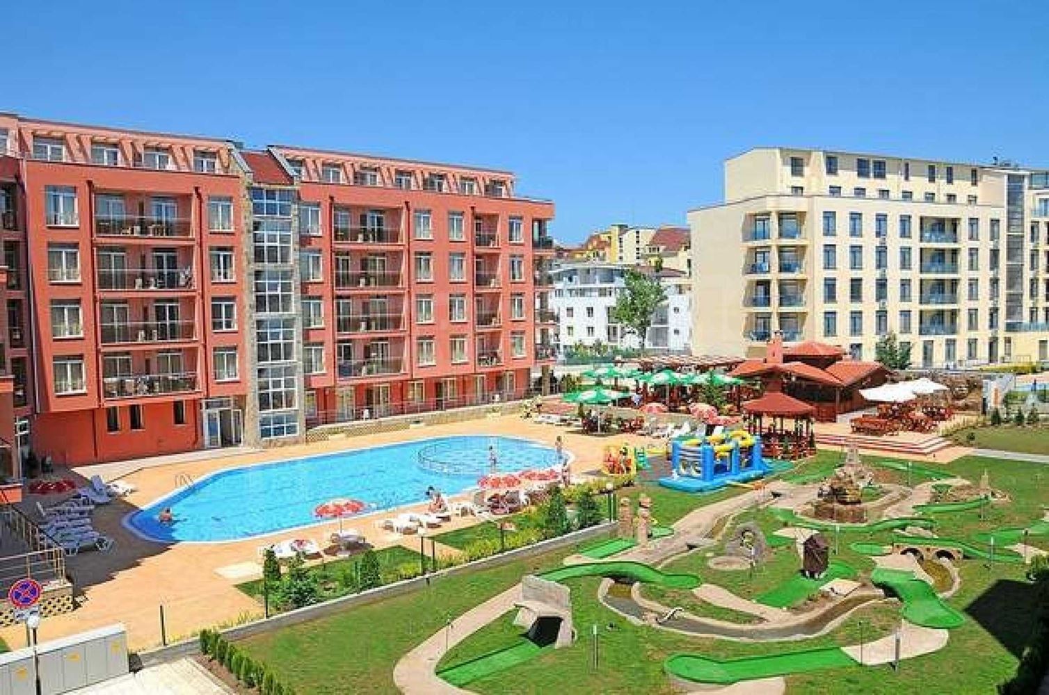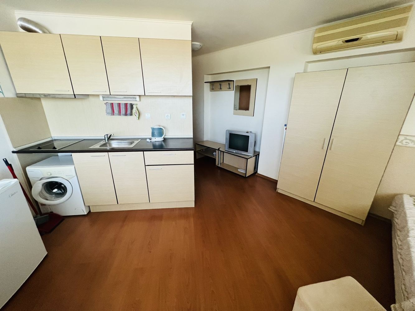 Comfortable spacious studio flat in a complex located in Sunny Beach. The complex is located 200 metres from the coast, a five to six minute walk to all infrastructure. The flat is fully furnished and equipped. The complex is well equipped, guarded and monitored all year round. The large complex has a swimming pool, children's pool with waterslide, lobby bar, restaurant, barbecue area, sauna, fitness area with fitness equipment, playground, golf area, shops, pharmacy. The flat has a living area of 35.98 m2 on the fifth penultimate floor. The bathroom is fully equipped with all necessary sanitary fittings. The flat is equipped with air conditioning.