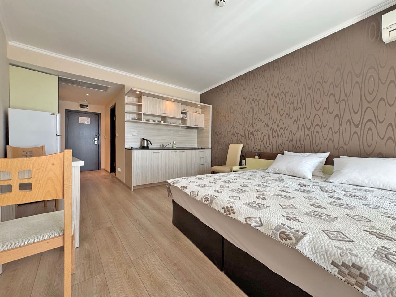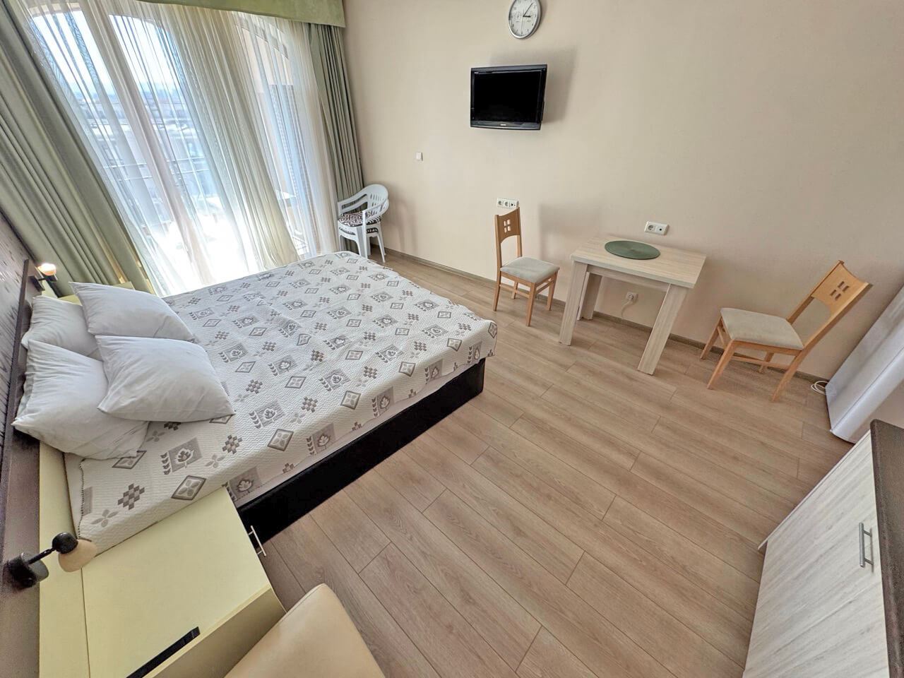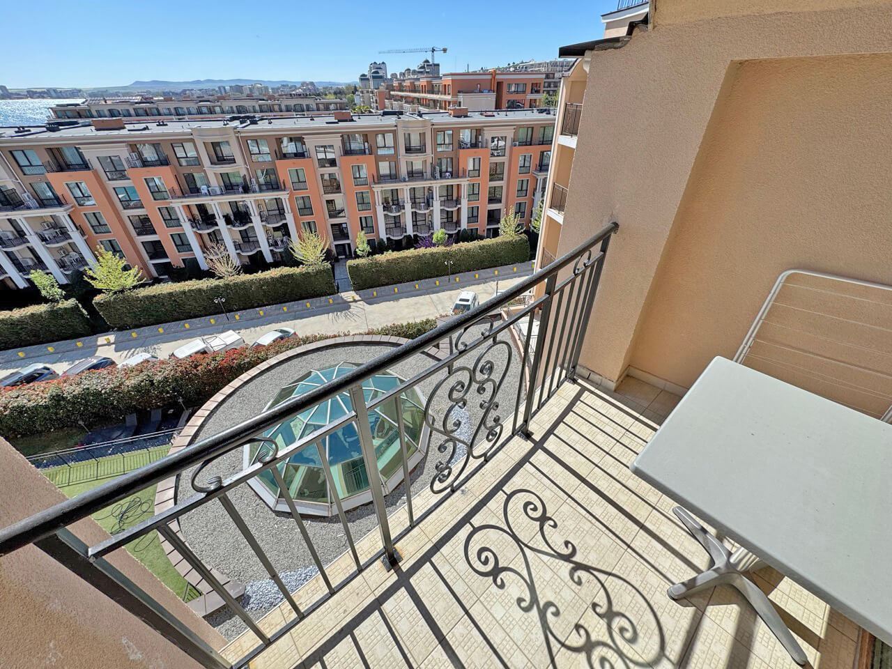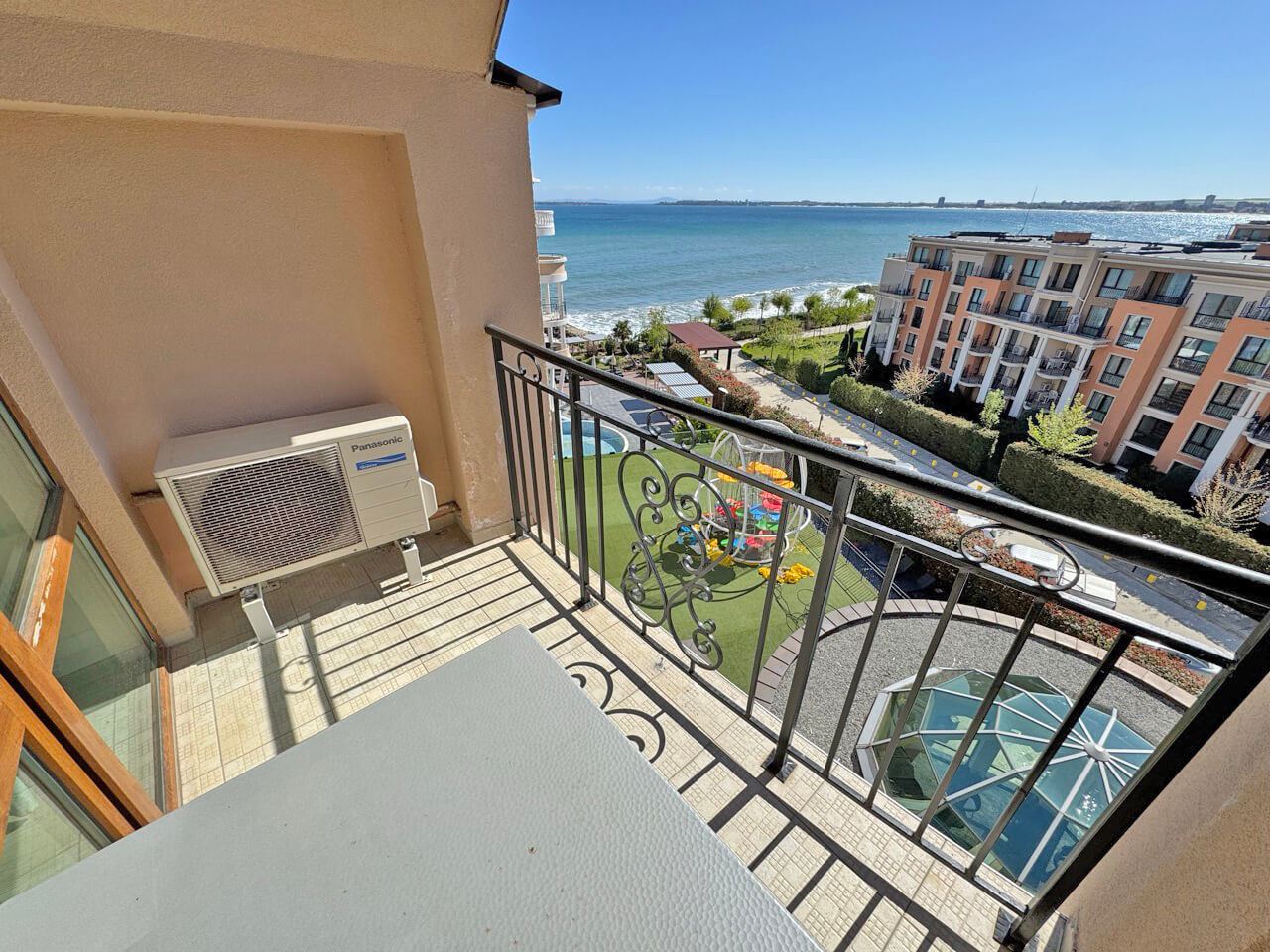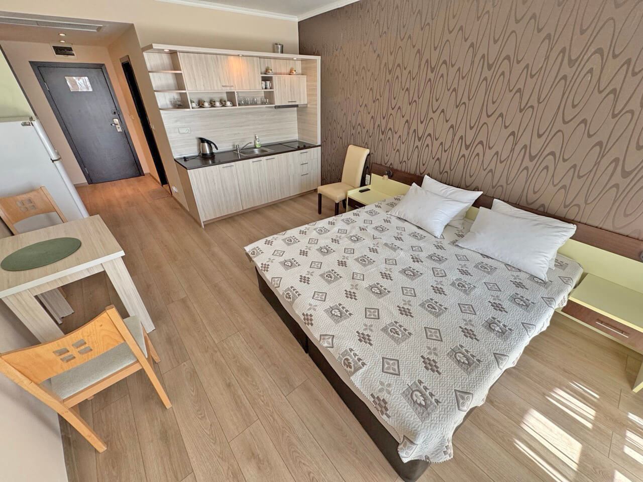 We offer for sale a lovely studio located in one of the most attractive complexes in the beginning of the town of. The complex is located in one of the most attractive studios in Sveti Vlas. This is the perfect place for people looking for a cozy and peaceful haven with a modern twist and a host of amenities in one place. The studio is located on the fifth floor in a building with elevator and offers a total area of 44 m², including a spacious room, a functional bathroom and an exquisite balcony from where you can enjoy the gentle sea breeze and the wonderful view of the sea and the complex.
