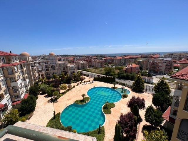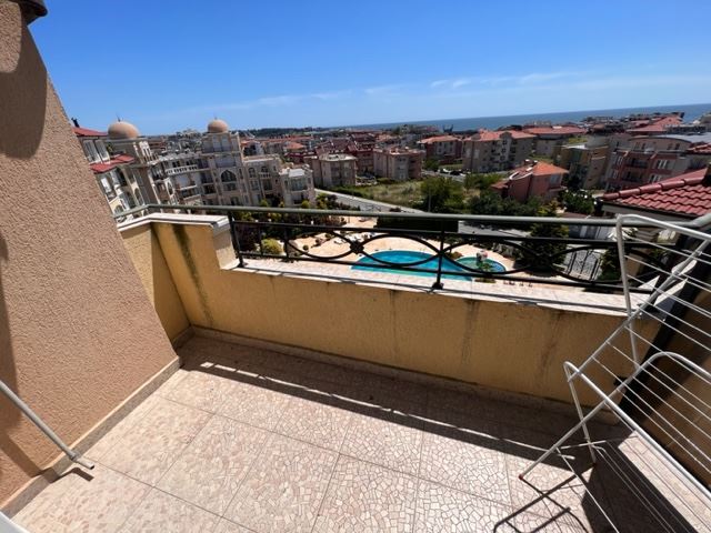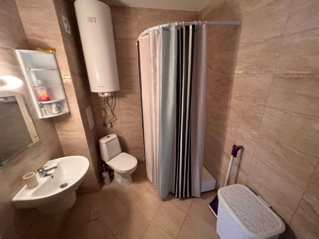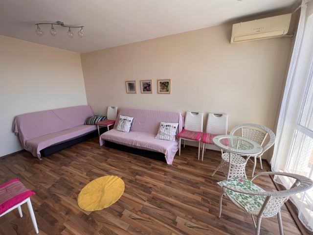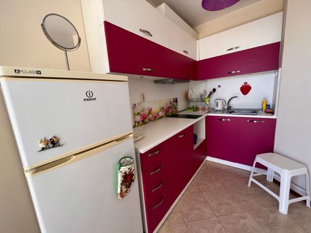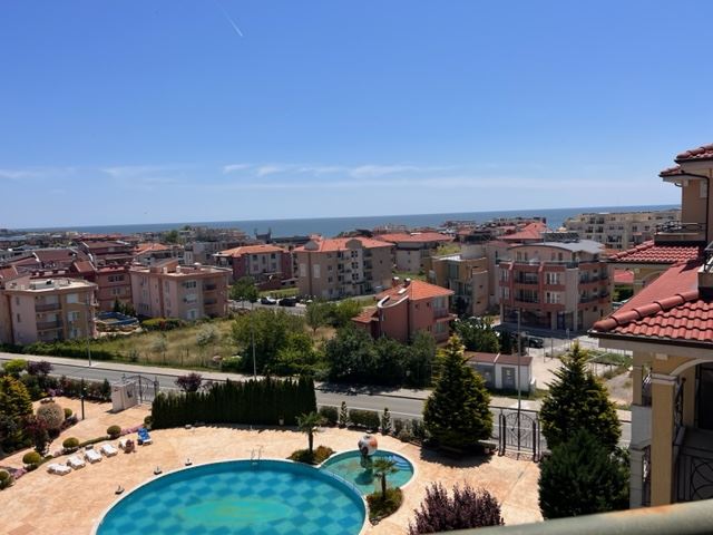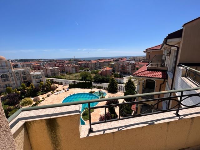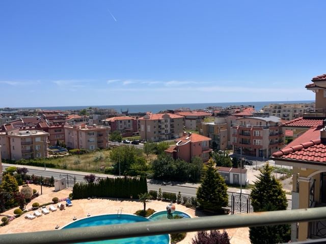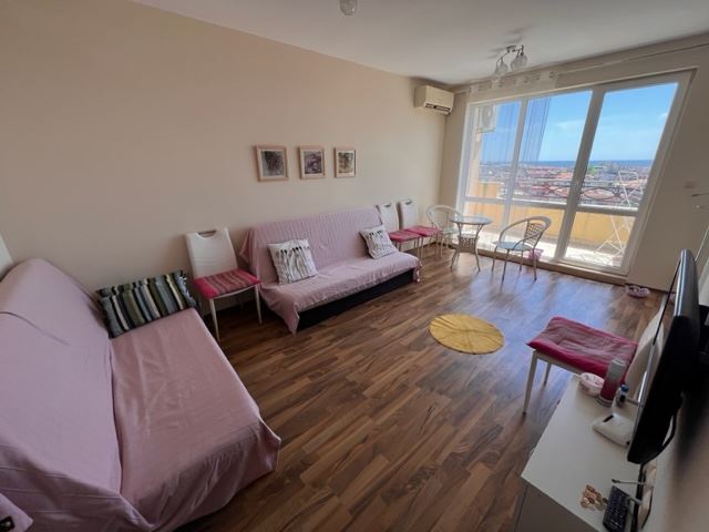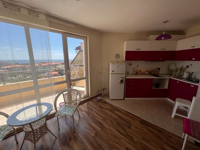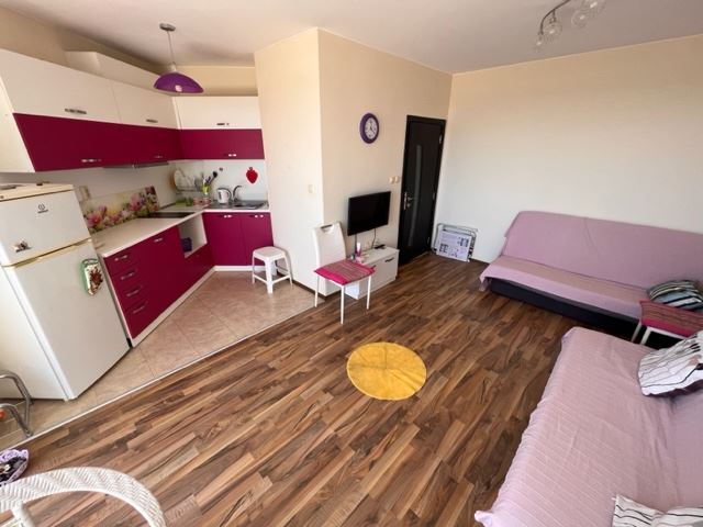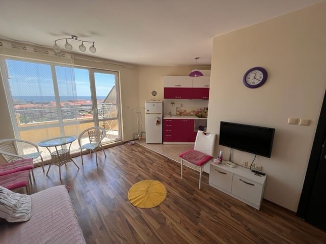Studio with sea view in the cozy seaside town of Ravda. The flat is located in a small complex 500 m from the sea. Nearby is the main street of Ravda and the bus stop. The flat is located on the last sixth floor and its size is 44m2. There is a lift in the building. It consists of an entrance hall, living room with open plan kitchen, shower room with toilet and a terrace. The property is fully furnished. The lounge is air-conditioned. TV and internet are available. The complex is gated. The owners have at their disposal two swimming pools for children and adults, a landscaped courtyard and parking.
