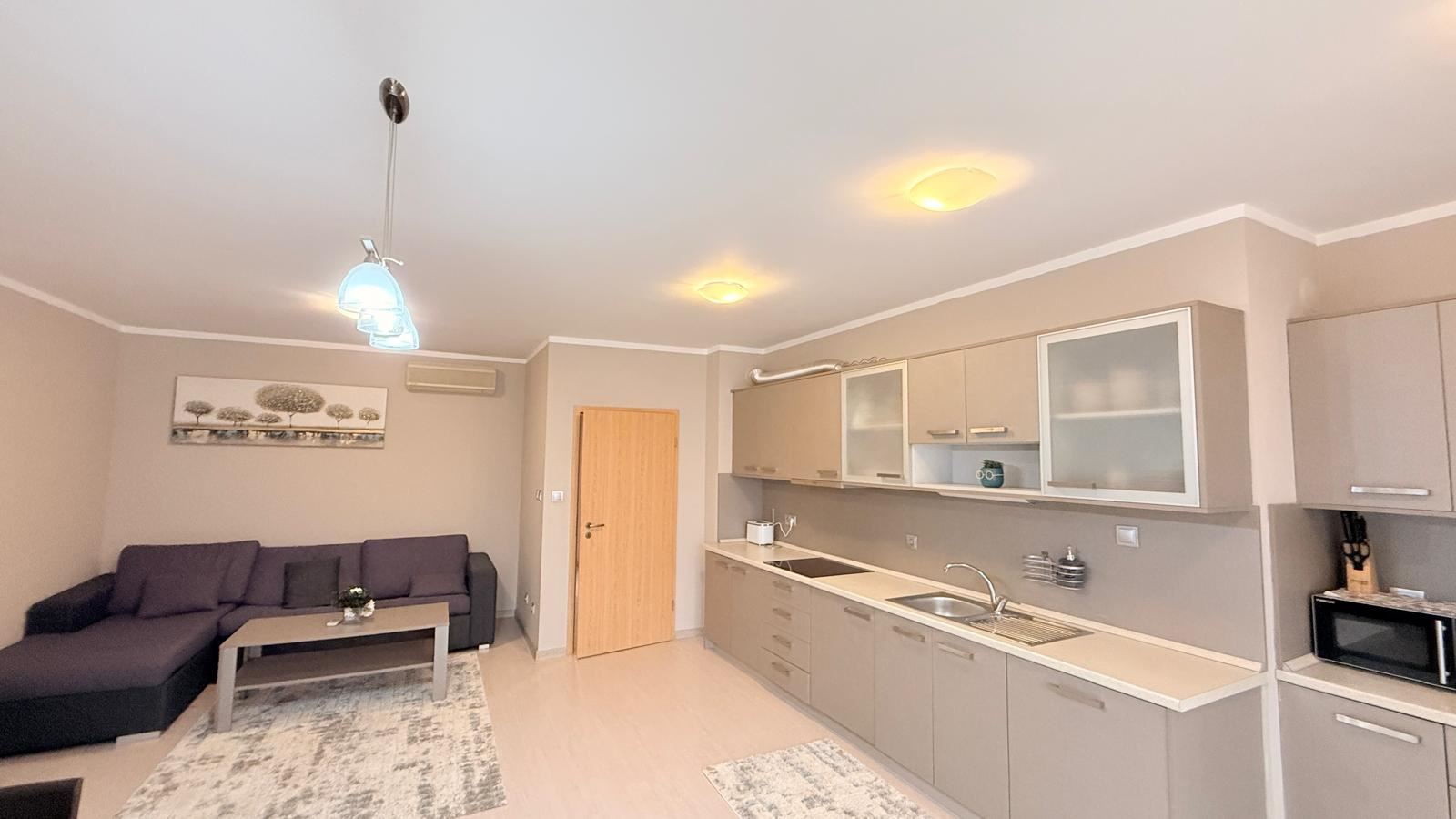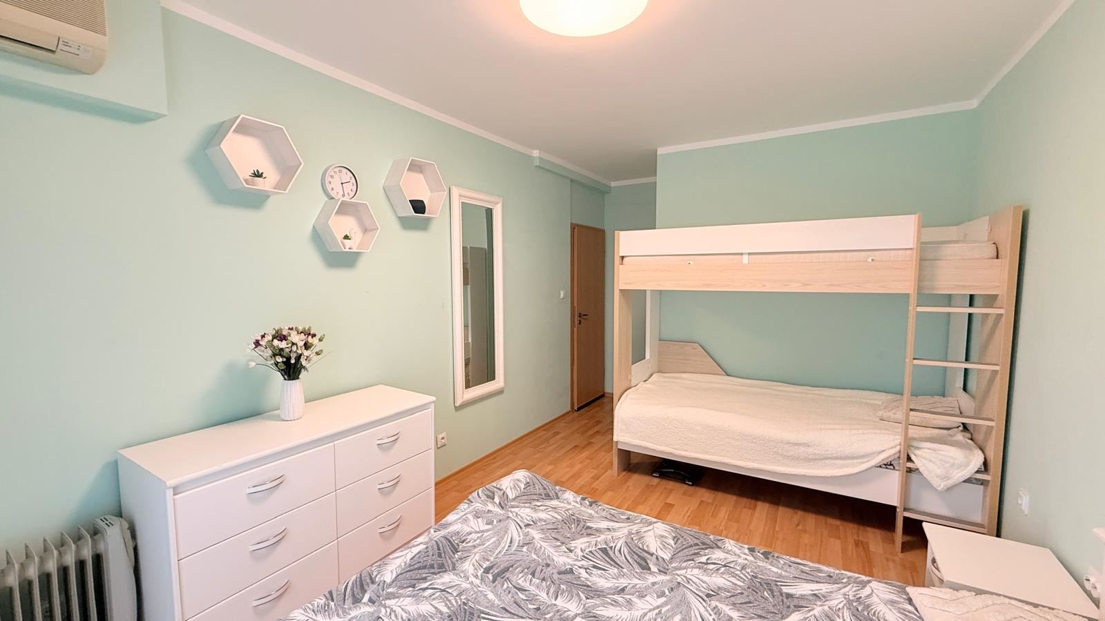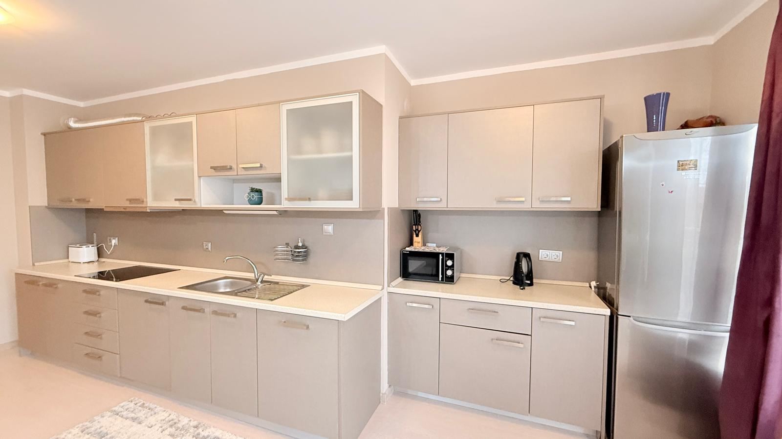 The apartment impresses with a functional and comfortable layout, designed with the needs of a modern family in mind. The spacious living room with kitchen is bright and cozy, featuring a completely new, modern kitchen, equipped with brand-new electrical appliances, as well as stylish furniture selected with attention to detail. From the living room, a beautiful sea view opens up, creating a sense of space and tranquility.