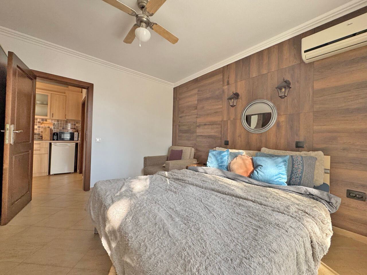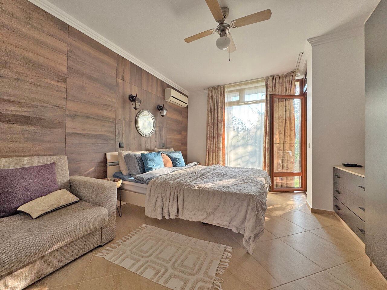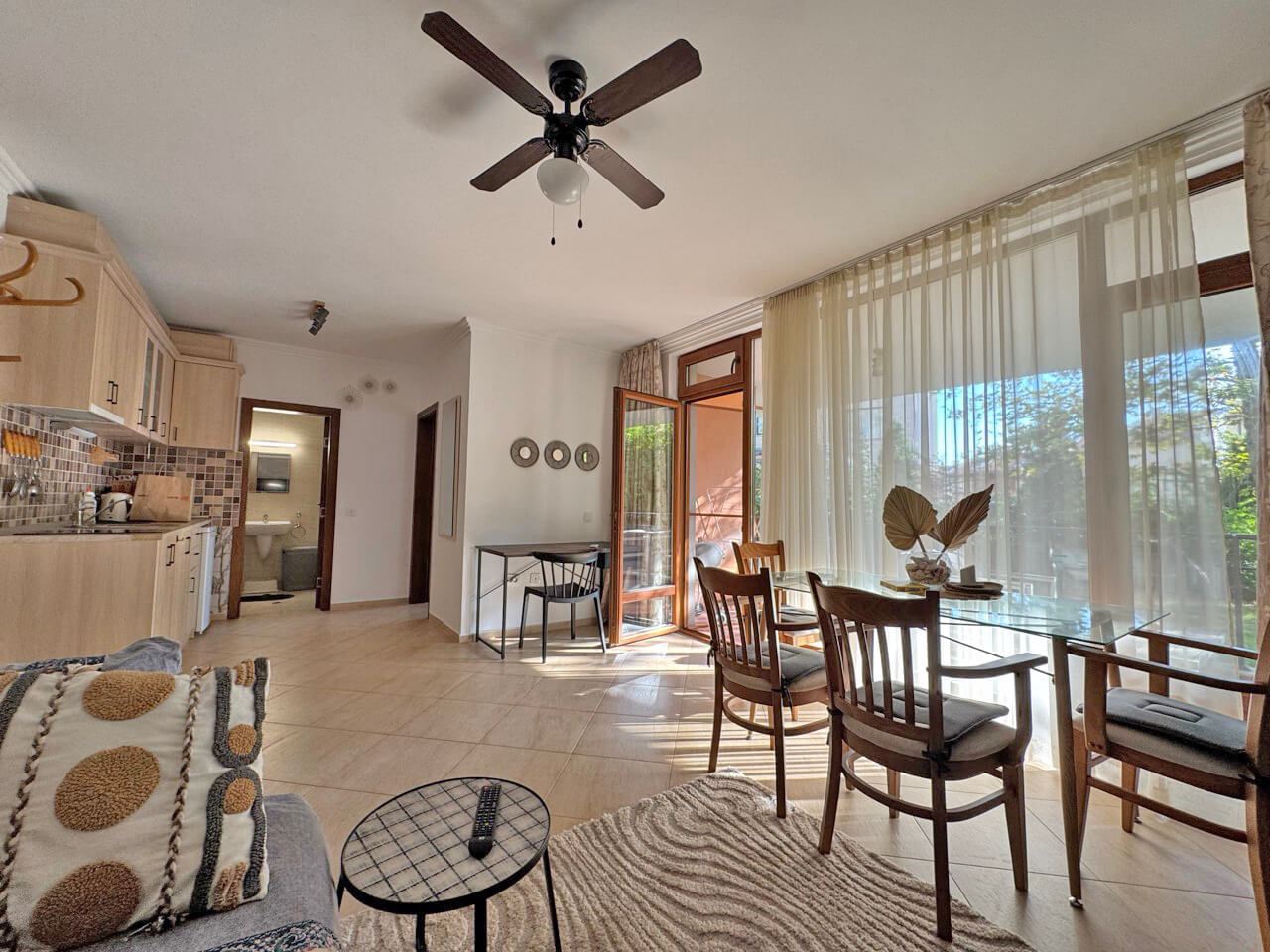 We present a bright, well-maintained and fully furnished one-bedroom apartment on the ground floor, with a total area of 66 m², located in one of the most sought-after complexes in Sveti Vlas. The apartment is ready for immediate move-in – carefully selected furniture and décor create a cozy atmosphere, while large windows provide plenty of natural light throughout the day. The layout is practical and convenient: a spacious living room with kitchenette and dining area, separate bedroom, modern bathroom with WC, and a terrace with direct access to the landscaped garden of the complex. The functional floor plan makes the property suitable for both permanent living and holiday use or rental.