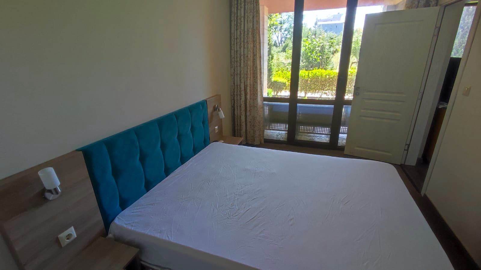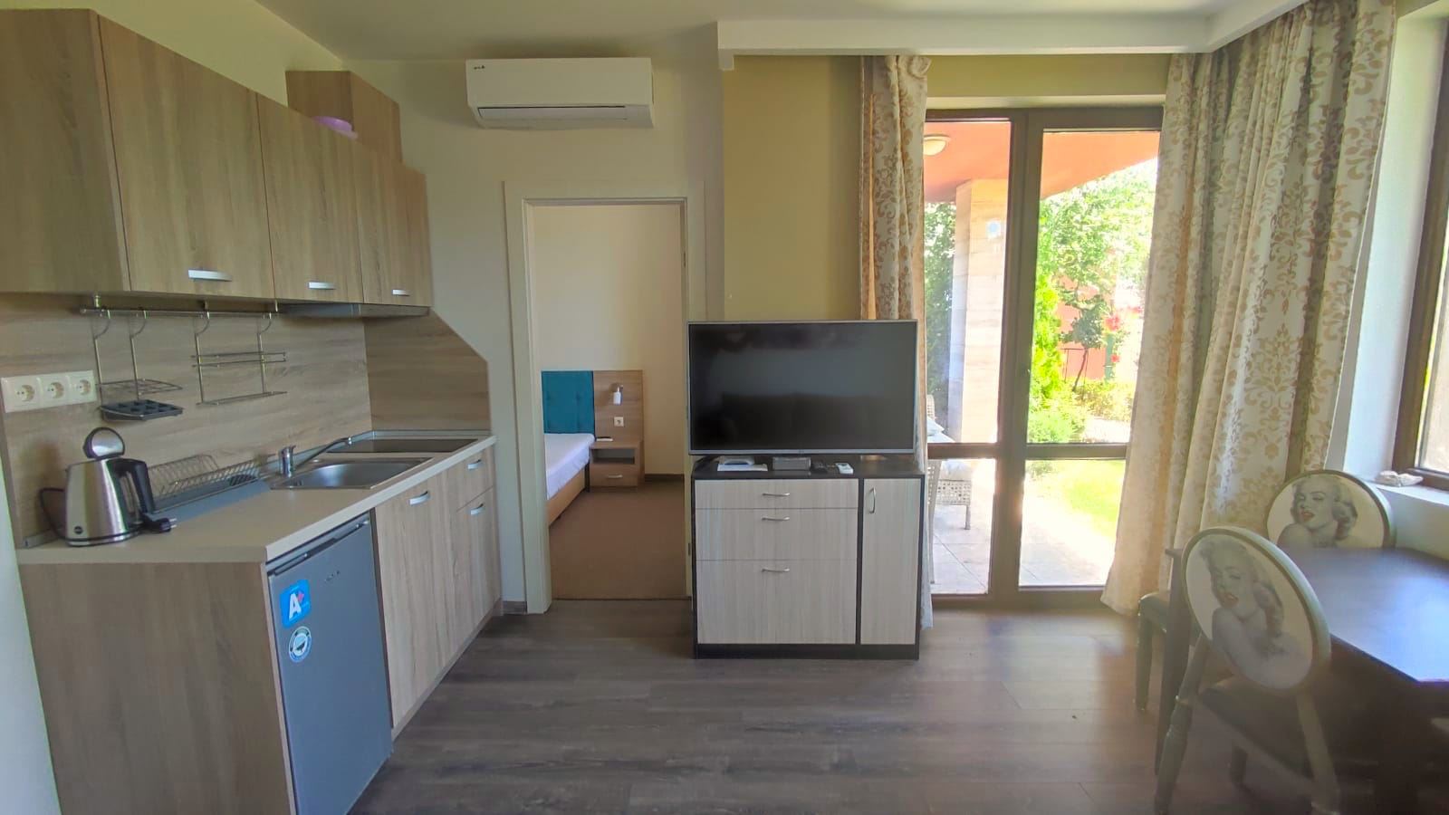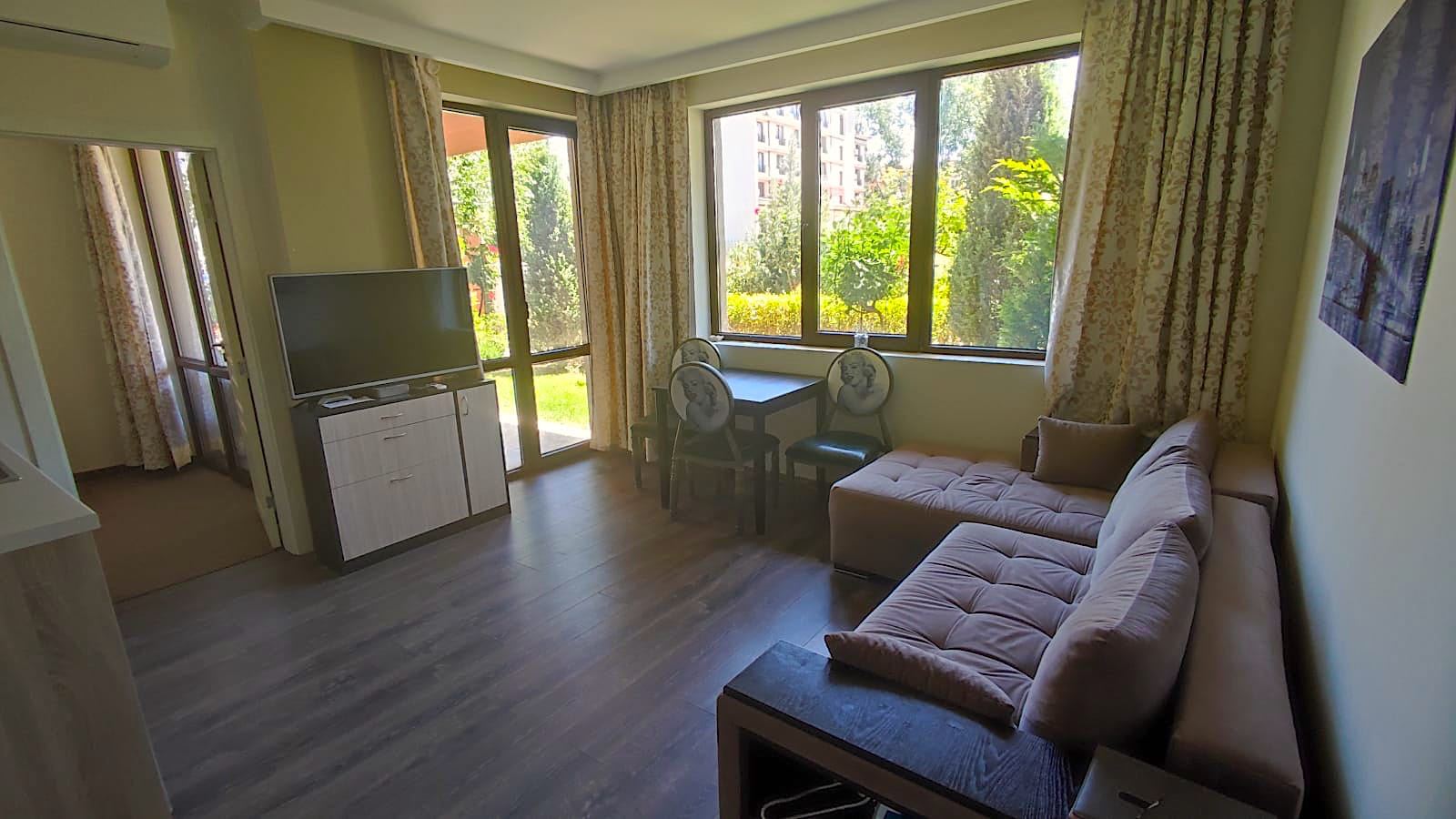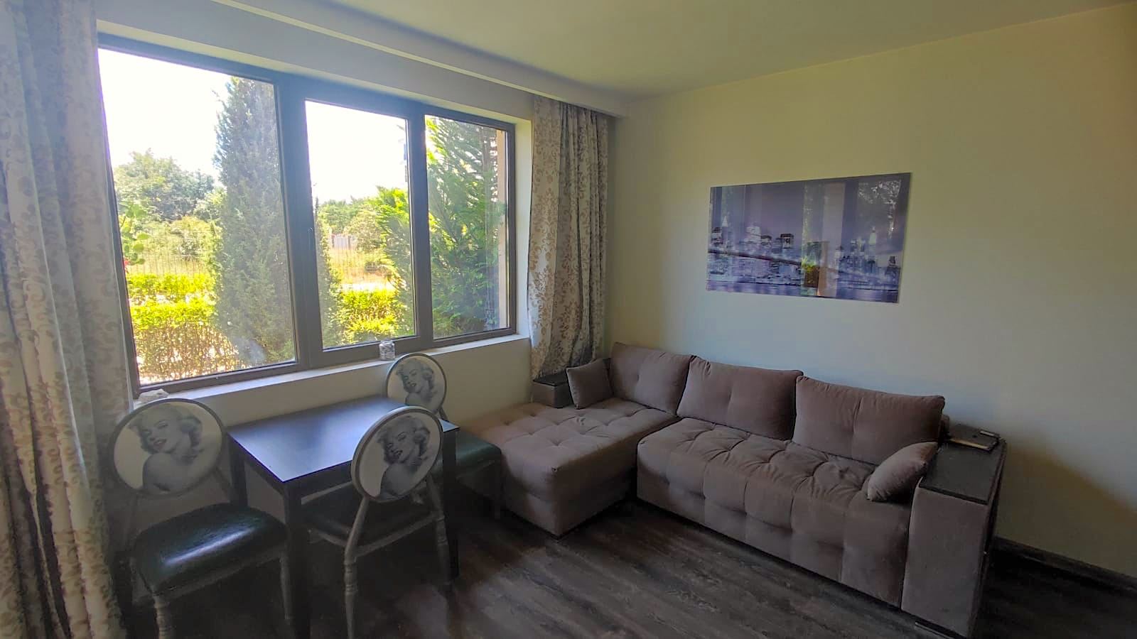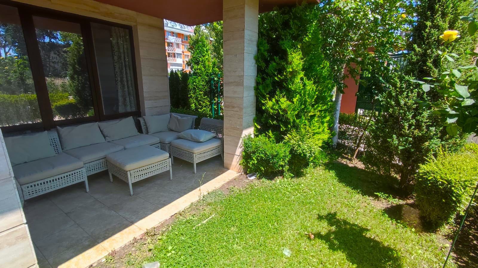 One-bedroom flat in a magnificent complex located 500 metres from the beach. The flat with a total floor area of 65 m2 is located on the ground floor of a low rise building and has an excellent floor plan. The flat is fully furnished and equipped with all white goods. It consists of an entrance hall, living room with kitchen area, a separate bedroom, a bathroom with shower unit and a big veranda with an exit to the private fenced yard. The complex is one of the most beautiful and elegant in Sunny Beach. It is located in the green part of the resort and has a great area with internal infrastructure.