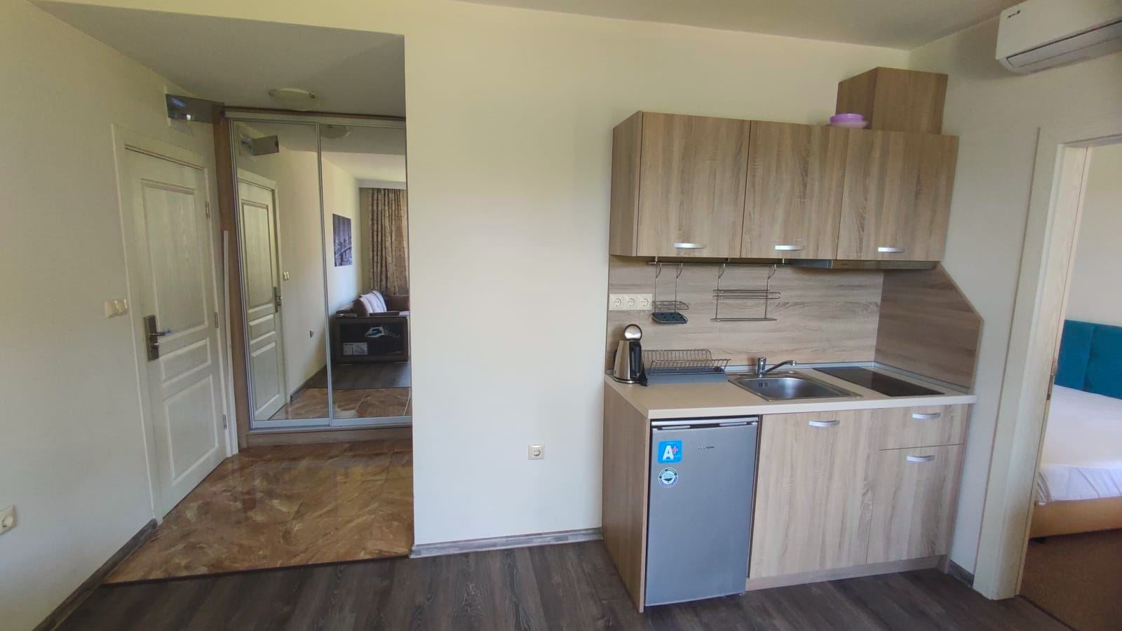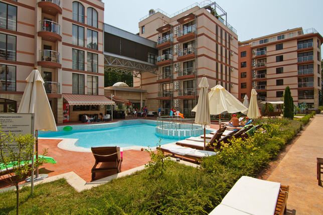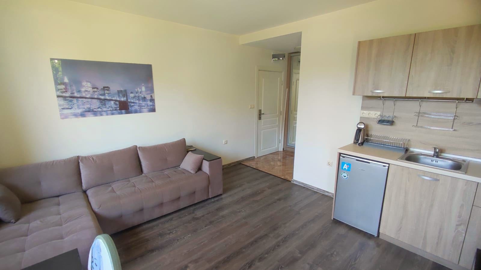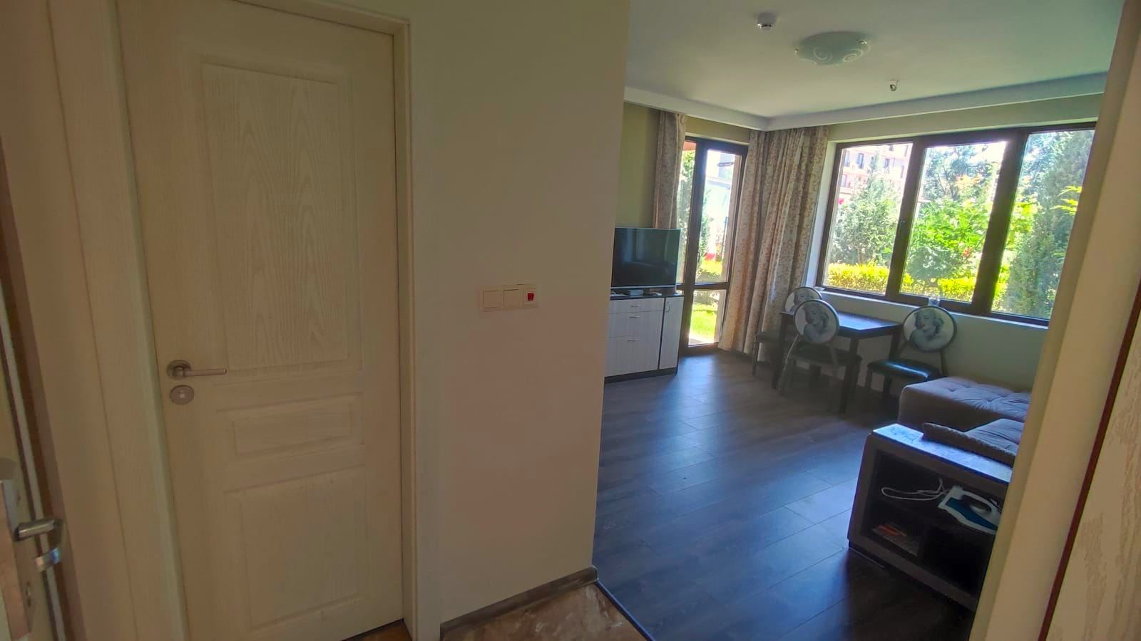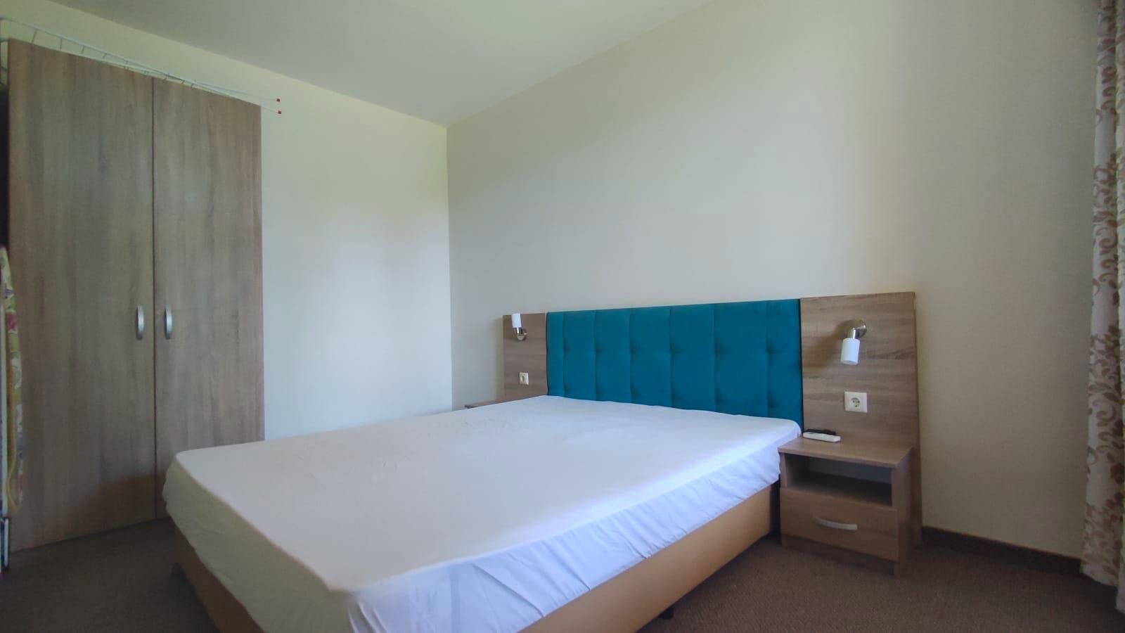 One-bedroom flat in a magnificent complex located 500 metres from the beach. The flat with a total floor area of 65 m2 is located on the ground floor of a low rise building and has an excellent floor plan. The flat is fully furnished and equipped with all white goods. It consists of an entrance hall, living room with kitchen area, a separate bedroom, a bathroom with shower unit and a big veranda with an exit to the private fenced yard. The complex is one of the most beautiful and elegant in Sunny Beach. It is located in the green part of the resort and has a great area with internal infrastructure.