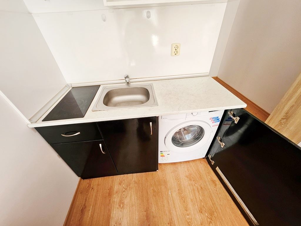 The studio features a practical layout: a spacious open-plan room with defined areas for a living and kitchenette, a bathroom with toilet, and a convenient balcony – perfect for morning coffee or afternoon relaxation. Its compact size allows easy furnishing without compromising on comfort, while the building’s elevator ensures convenient access.