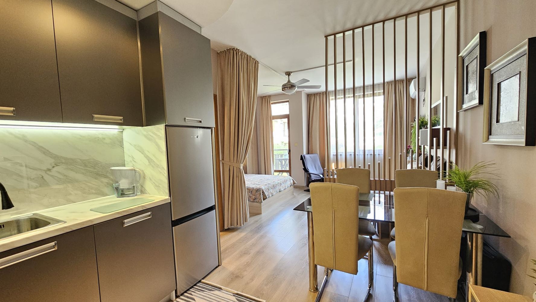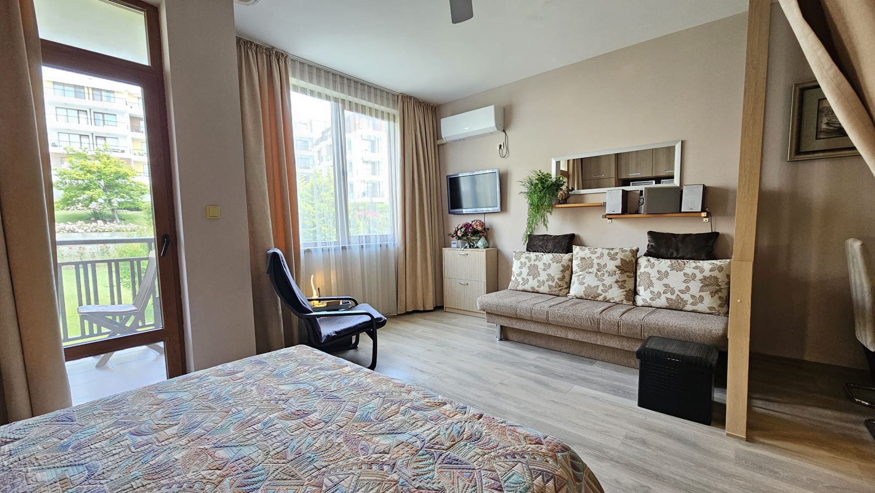 The architecture is inspired by the traditional Thracian style, combining tiled roofs with elements of wood and stone. It is surrounded by coniferous and deciduous forest, providing a unique microclimate and freshness. On its territory you will find seven outdoor swimming pools, one indoor pool, and for sports lovers - two tennis courts and a fully equipped gym. The complex also has three restaurants, aqua bars, a beauty and hair salon, sauna and solarium, providing everything you need for your relaxation and pleasure. For your convenience, a supermarket, currency exchange, internet room and parking are also available. A small jetty on the shore allows for sea adventures and walks. The complex also provides its own beach which is directly accessible to the property owners.
