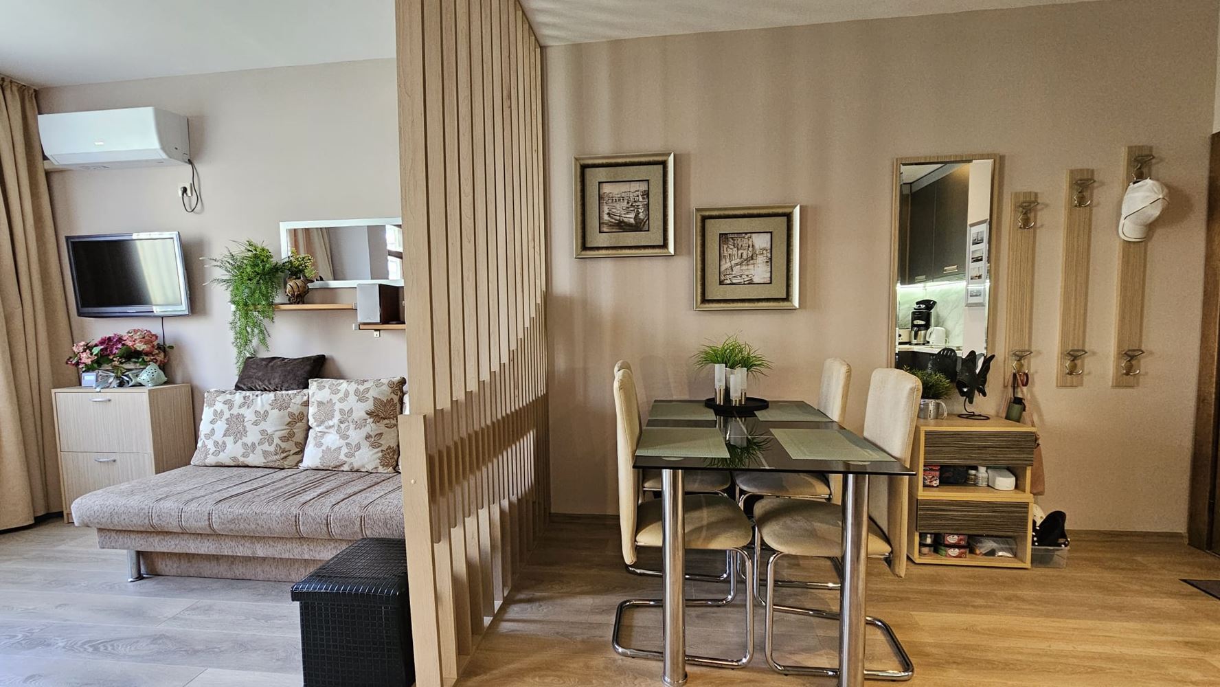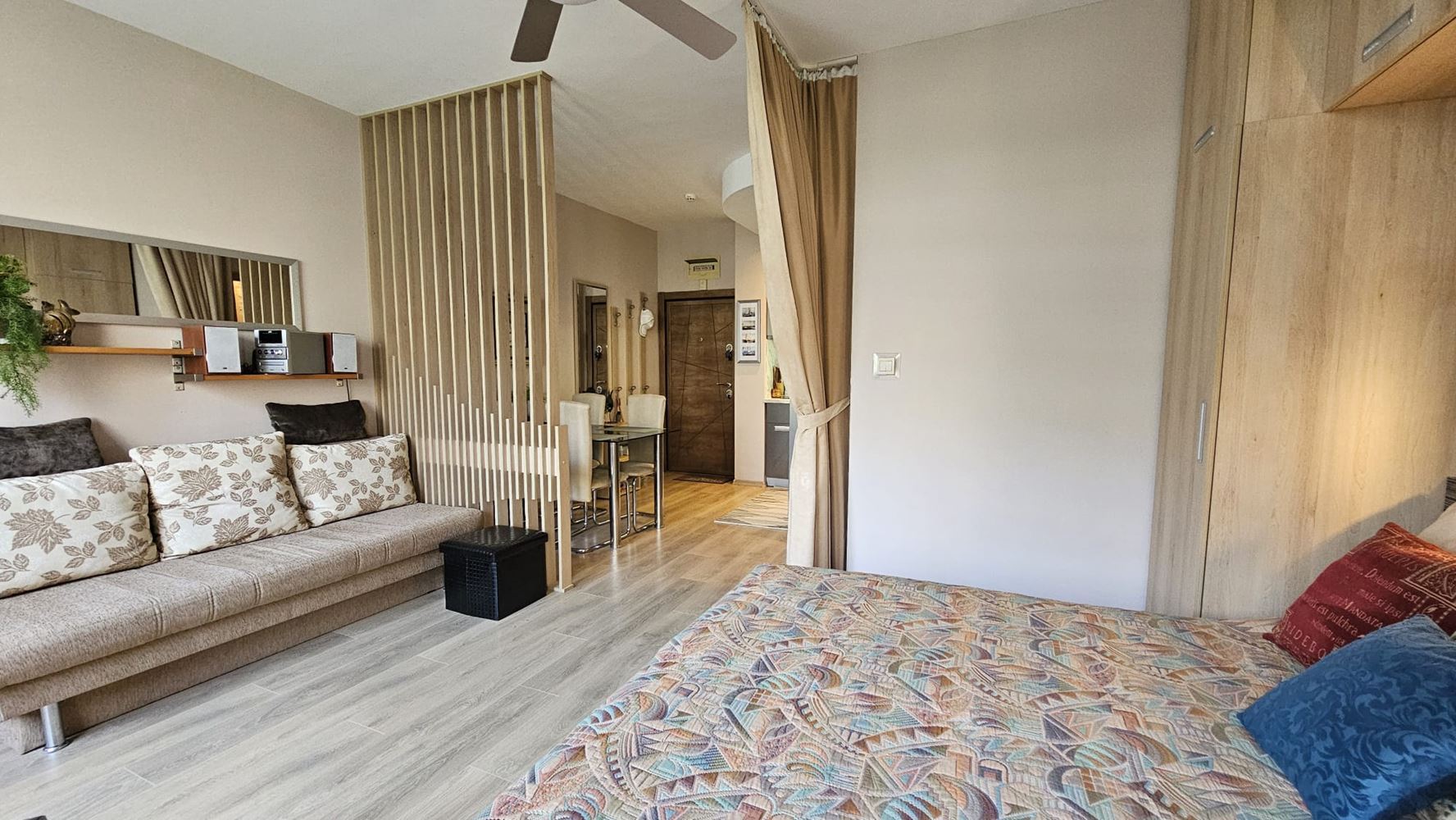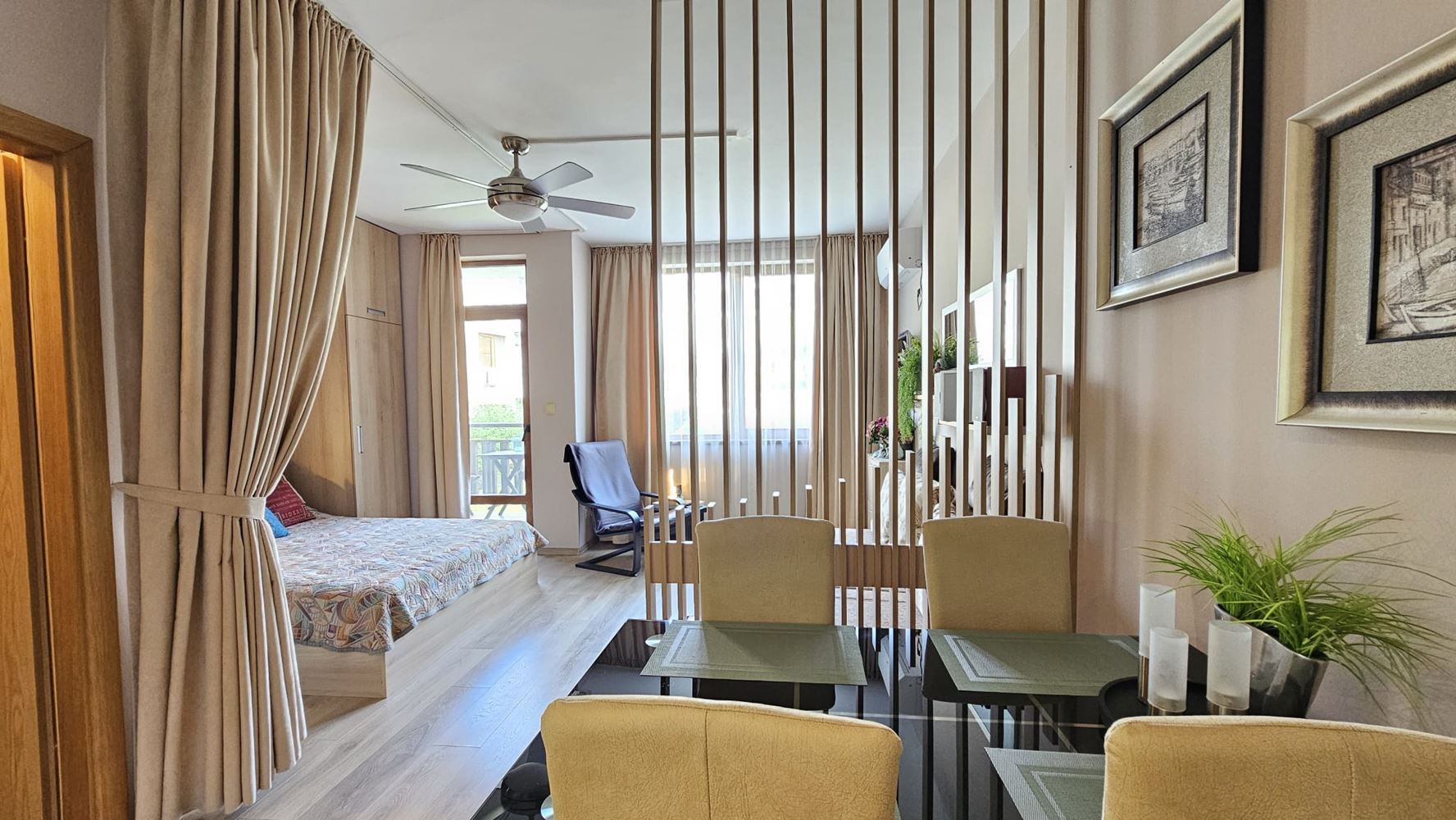 For sale is a stylish studio in a luxury complex located on the first line of the sea in the popular resort of Sveti Vlas. With a total area of 44,70 m², this cozy apartment is located on the third floor and offers the convenience of an elevator for easy access. The studio is fully furnished and consists of one spacious room that combines kitchen, dining area and relaxation area. The apartment has a bathroom and a cozy balcony from which you can enjoy the fresh sea air and beautiful mountain and sea views.