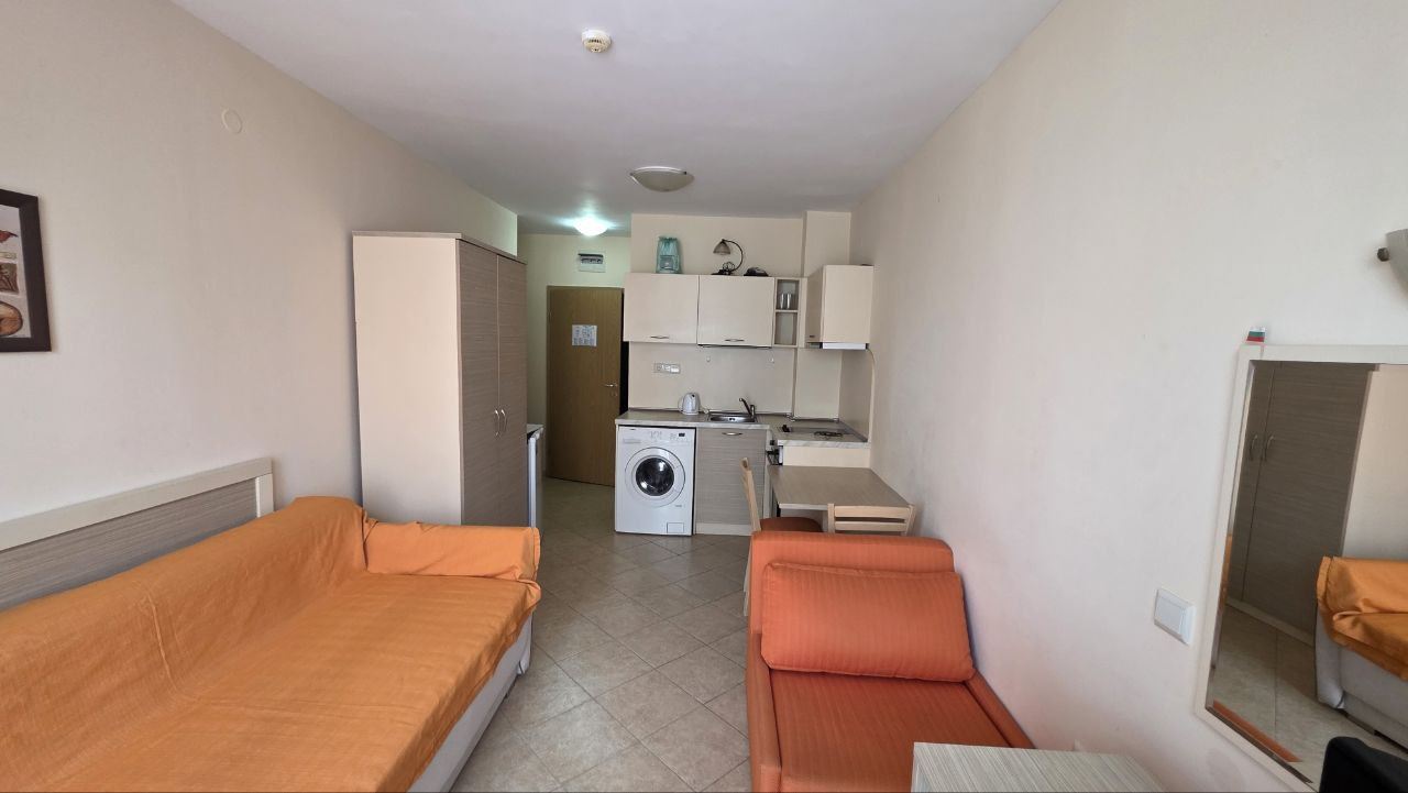 We present a compact and functional property, ideal as a holiday home or an investment with excellent rental potential. The studio is located in a prestigious complex in the heart of Sunny Beach, surrounded by beautiful landscaped areas and just steps away from the resort’s vibrant life. With a total area of 31 m², the property is situated on the fourth floor and easily accessible by elevator. The layout is maximally convenient: an entrance hall, a stylish living room with a kitchenette and a designated sleeping area, as well as a bathroom with modern amenities. The absence of a balcony is compensated by the layout and bright interior solutions, creating a sense of space and comfort. The property is sold fully furnished and equipped – ready for immediate occupancy or rental. The selected furniture and appliances provide practicality, and the neutral color scheme allows easy personalization according to the future owner’s taste.